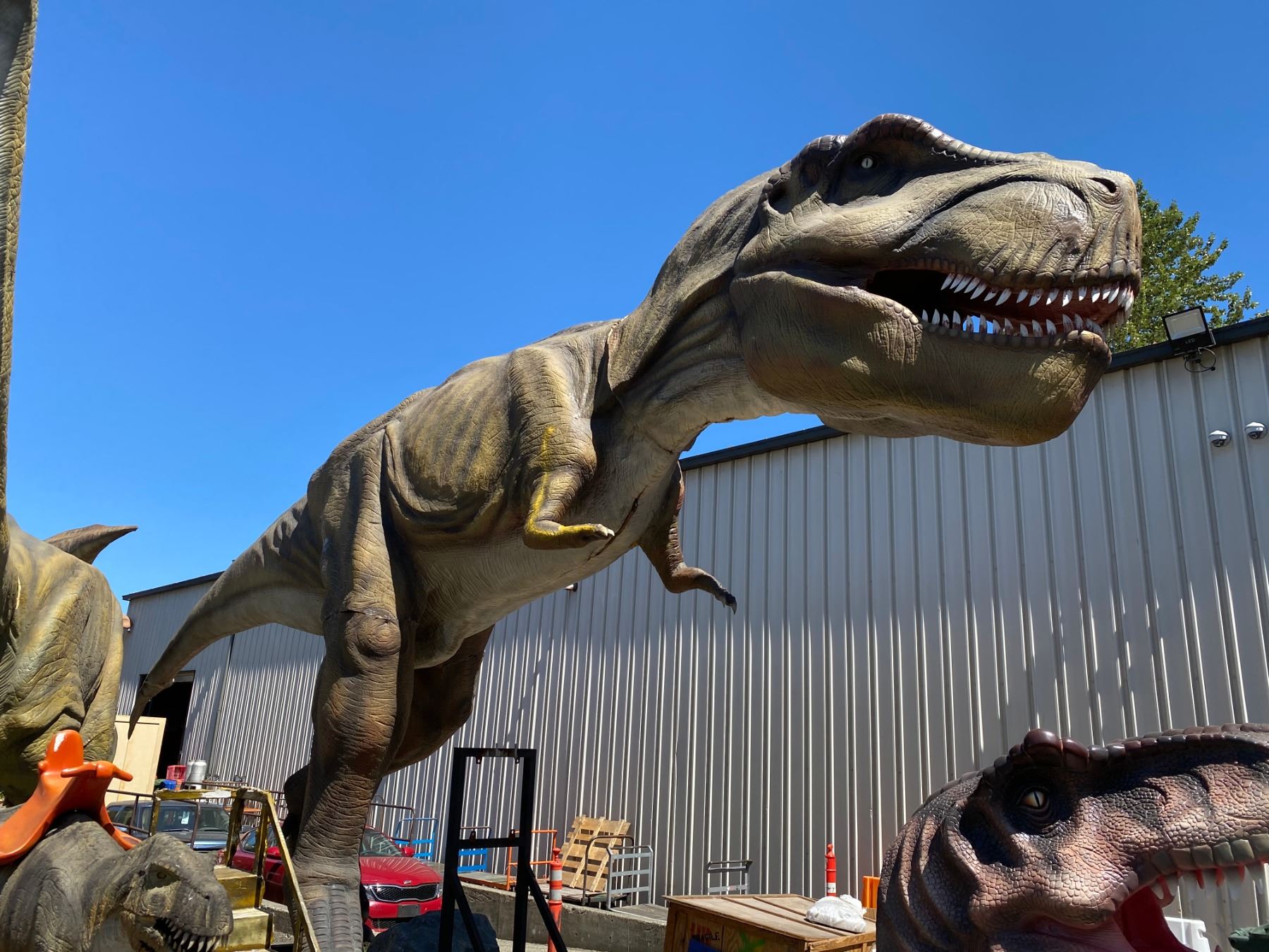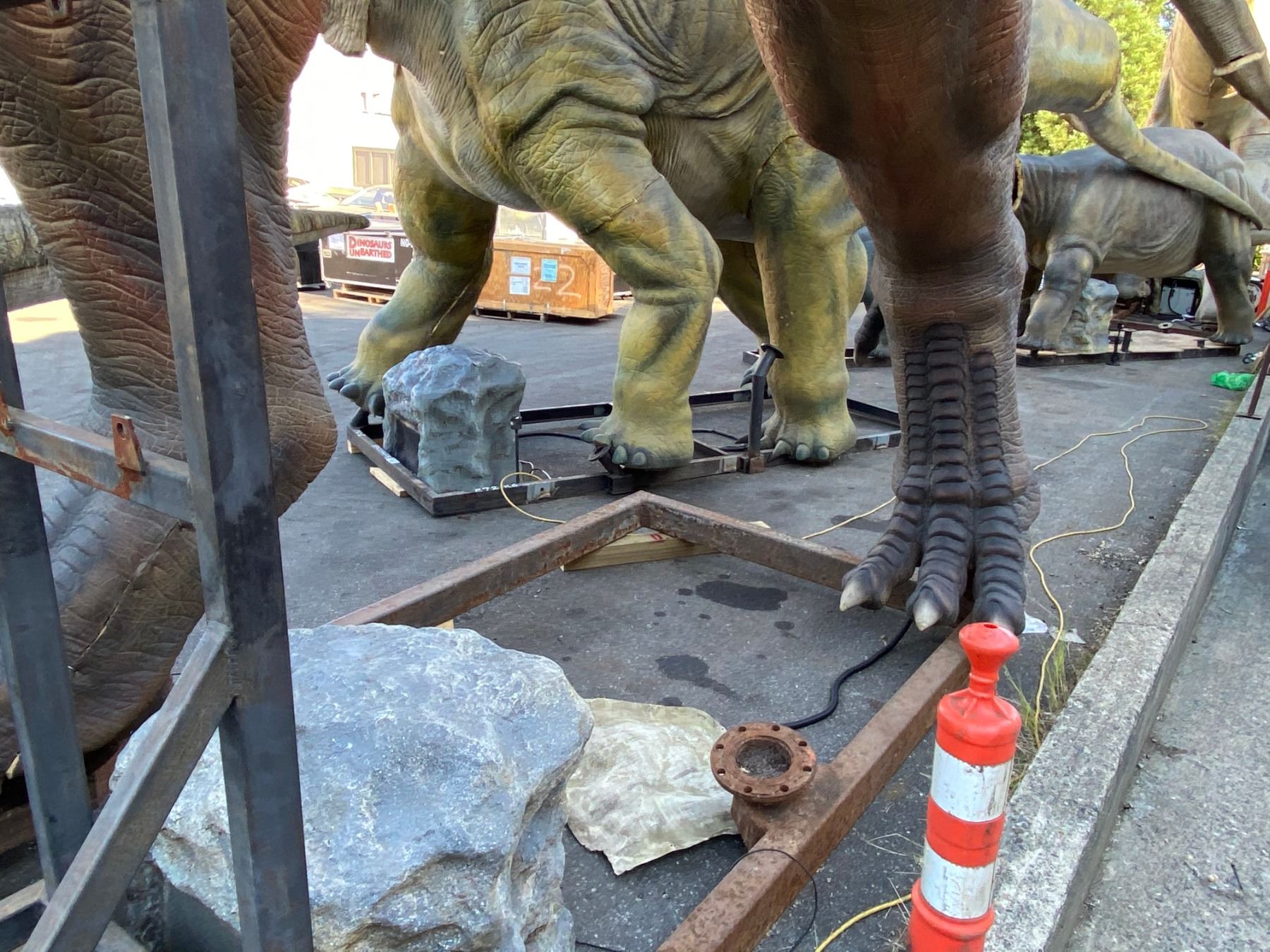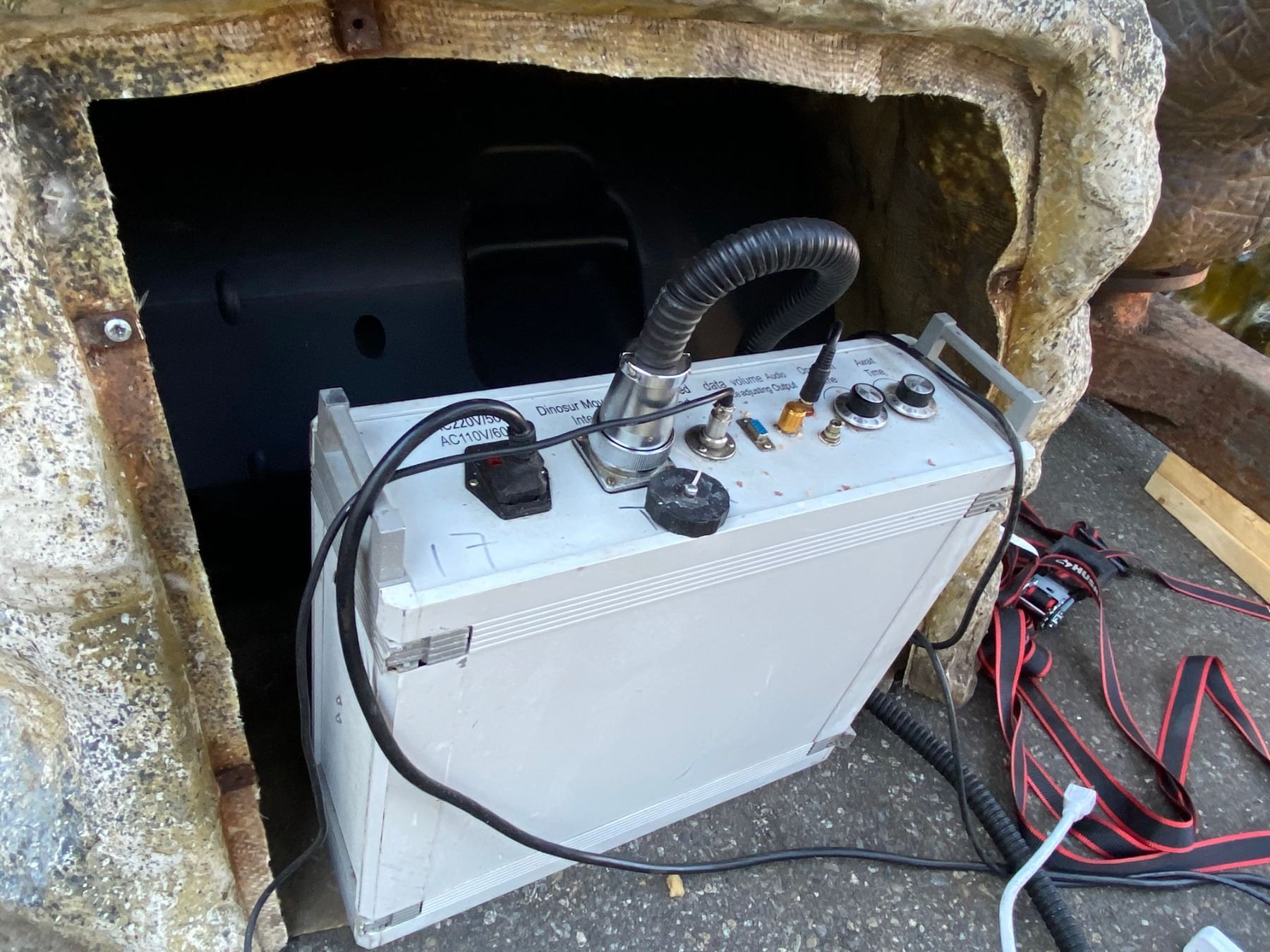 ANIMATRONIC TYRANNOSAURUS REX CRETATIOUS PERIOD DINOSAUR LAST KNOW TYRANNOSAURIDS LIVED IN NORTH AMERICA 66 MILLION YEARS AGO MEASURES 552" LONG X 100" WIDE X 219" TALL. APPROX. WEIGHT 1452 KG. LEGS & HEAD REMOVES FOR SHIPPING, C/W CUSTOM CONTROLLER, SPEAKER, MOTION SENSOR, COVER ROCK & ALL REQUIRED WIRING APPROX 3201LBS