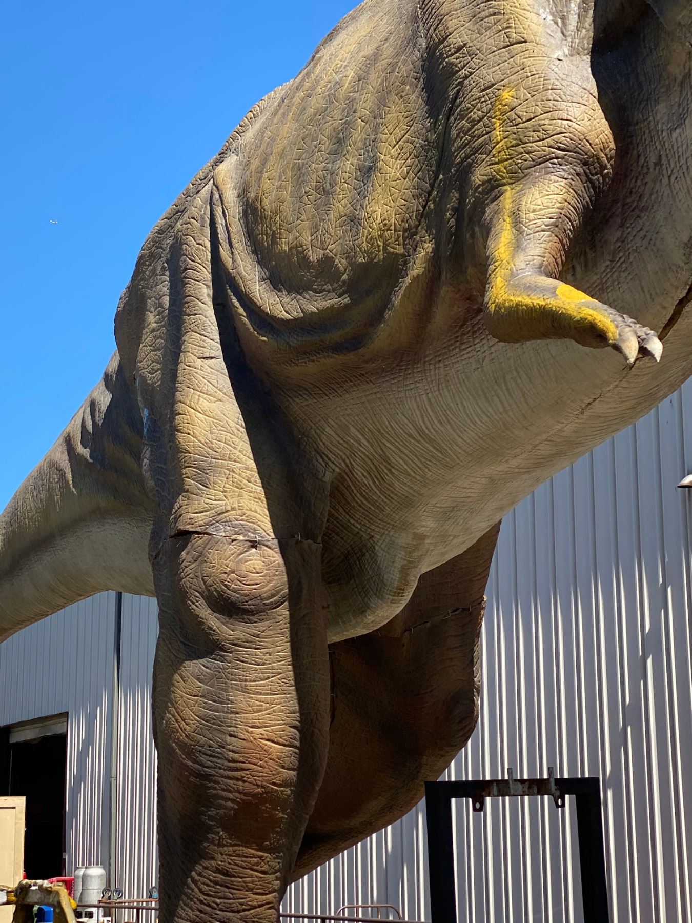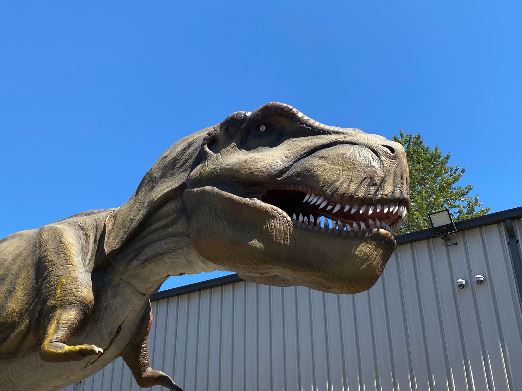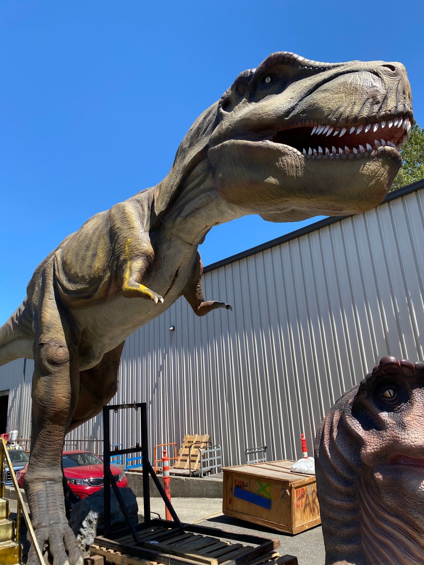 ANIMATRONIC TYRANNOSAURUS REX CRETATIOUS PERIOD DINOSAUR LAST KNOW TYRANNOSAURIDS LIVED IN NORTH AMERICA 66 MILLION YEARS AGO MEASURES 552" LONG X 100" WIDE X 219" TALL. APPROX. WEIGHT 1452 KG. LEGS & HEAD REMOVES FOR SHIPPING, C/W CUSTOM CONTROLLER, SPEAKER, MOTION SENSOR, COVER ROCK & ALL REQUIRED WIRING APPROX 3201LBS