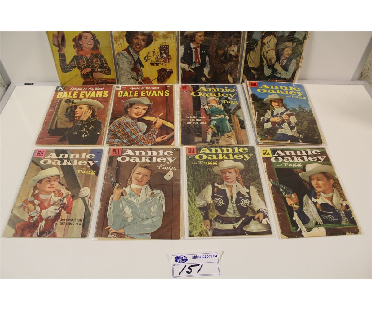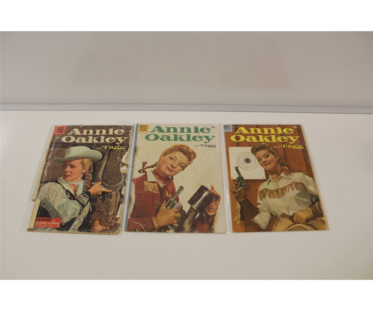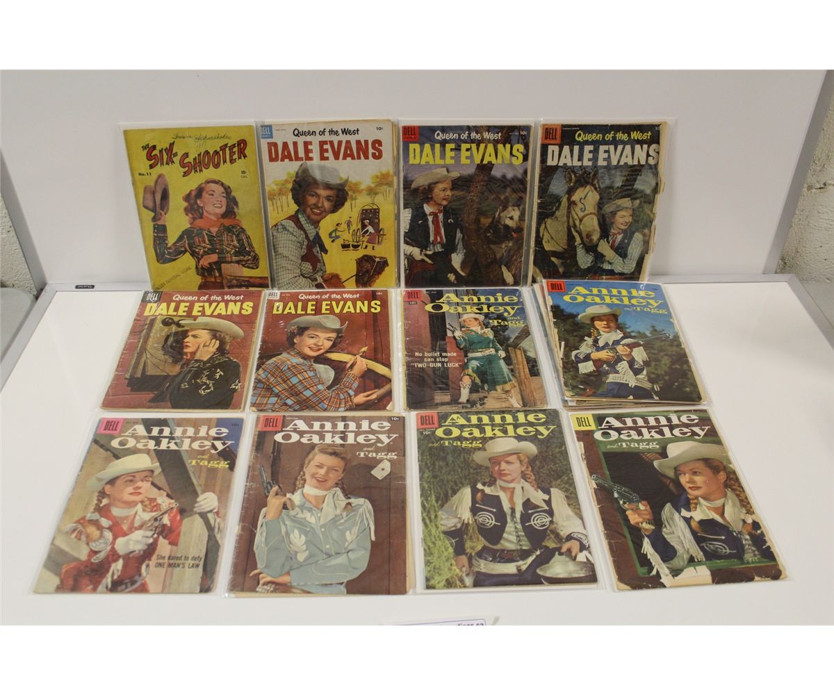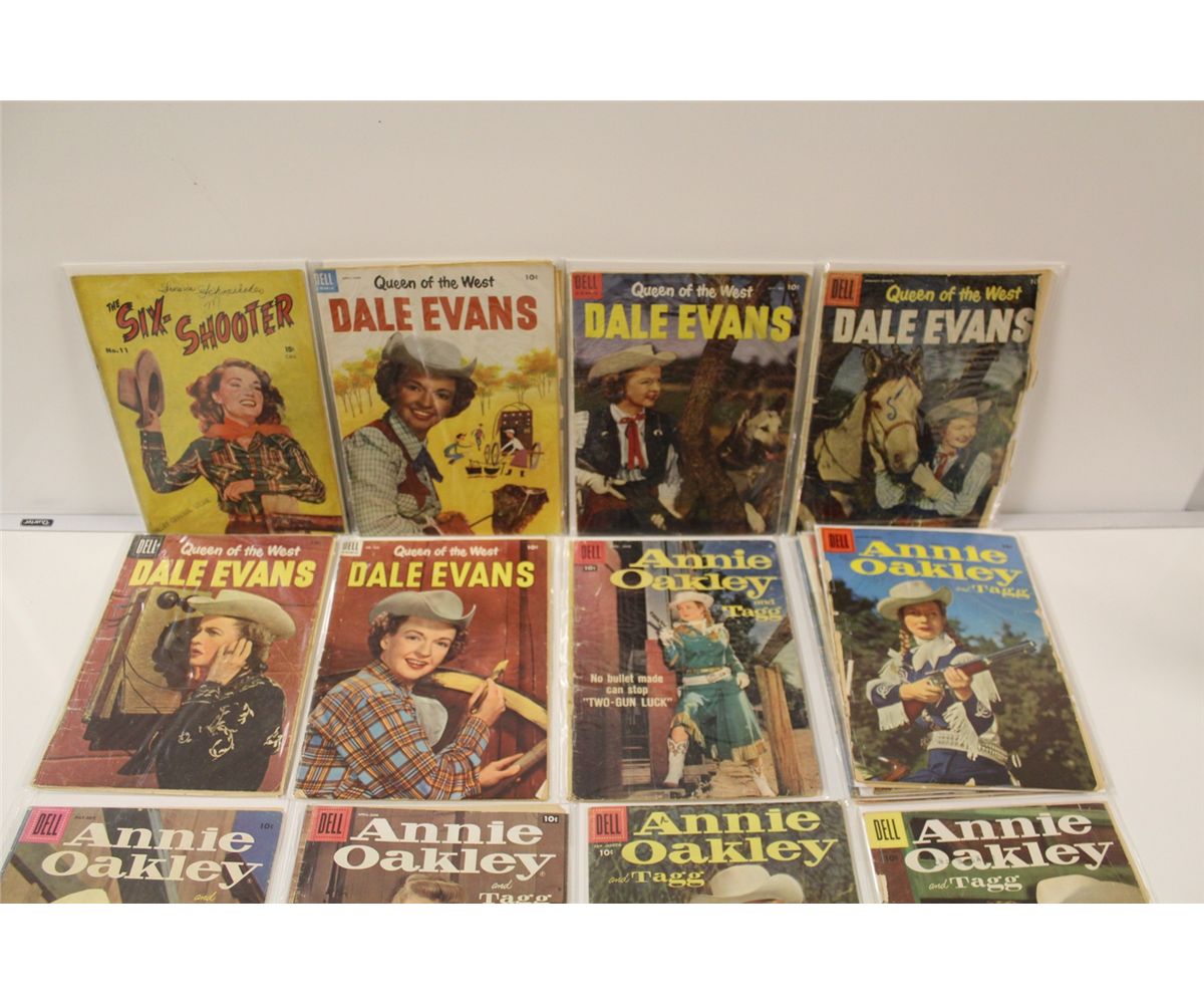 ANNIE OAKLEY #4-15 & 575(1950'S) 9 BOOKS IN LOW GRADE AVERAGE, PLUS DALE EVANS #3-528 (1953 SERIES)5 BOOKS IN LOW GRADE PLUS SIX-SHOOTER NO.11. 15 WESTERN DELL COMICS TOTAL.