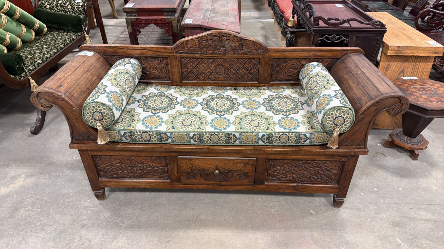 ANTIQUE CARVED WOODEN BENCH SEAT WITH DRAWER