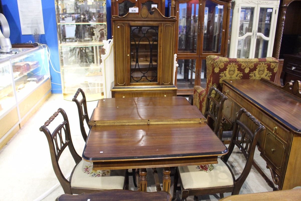 ANTIQUE DINING ROOM SUITE; TABLE, 2 LEAFS, 4 CHAIRS, SIDEBOARD AND CHINA CABINET