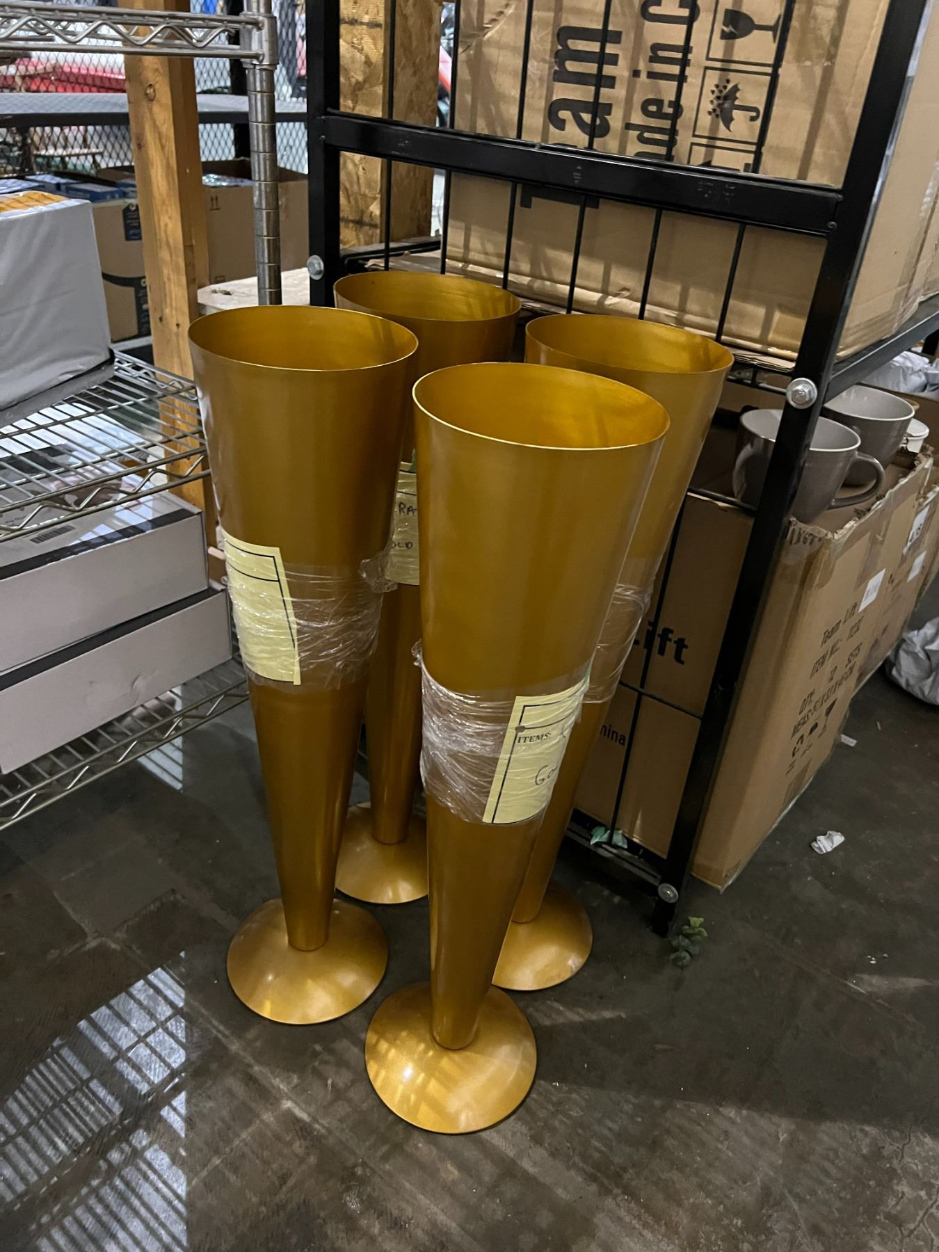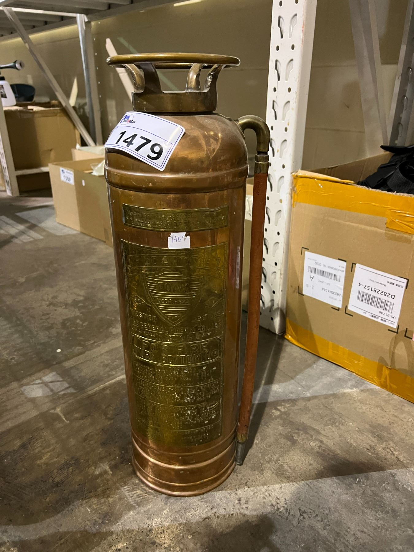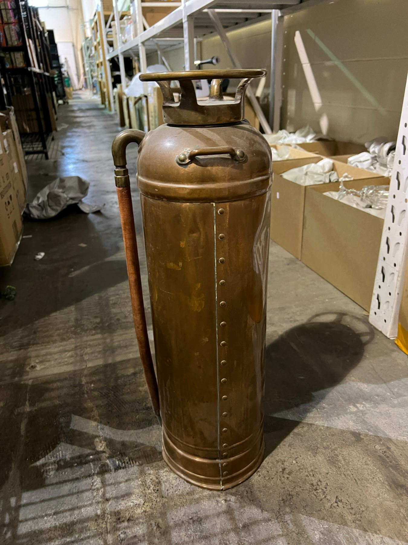 ANTIQUE FIRE EXTINGUISHER AND 4 METAL VASES