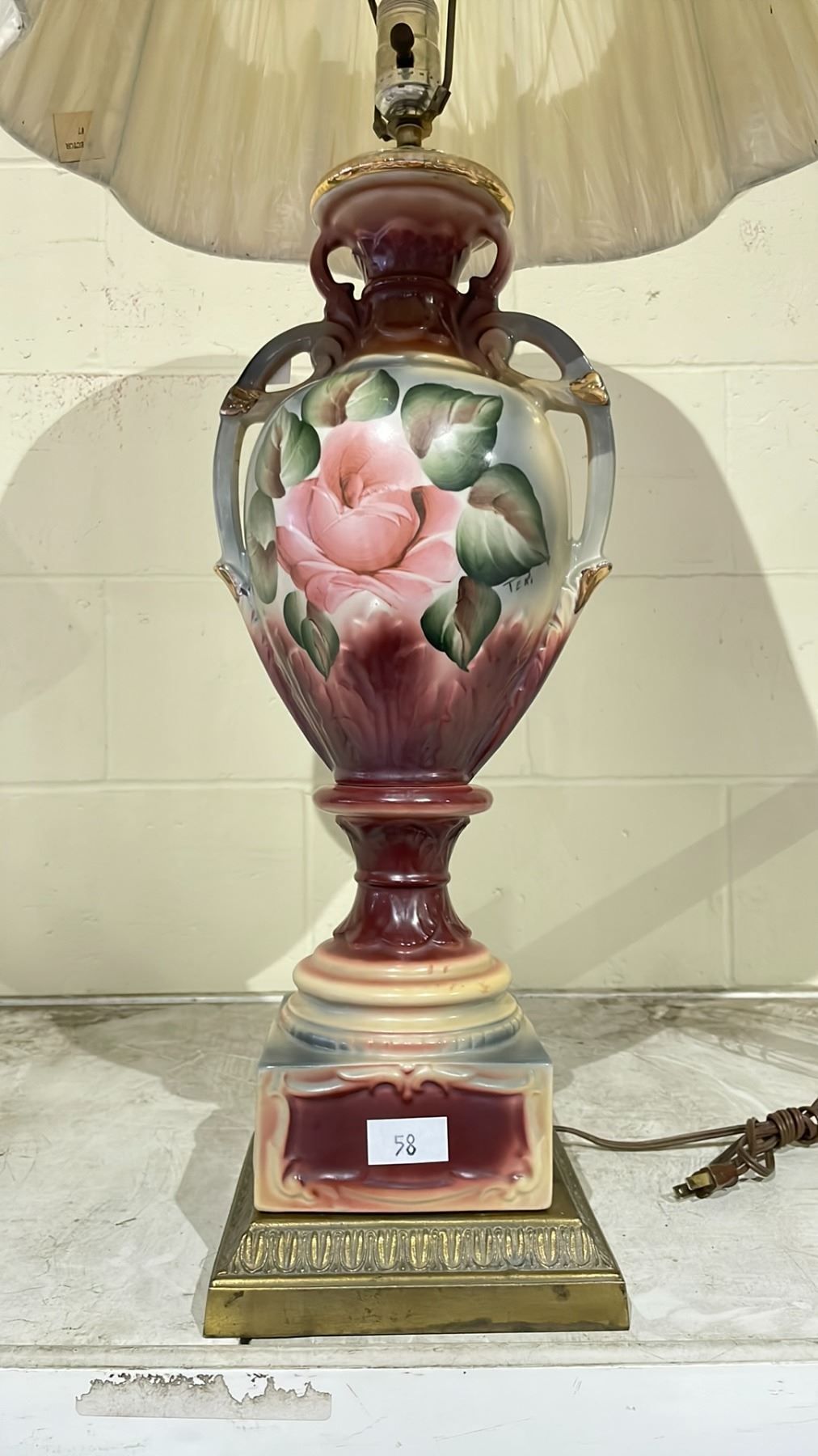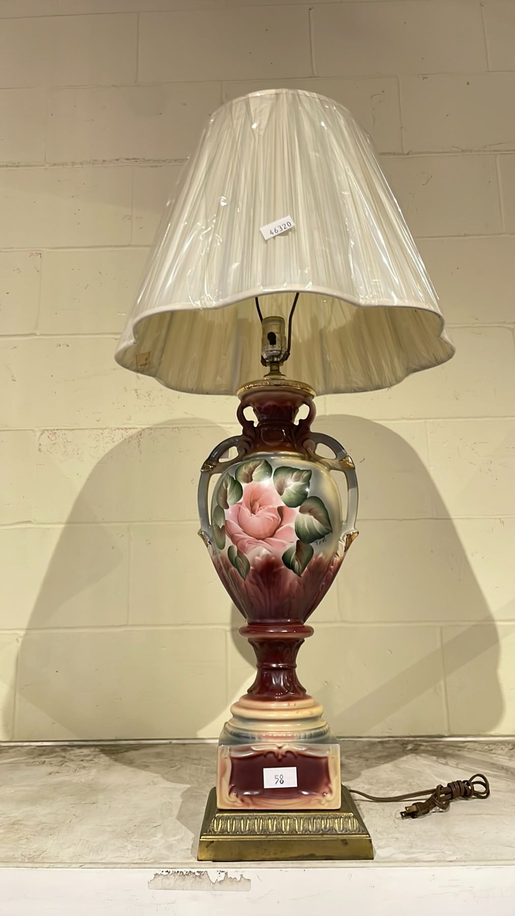 ANTIQUE FLORAL MOTIF HAND PAINTED TABLE LAMP WITH SHADE APPROX 40" TALL