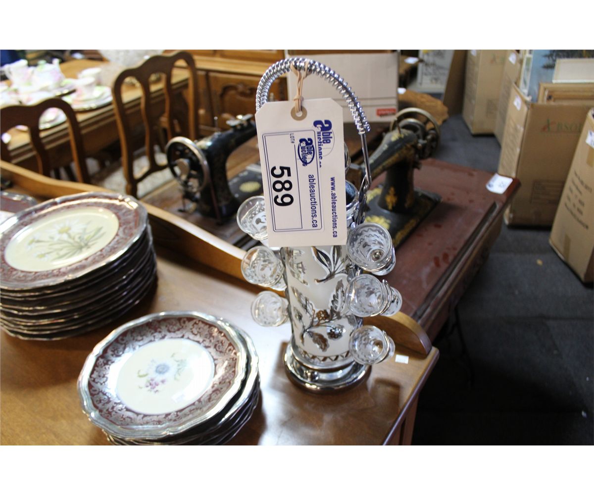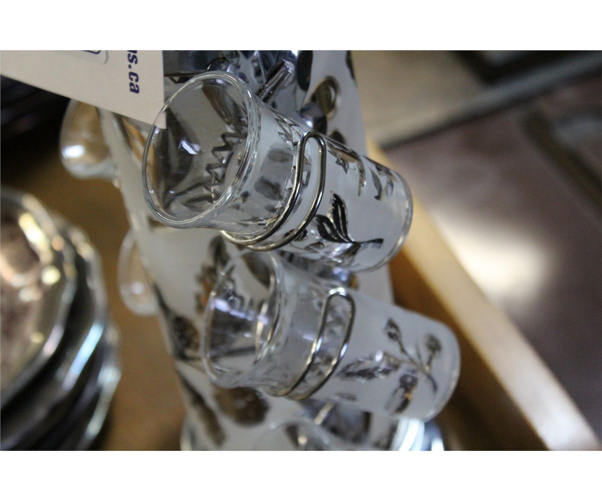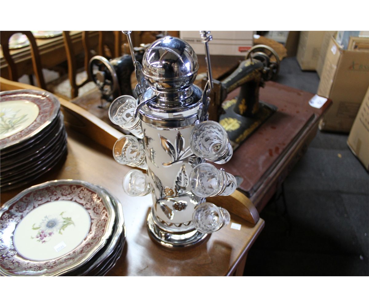 ANTIQUE GLASS COCKTAIL SHAKER WITH 6 SHOT GLASSES