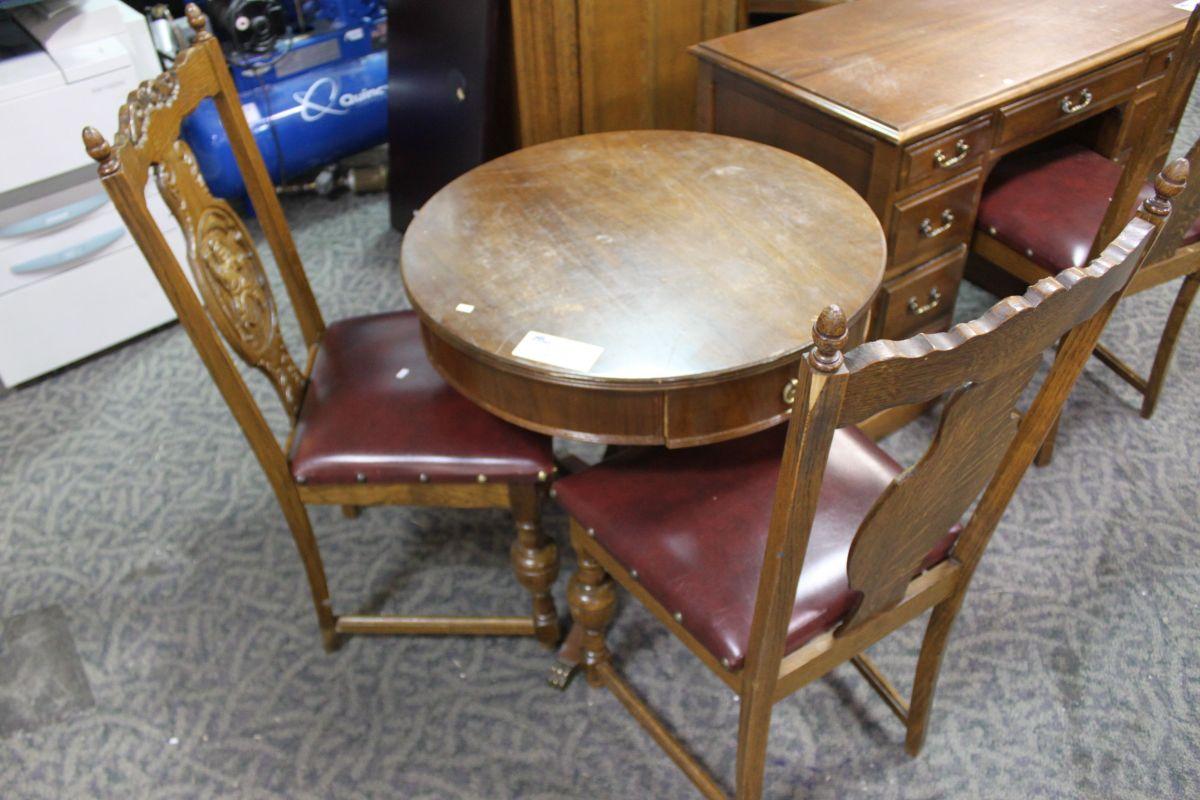 ANTIQUE HALL TABLE WITH 3 LEATHER SEAT CHAIRS