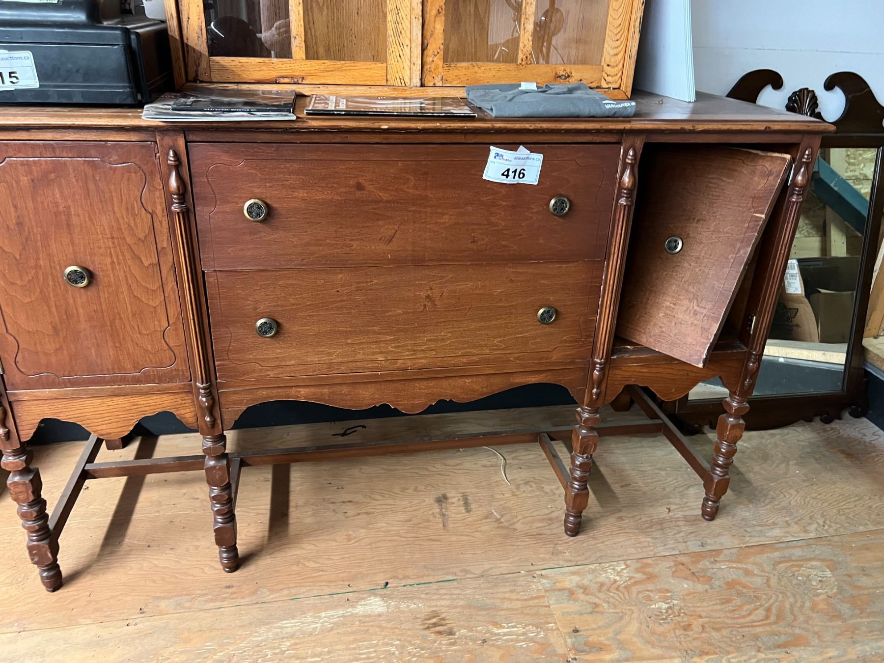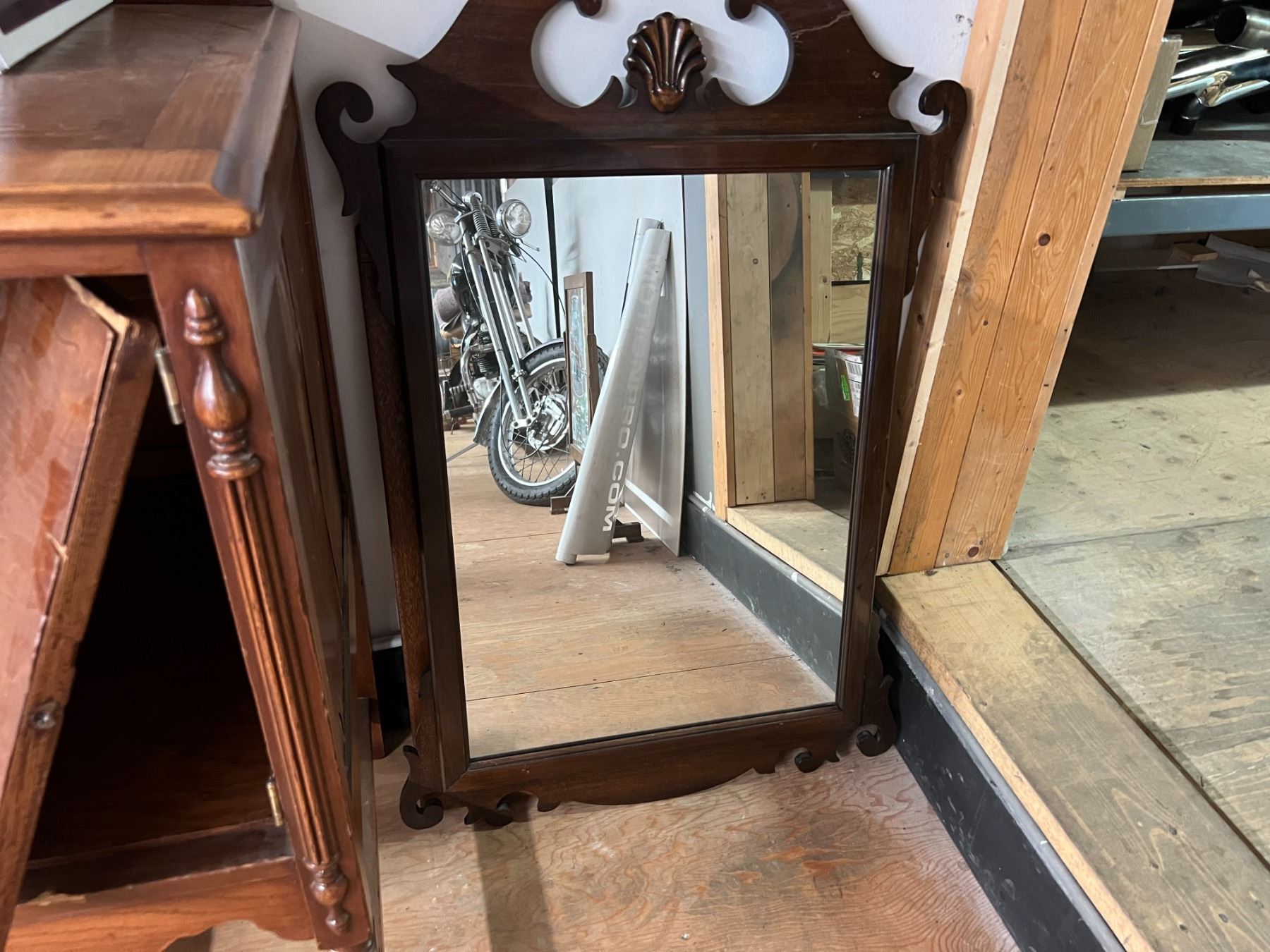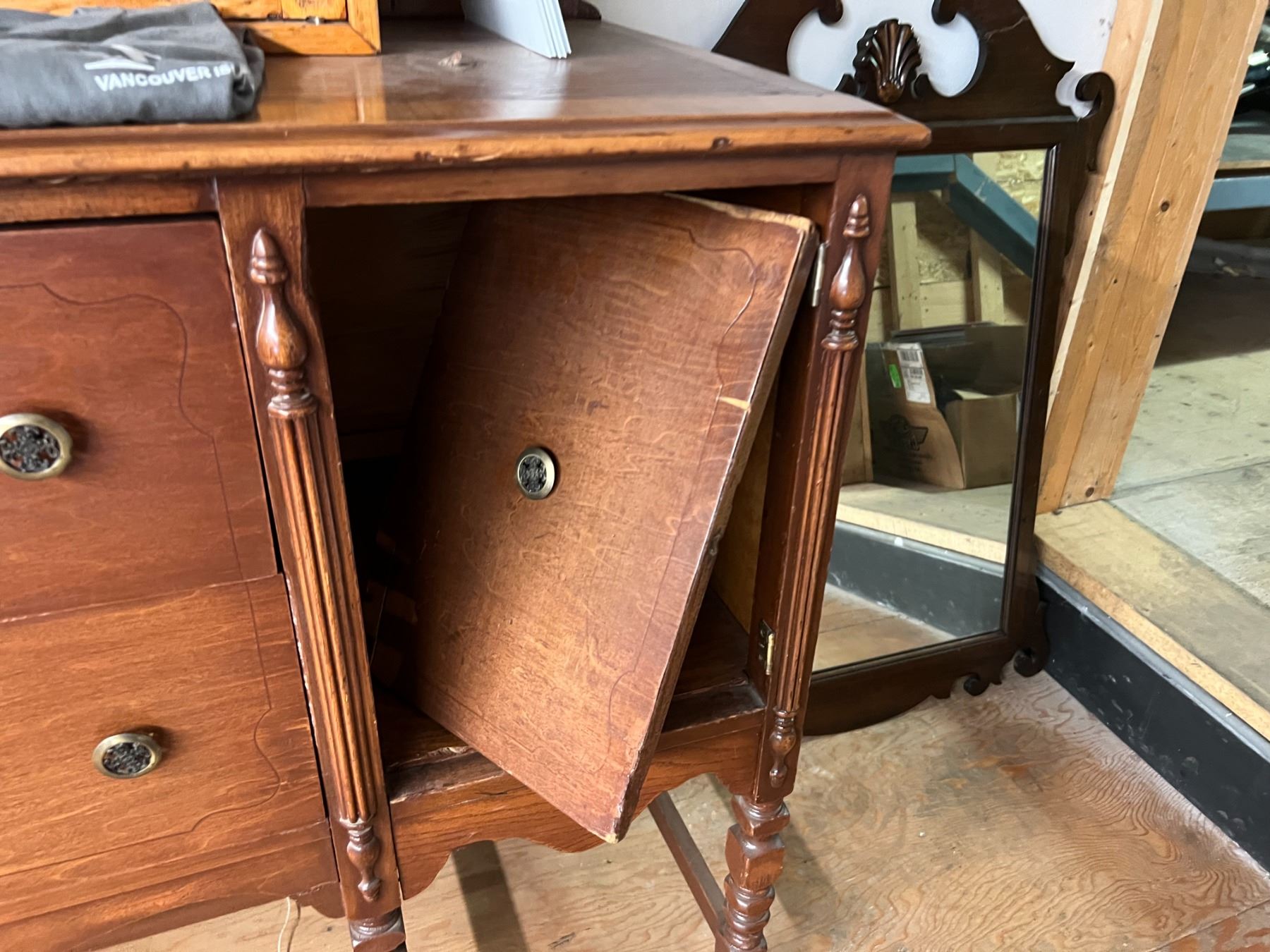 ANTIQUE HUTCH (DAMAGED DOOR BUT COMPLETE) & MIRROR