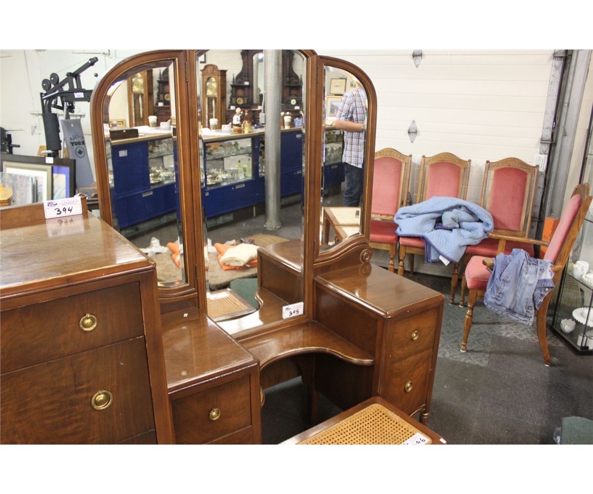 ANTIQUE MAKE UP TABLE WITH TRI MIRROR - 2 DRAWERS EACH SIDE