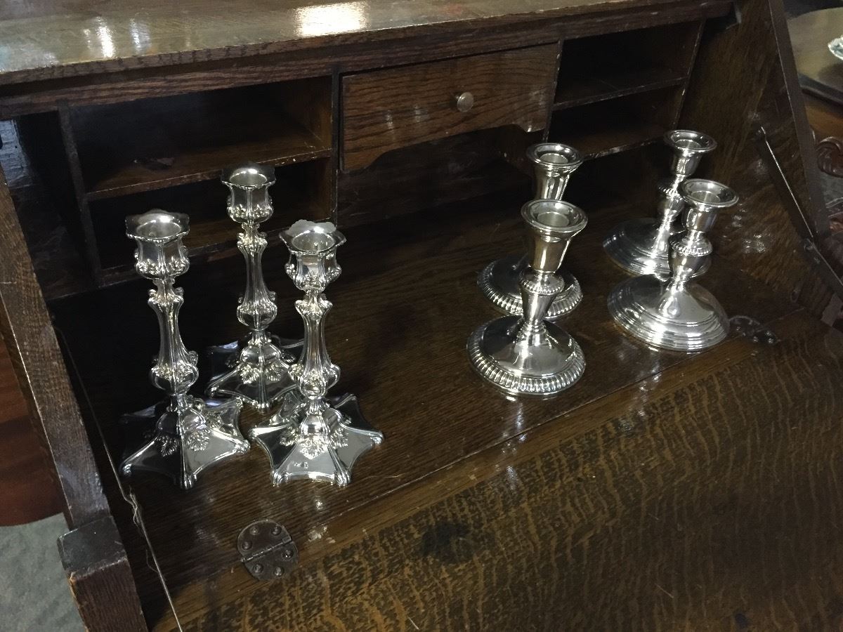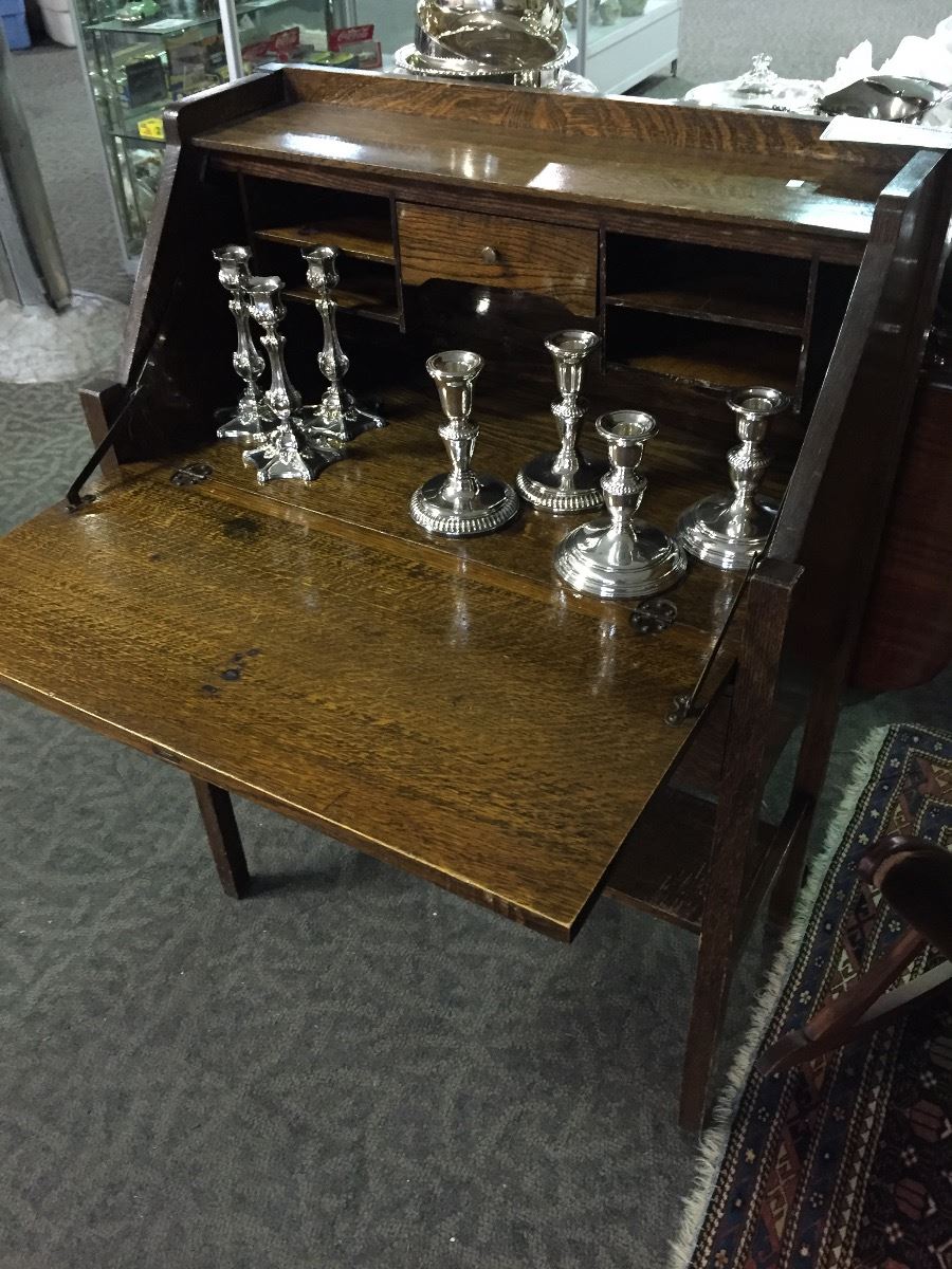 ANTIQUE OAK DROP TOP DESK AND SILVER PLATED CANDLE HOLDERS