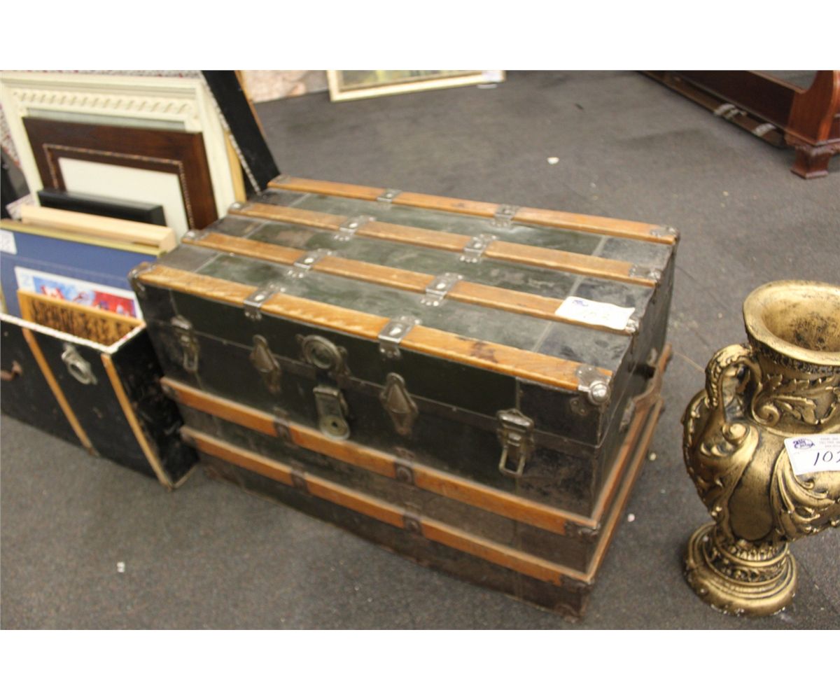 ANTIQUE  STEAMER TRUNK - BLACK WITH WOOD
