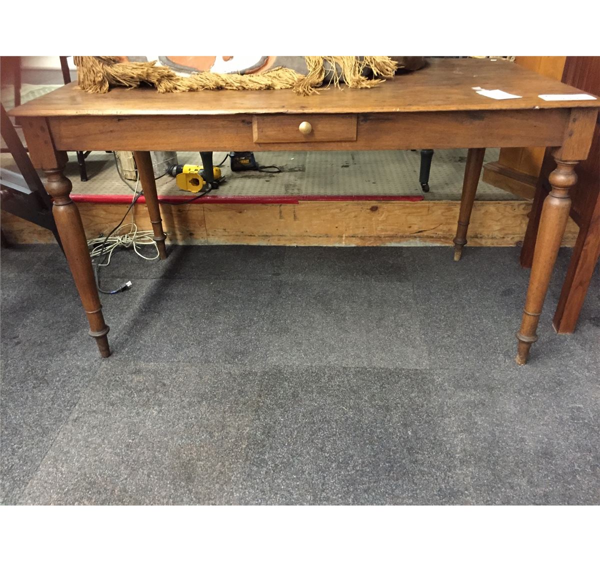 ANTIQUE TEAK WOOD, 2-PLANK TABLE WITH SINGLE DRAWER, ON VICTORIAN TURNED LEGS 49" W X 29" D X 28" H
