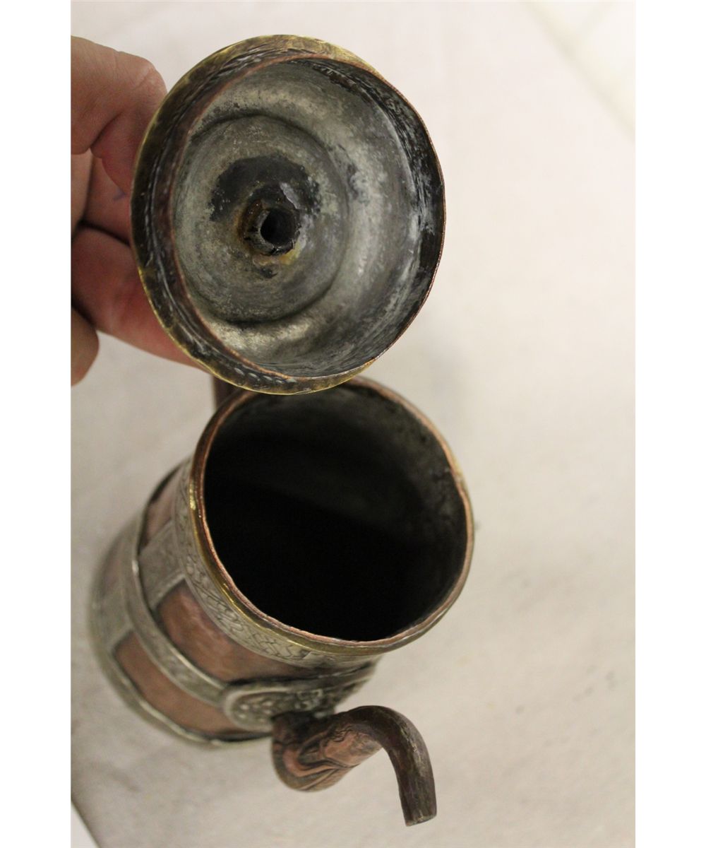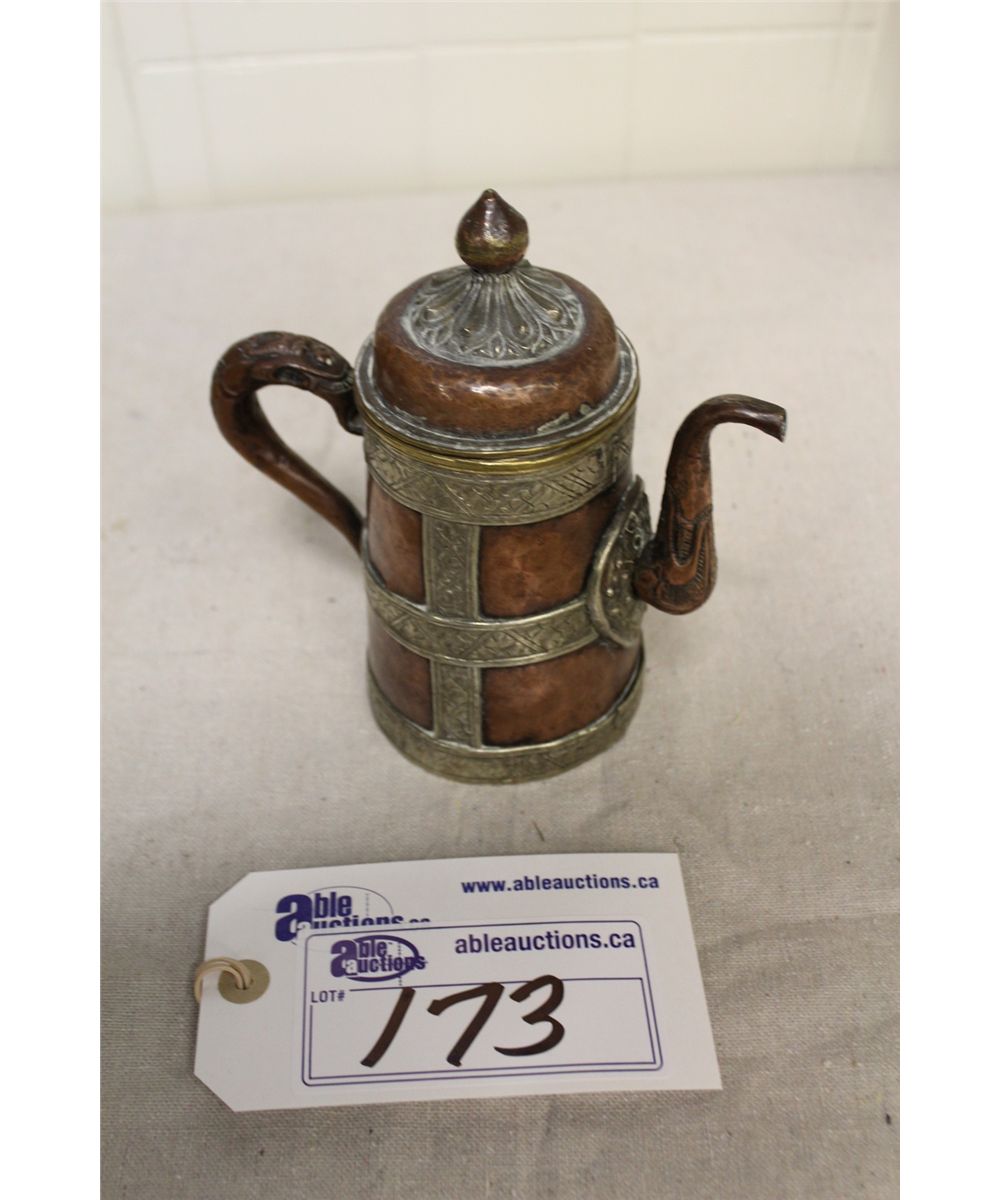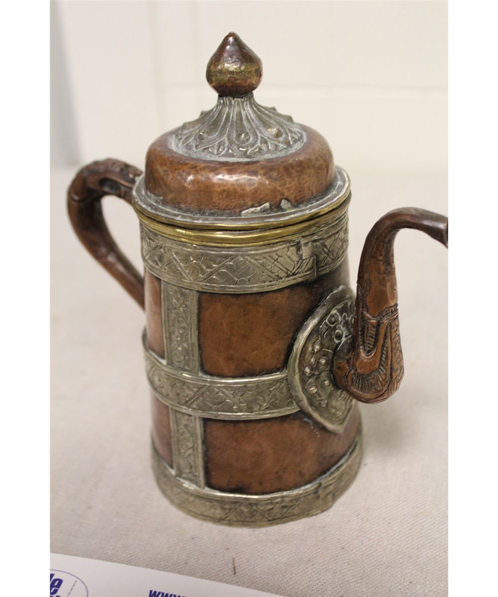 ANTIQUE TIBETAN COPPER AND METAL INLAID YAKBUTTER TEA POT 7 1/2" HIGH