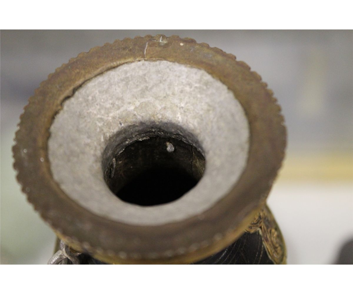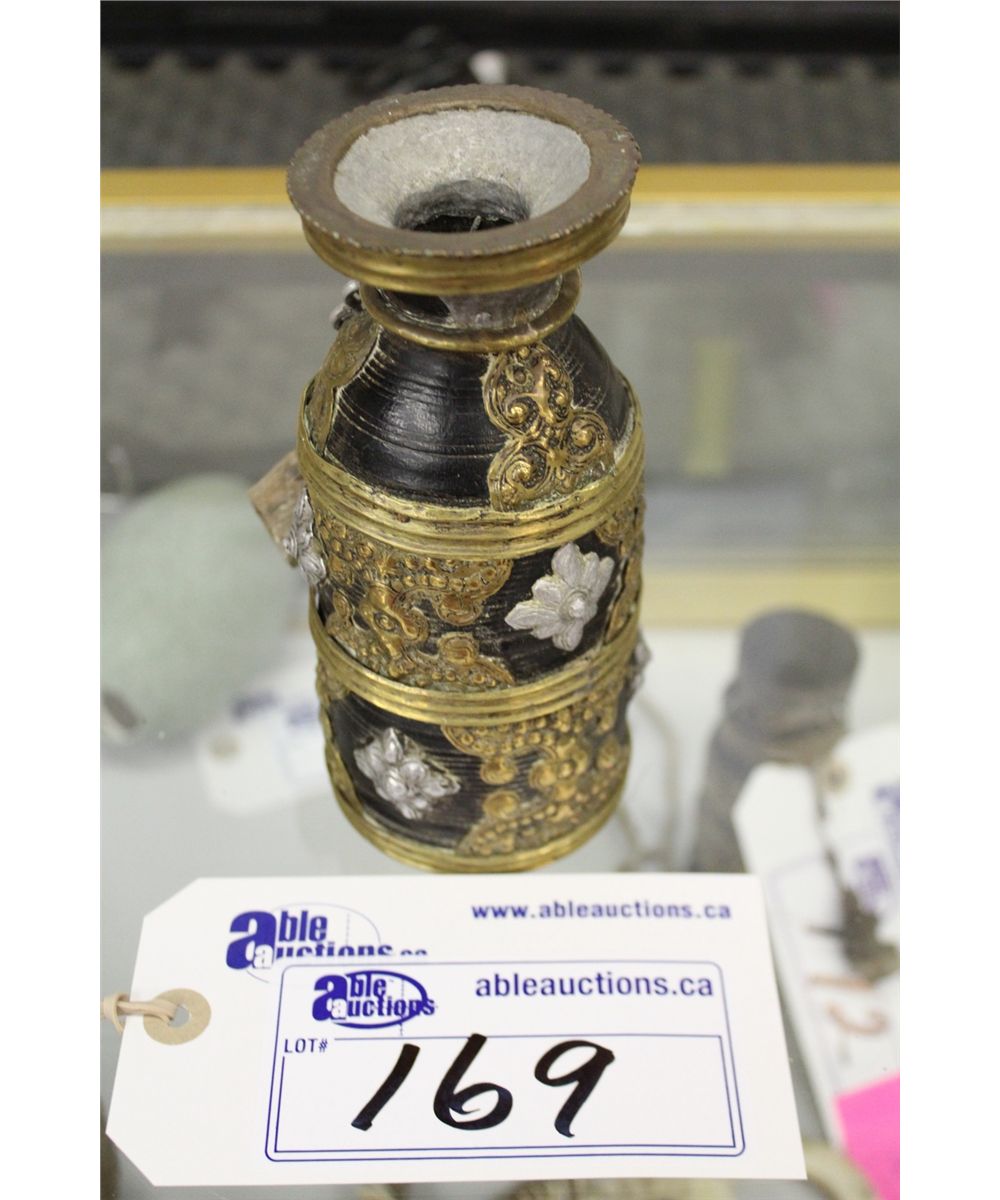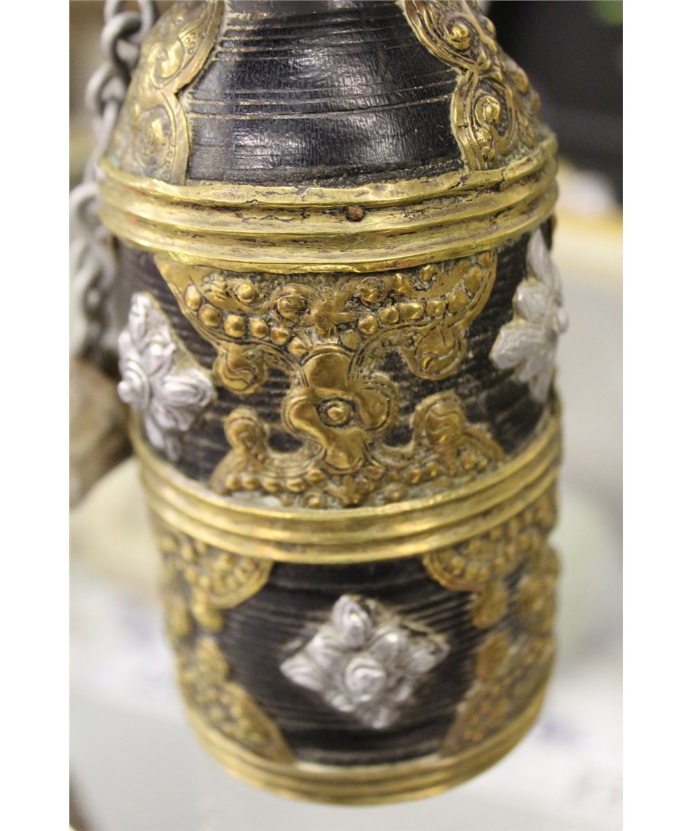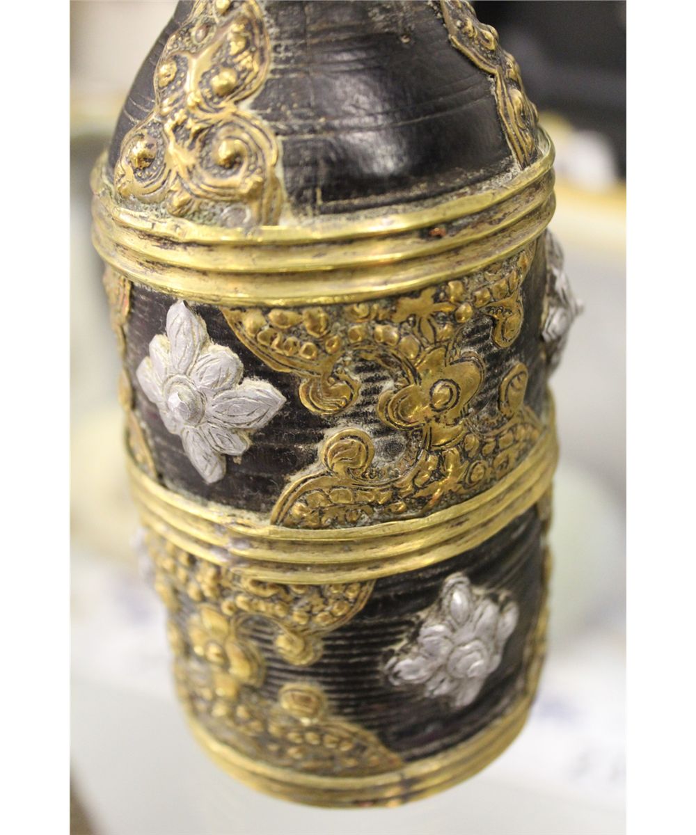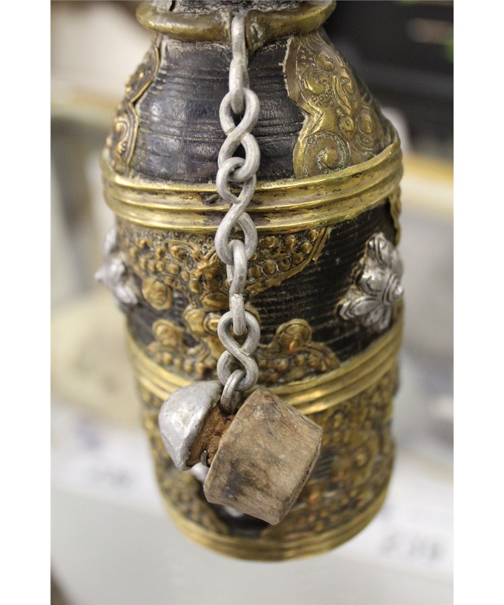 ANTIQUE TIBETAN PARTLY SILVER AND BRASS INLAID BEER JUG WITH TOP 6 1/2" HIGH