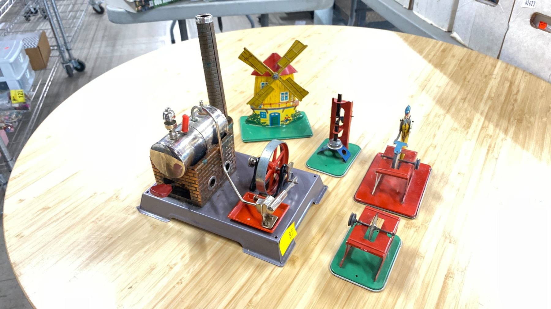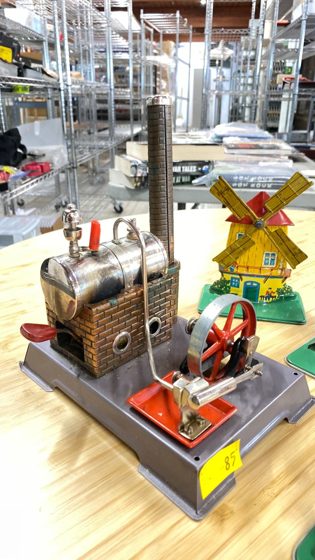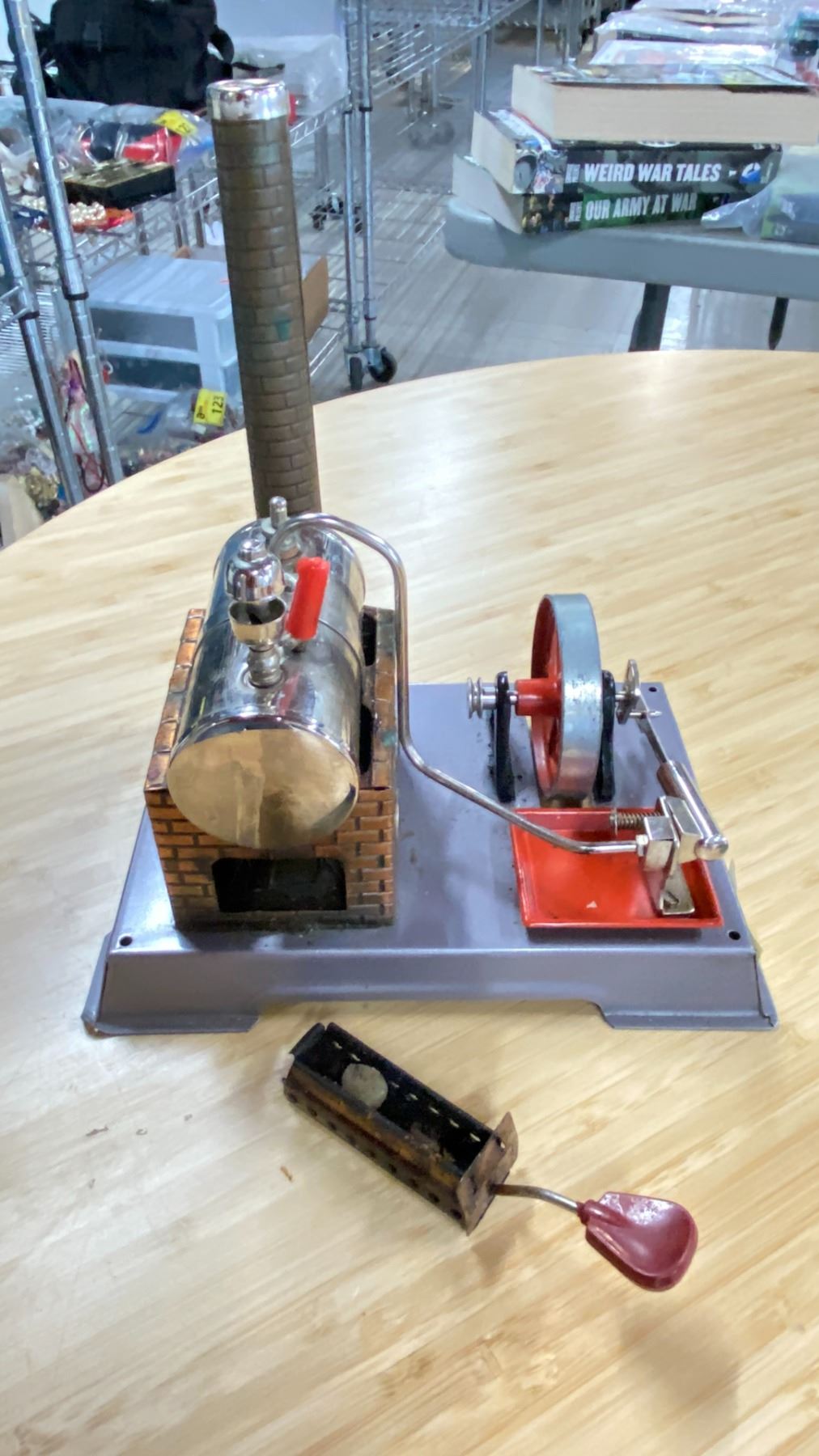 ANTIQUE TOY STEAM ENGINE (MADE IN GERMANY) WITH 4 TIN LITHOGRAPH STEAM TOY ACCESSORIES