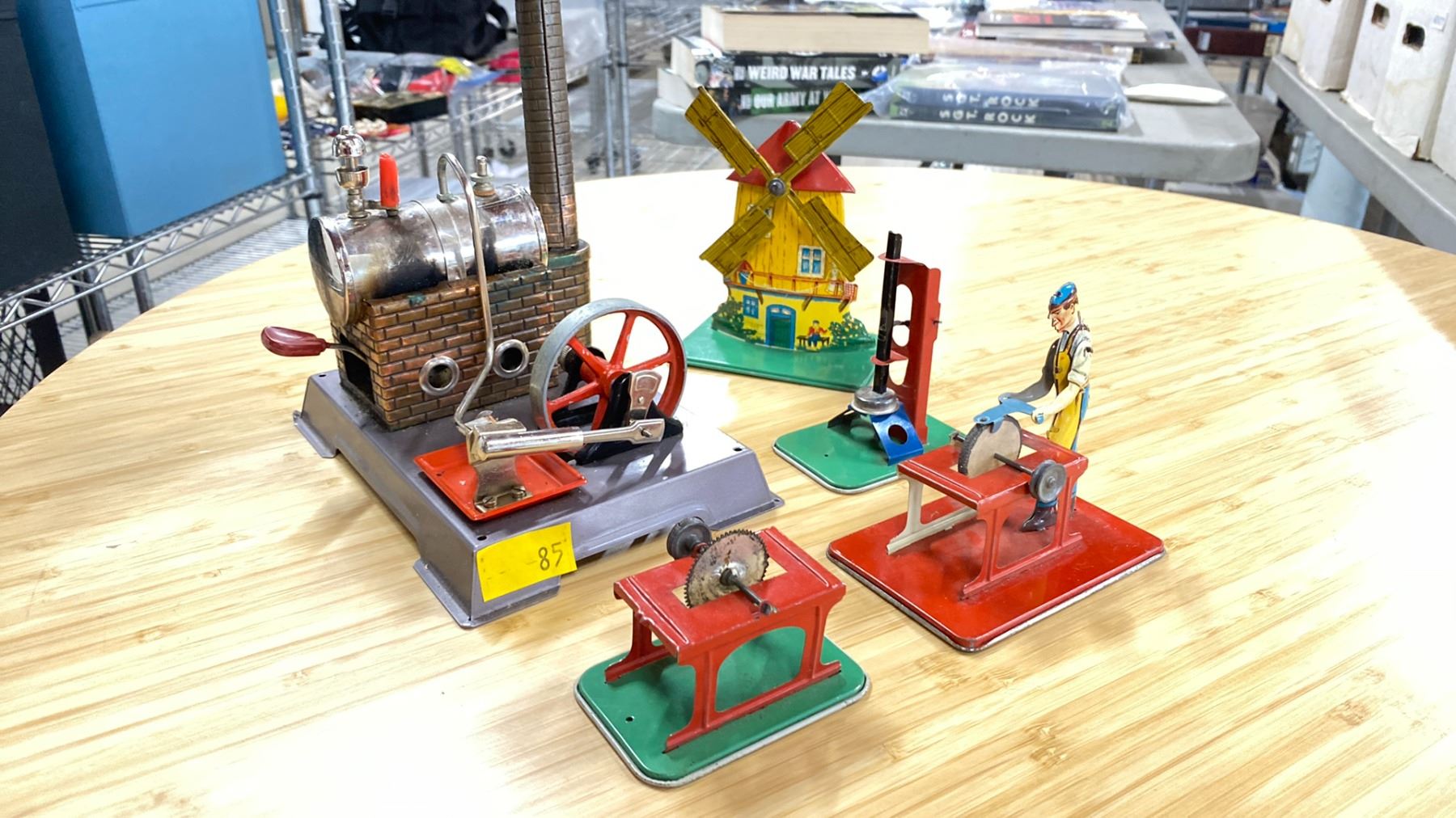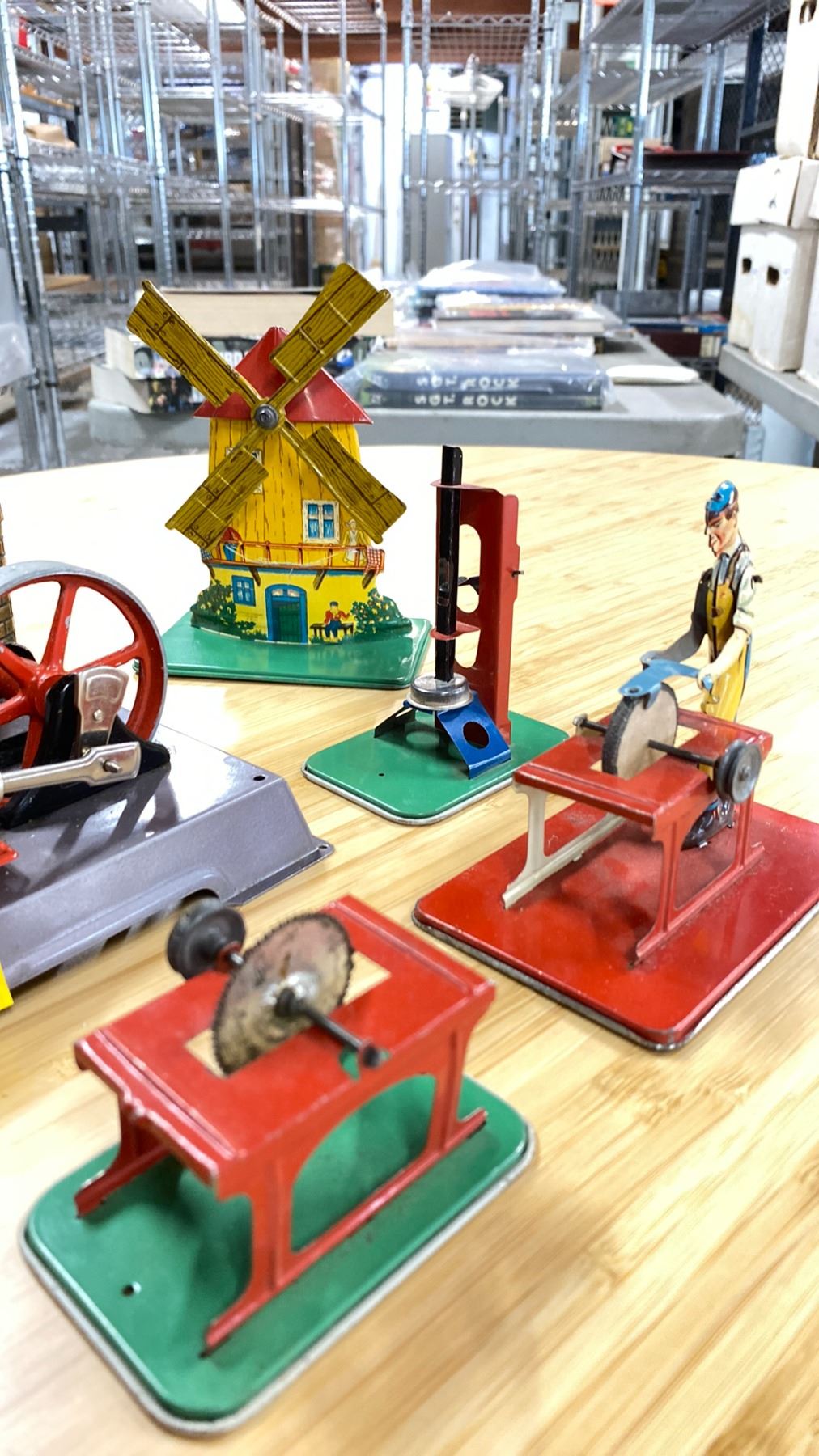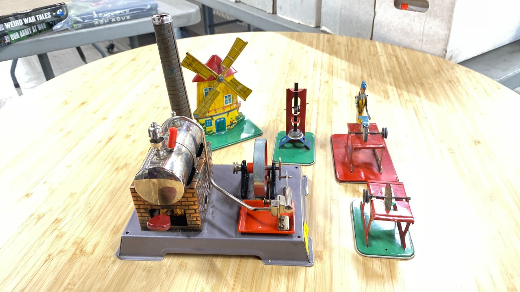 ANTIQUE TOY STEAM ENGINE (MADE IN GERMANY) WITH 4 TIN LITHOGRAPH STEAM TOY ACCESSORIES