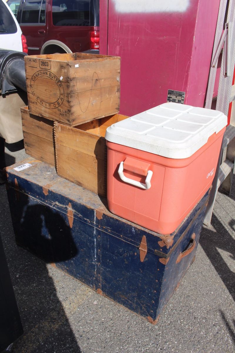 ANTIQUE TRUNK 3 BUTTER BOXES AND COOLER