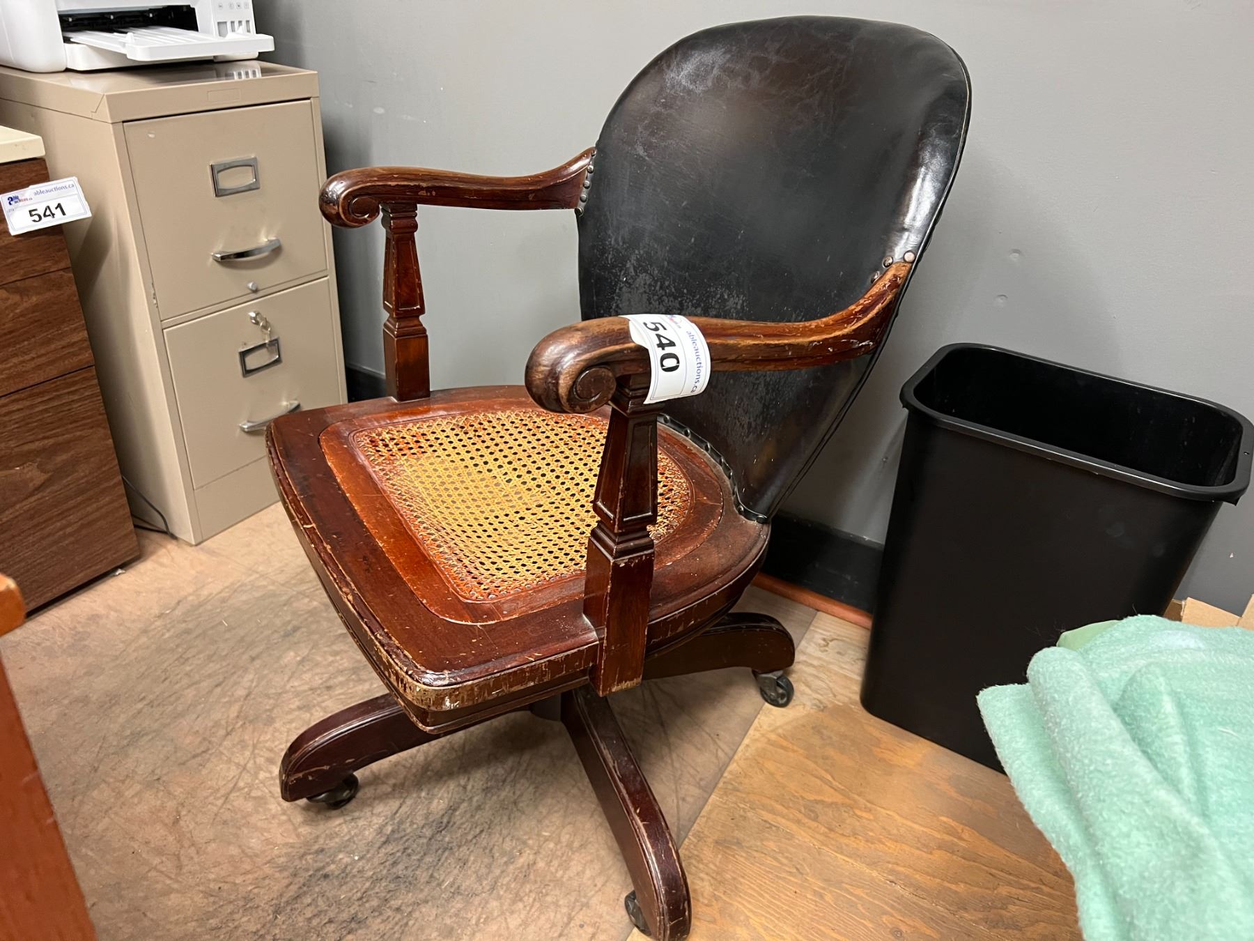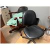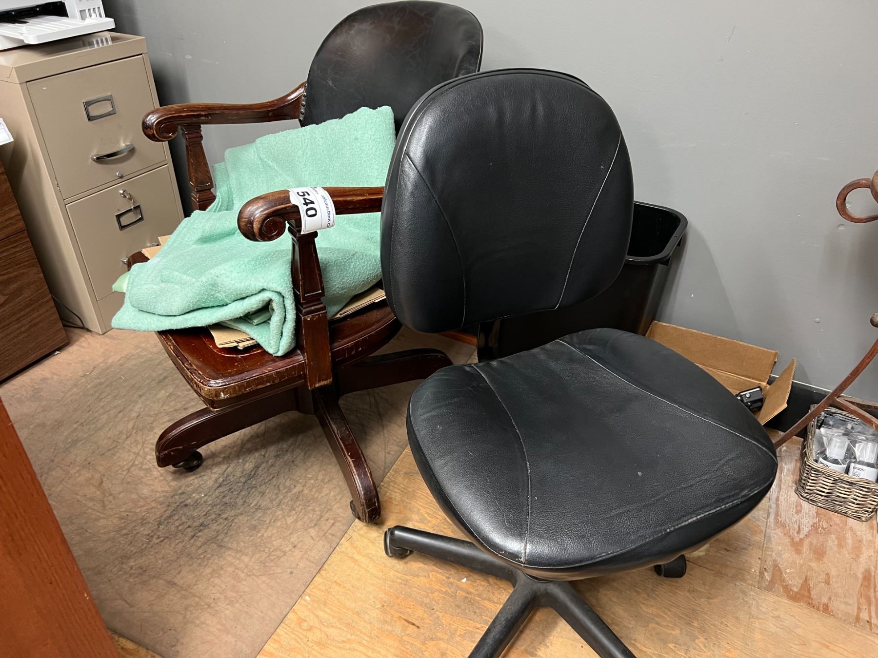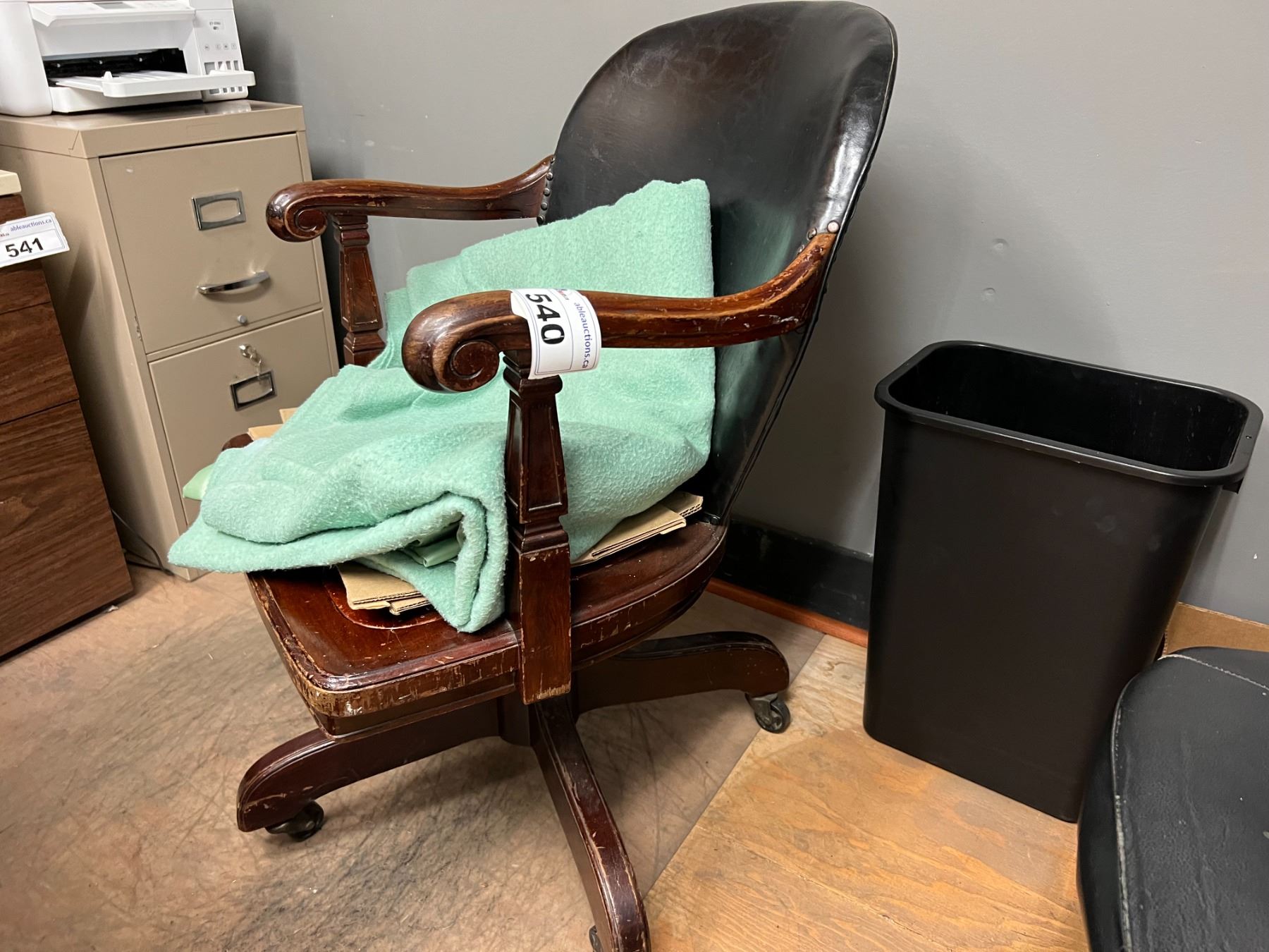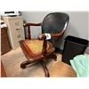 ANTIQUE WOODEN ARMED SWIVEL OFFICE CHAIR & BLACK STENO CHAIR