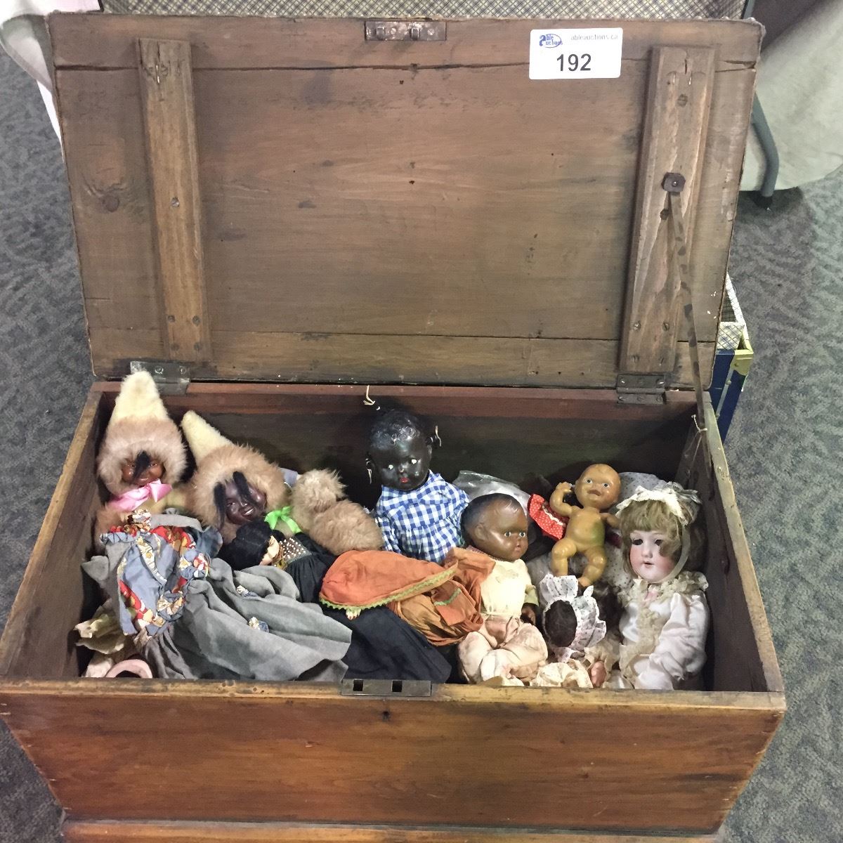 ANTIQUE WOODEN TOY CHEST AND CONTENTS, INCLUDING PORCELAIN DOLLS AND MORE
