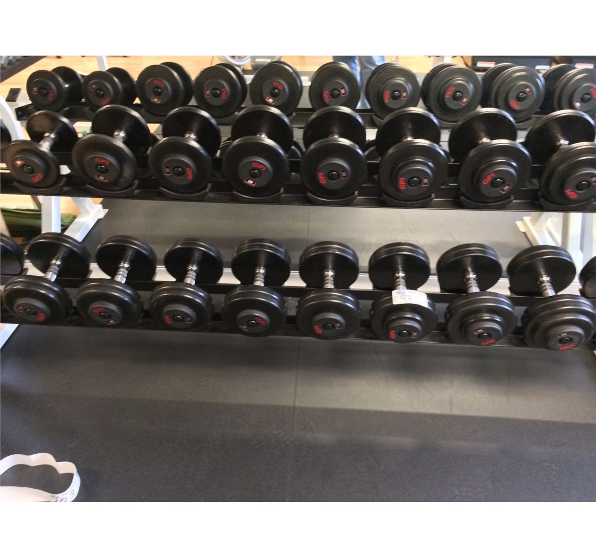 APEX DUMBELL RACK COMPLETE WITH 20 GPI DUMBELLS FROM 15 LBS TO 55 LBS