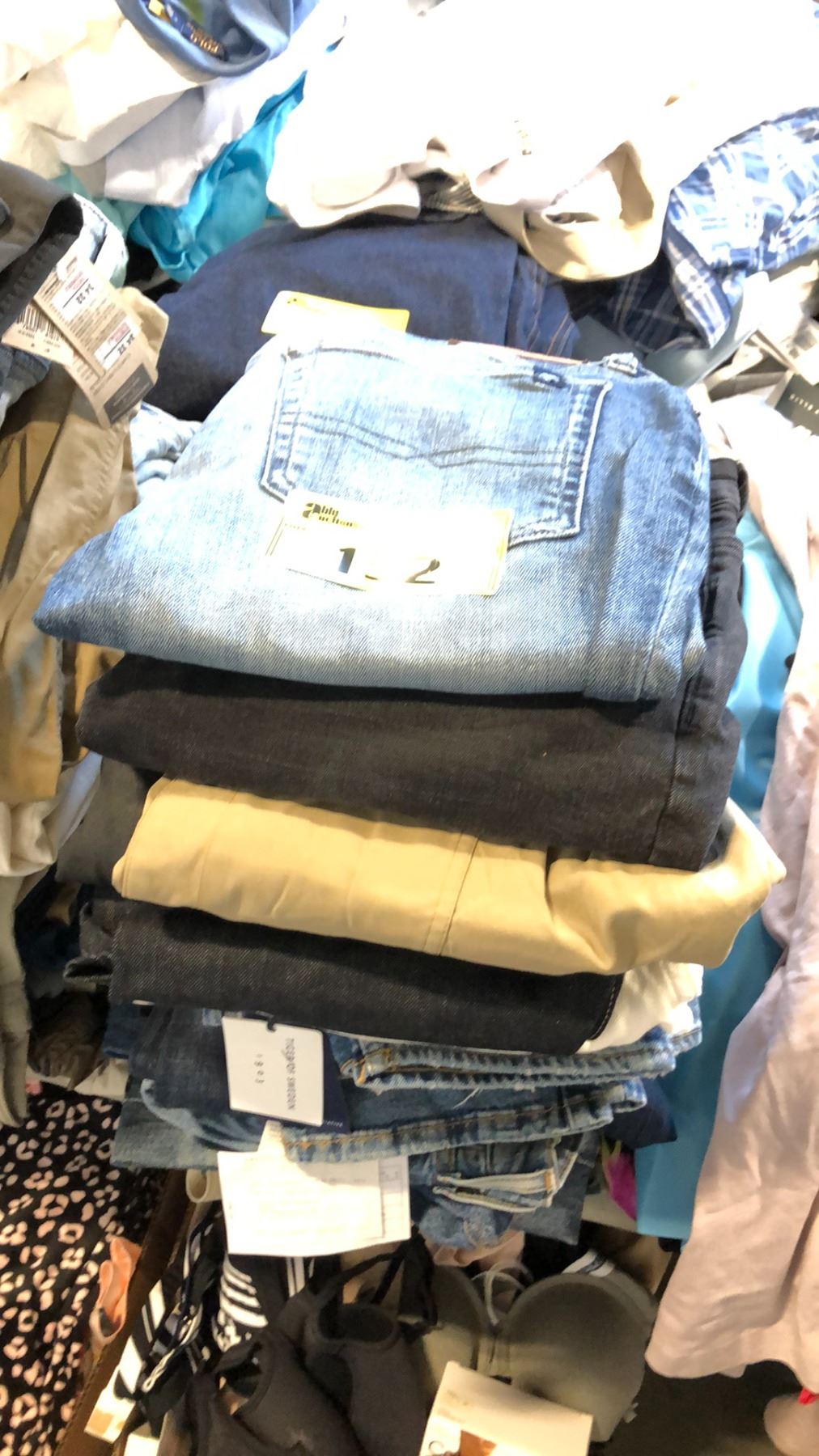 APPROX 11 PAIRS OF PANTS IN DIFFERENT SIZES INCLUDING BUFFALO, TIMBERLAND, OWN, GUESS, LEVIS,