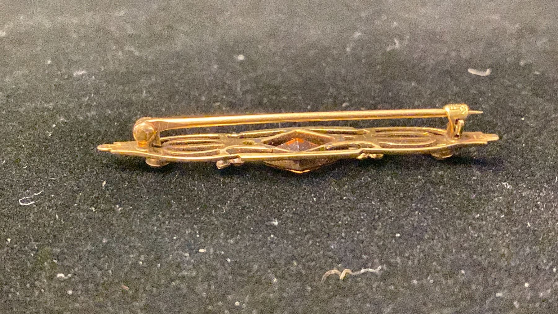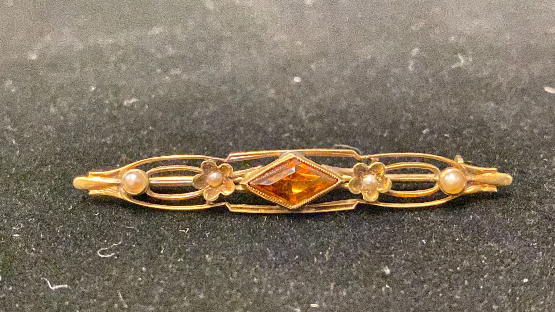 APPROX 14K BROOCH SET WITH YELLOW STONE & PEARLS (3.2G)