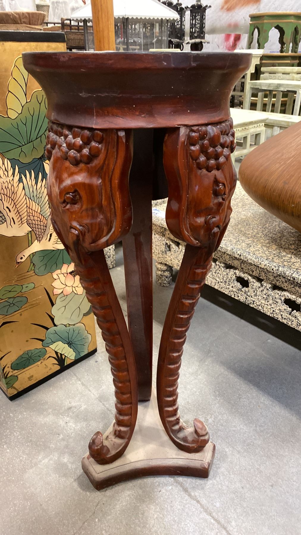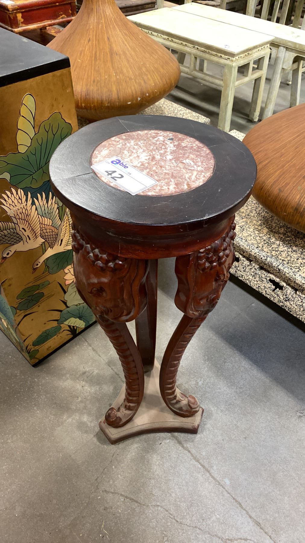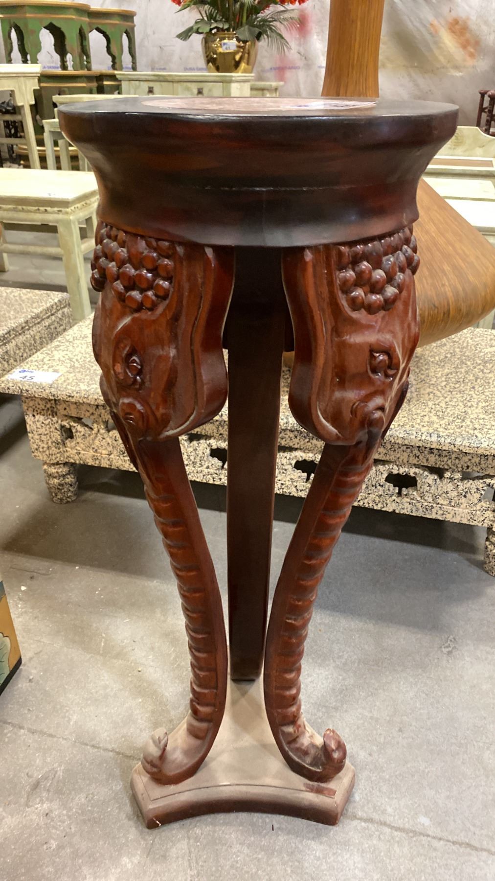 APPROX. 35" TALL CARVED ELEPHANT MAHOGANY PLANT STAND WITH PINK MARBLE INSET TOP