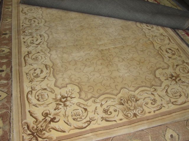 APPROX 5'X8' WOOL PILE AREA RUG - BEIGE AND EARTH TONES WITH BEIGE BORDER