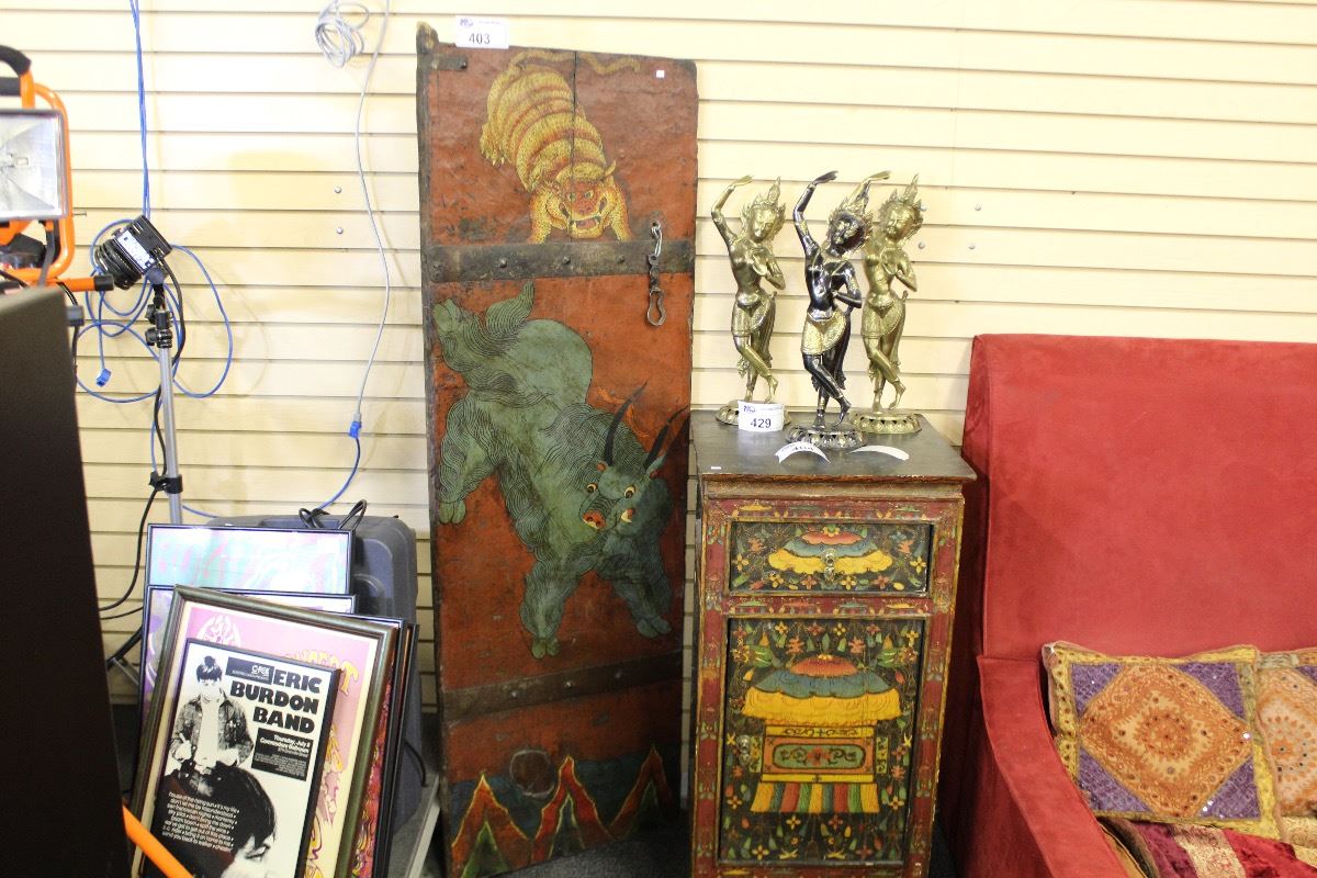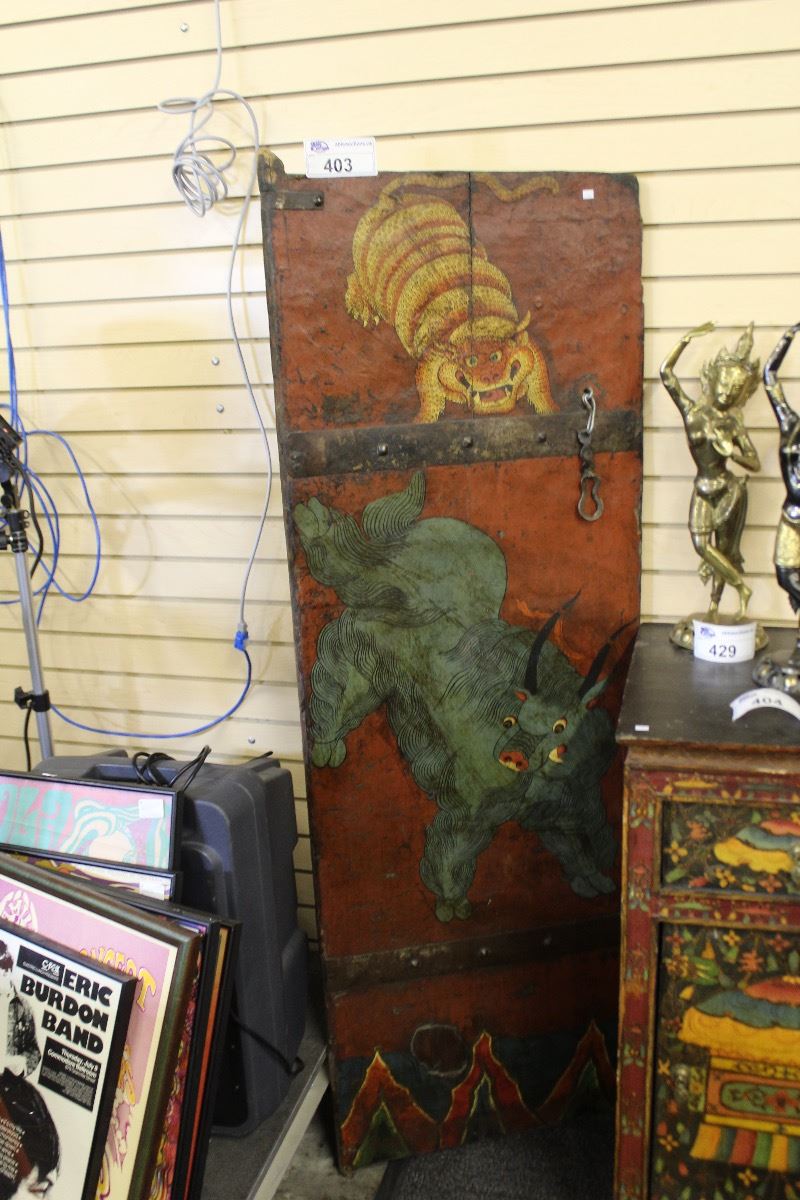 APPROX. 500-600 YEAR OLD WOODEN INDIAN TEMPLE DOOR, PAINTED WITH FIERCE GOAT AND LARGE CAT DESIGNS