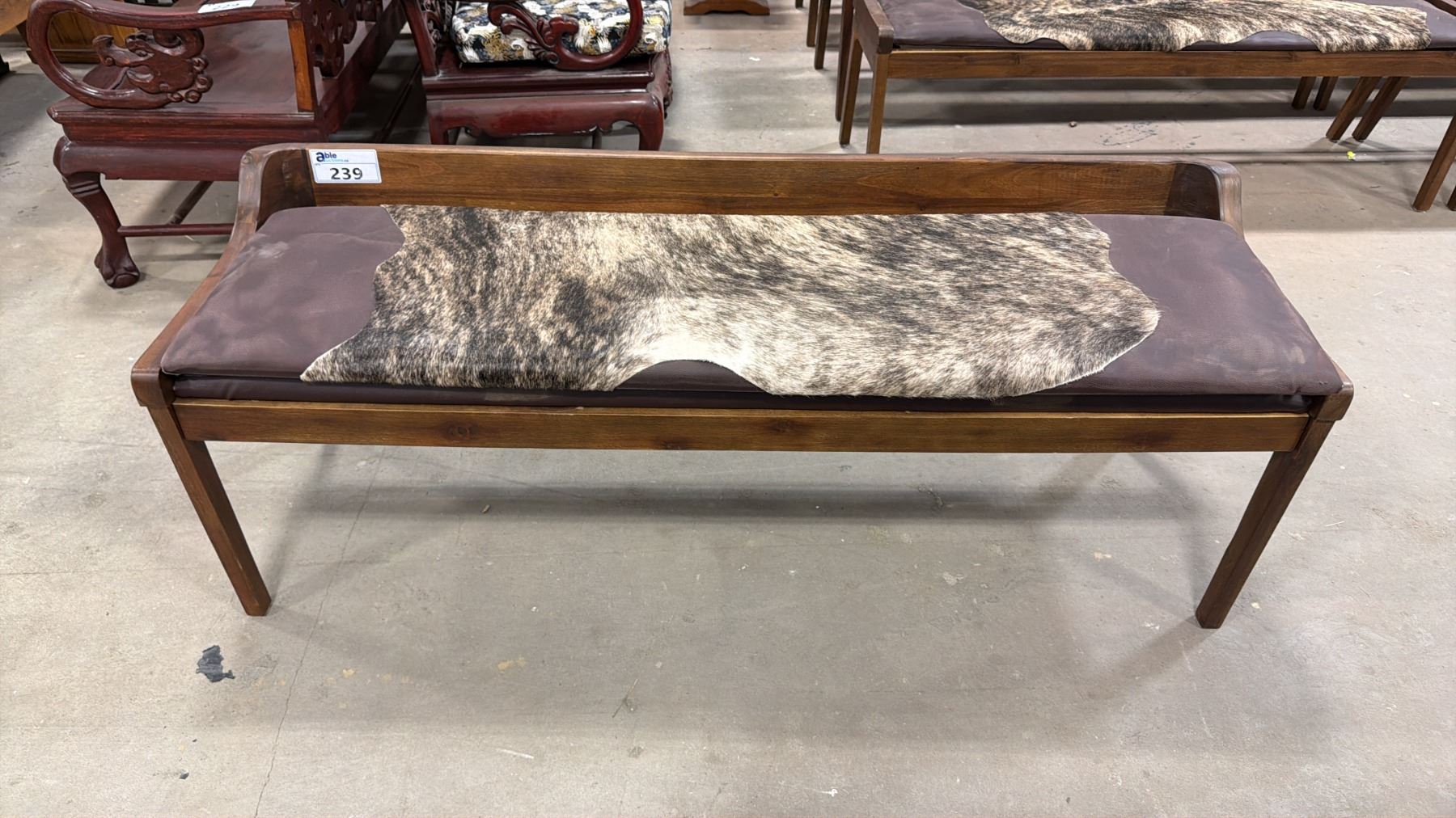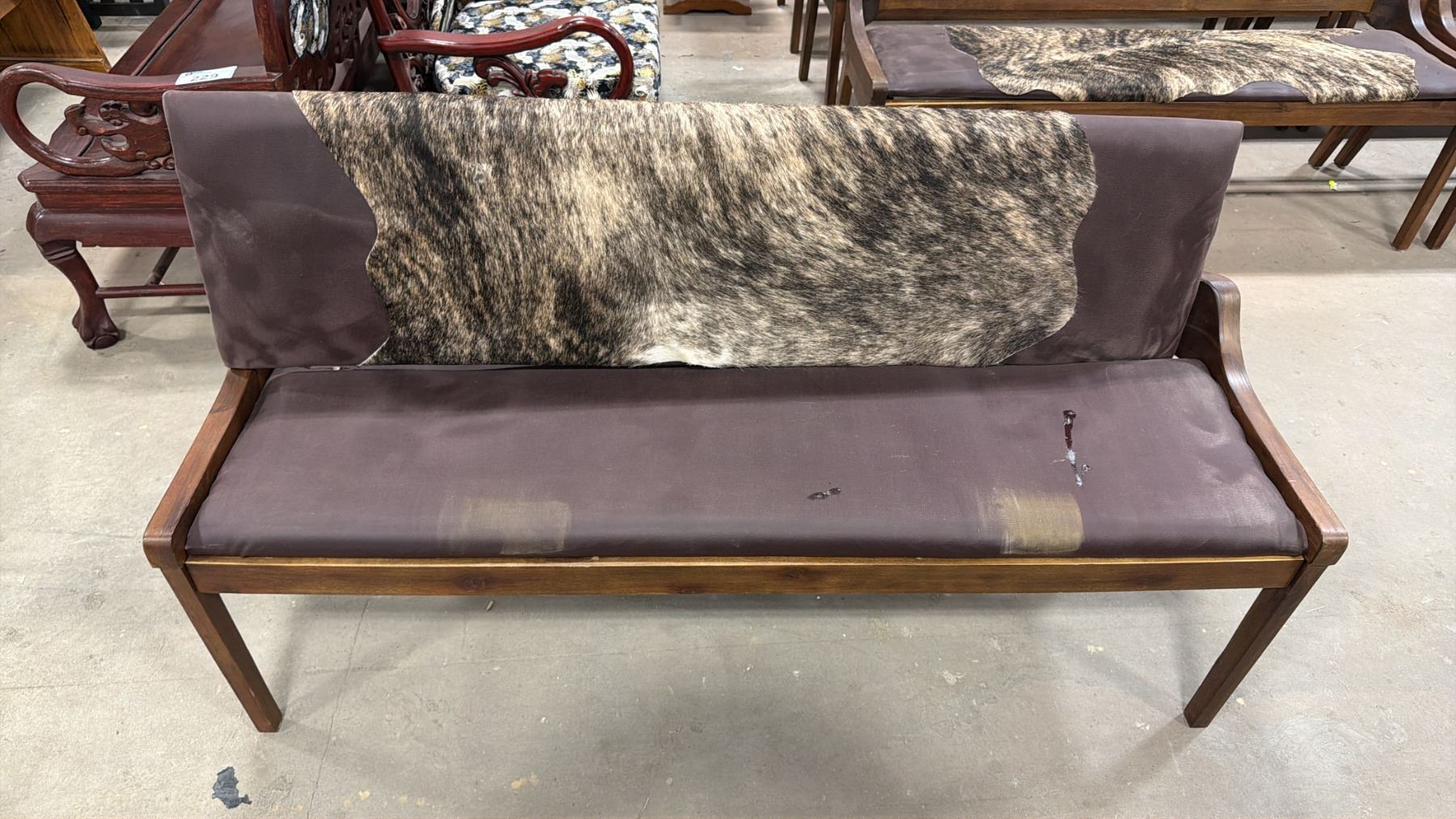 APPROX 59  ANIMAL HIDE UPHOLSTERED WOODEN BENCH SEAT