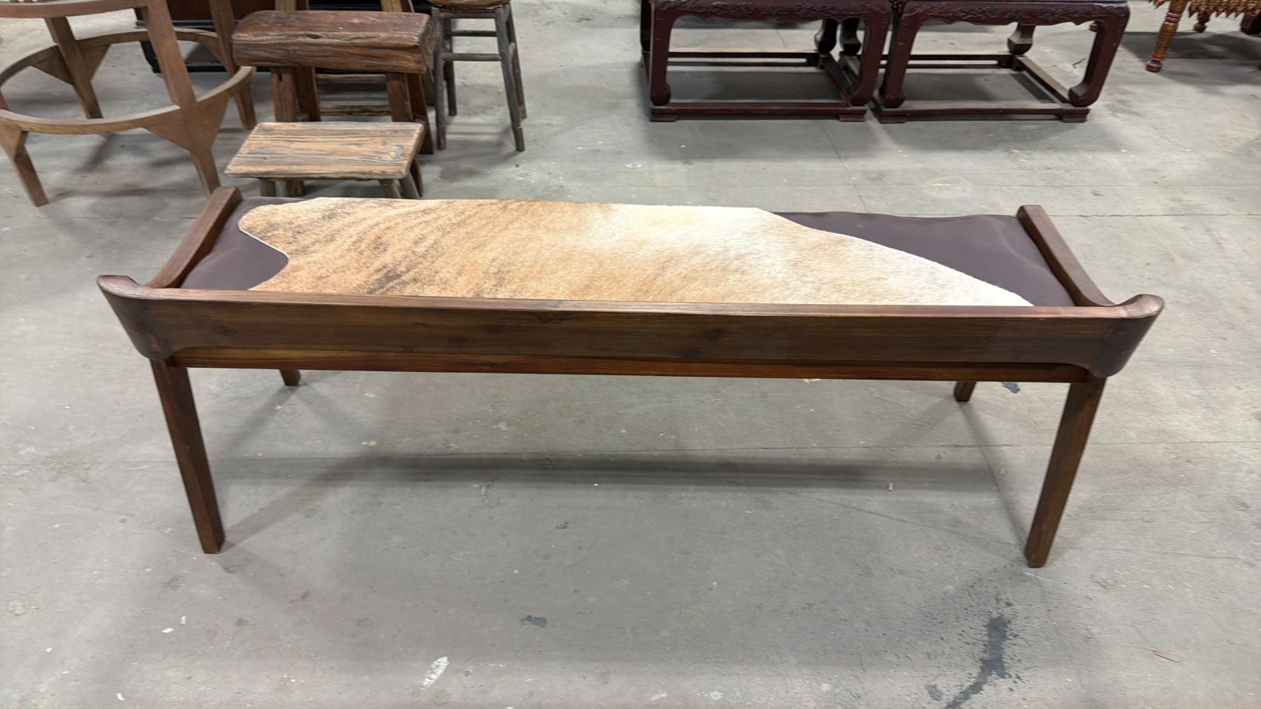 APPROX 59  ANIMAL HIDE UPHOLSTERED WOODEN BENCH SEAT