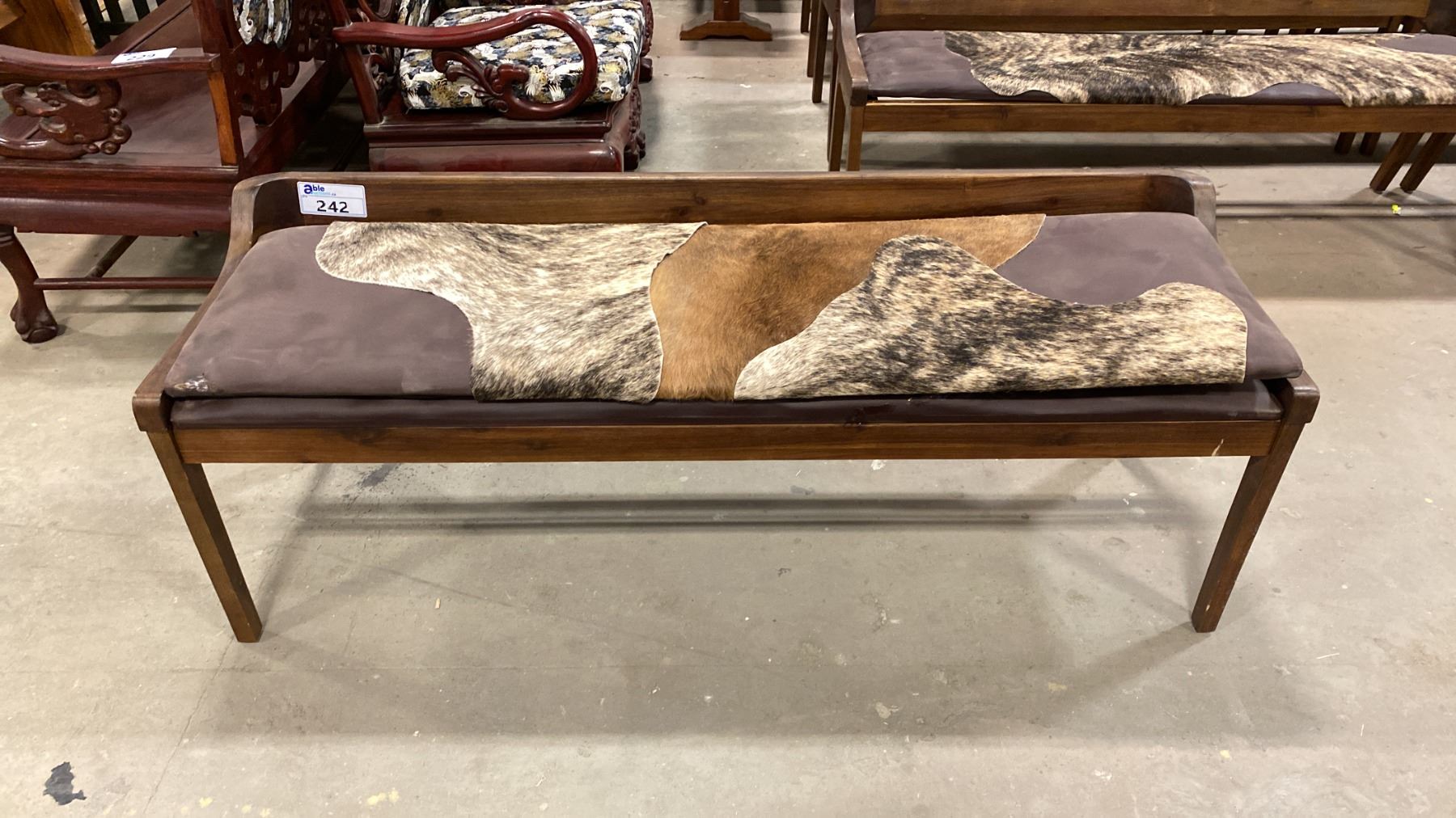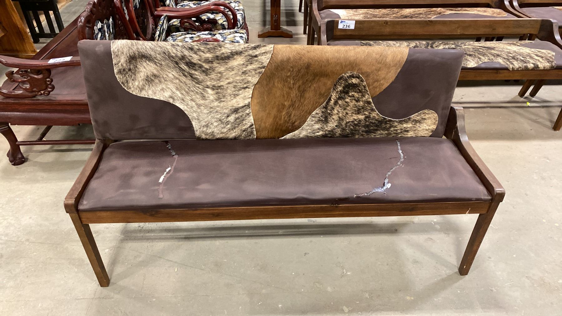 APPROX 59  ANIMAL HIDE UPHOLSTERED WOODEN BENCH SEAT