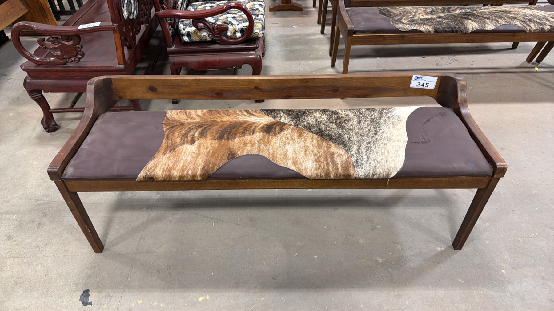 APPROX 59  ANIMAL HIDE UPHOLSTERED WOODEN BENCH SEAT