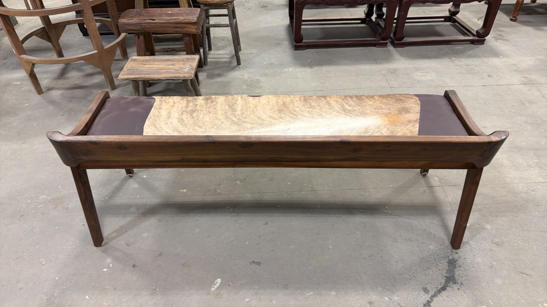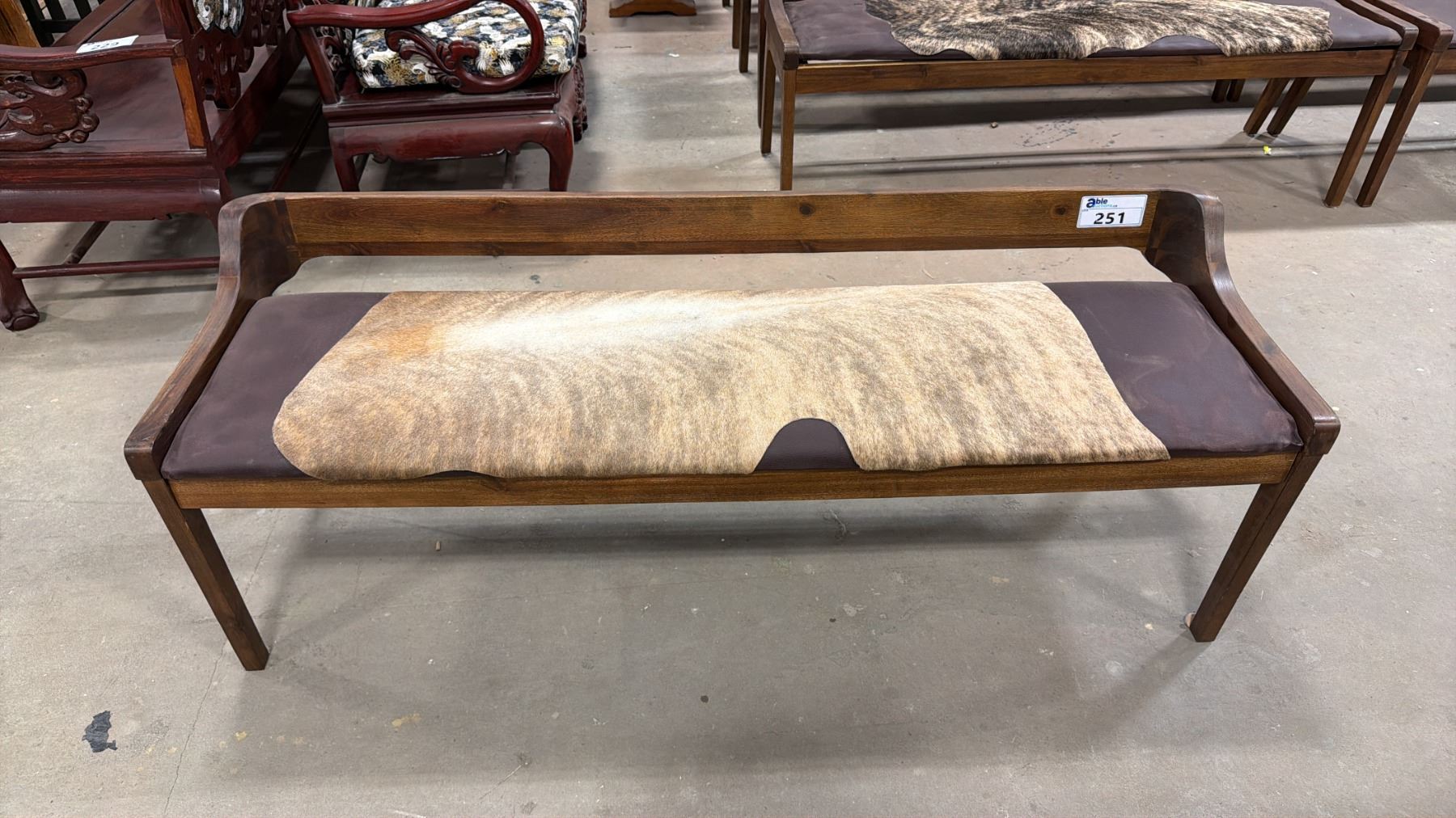 APPROX 59" ANIMAL HIDE UPHOLSTERED WOODEN BENCH SEAT