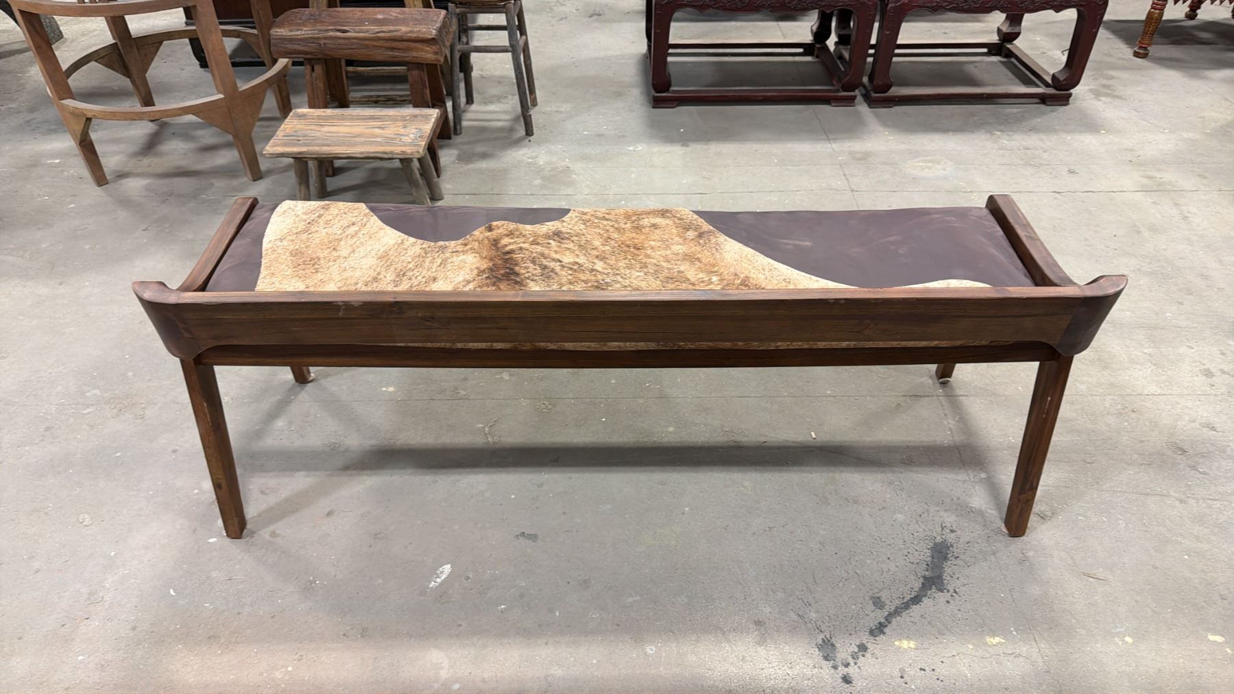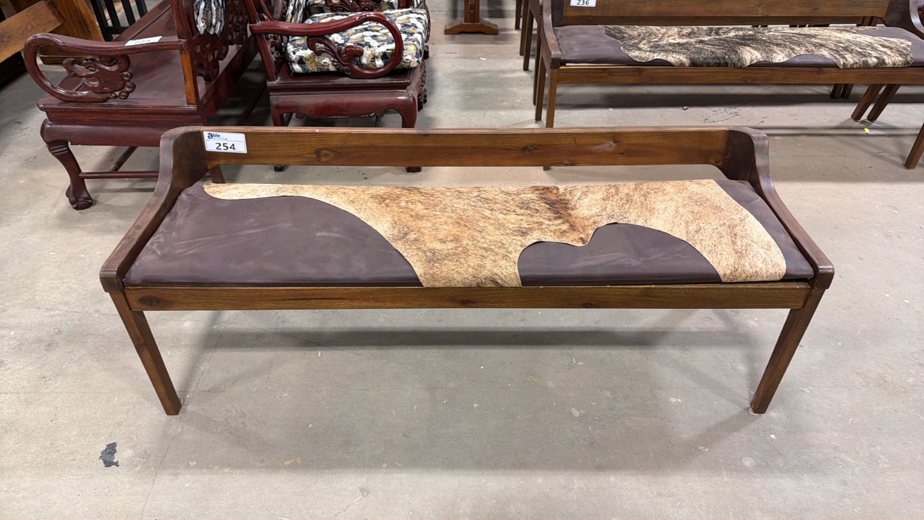 APPROX 59" ANIMAL HIDE UPHOLSTERED WOODEN BENCH SEAT