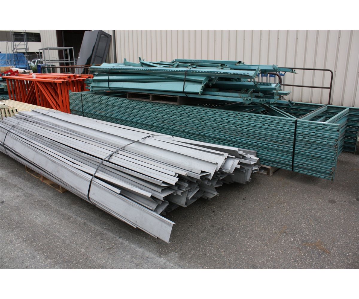 APPROX 8 18FT BLUE PALLET RACK UPRIGHT, 42 12FT CROSS BARS AND PALLET OF GALVINIZED DECKING