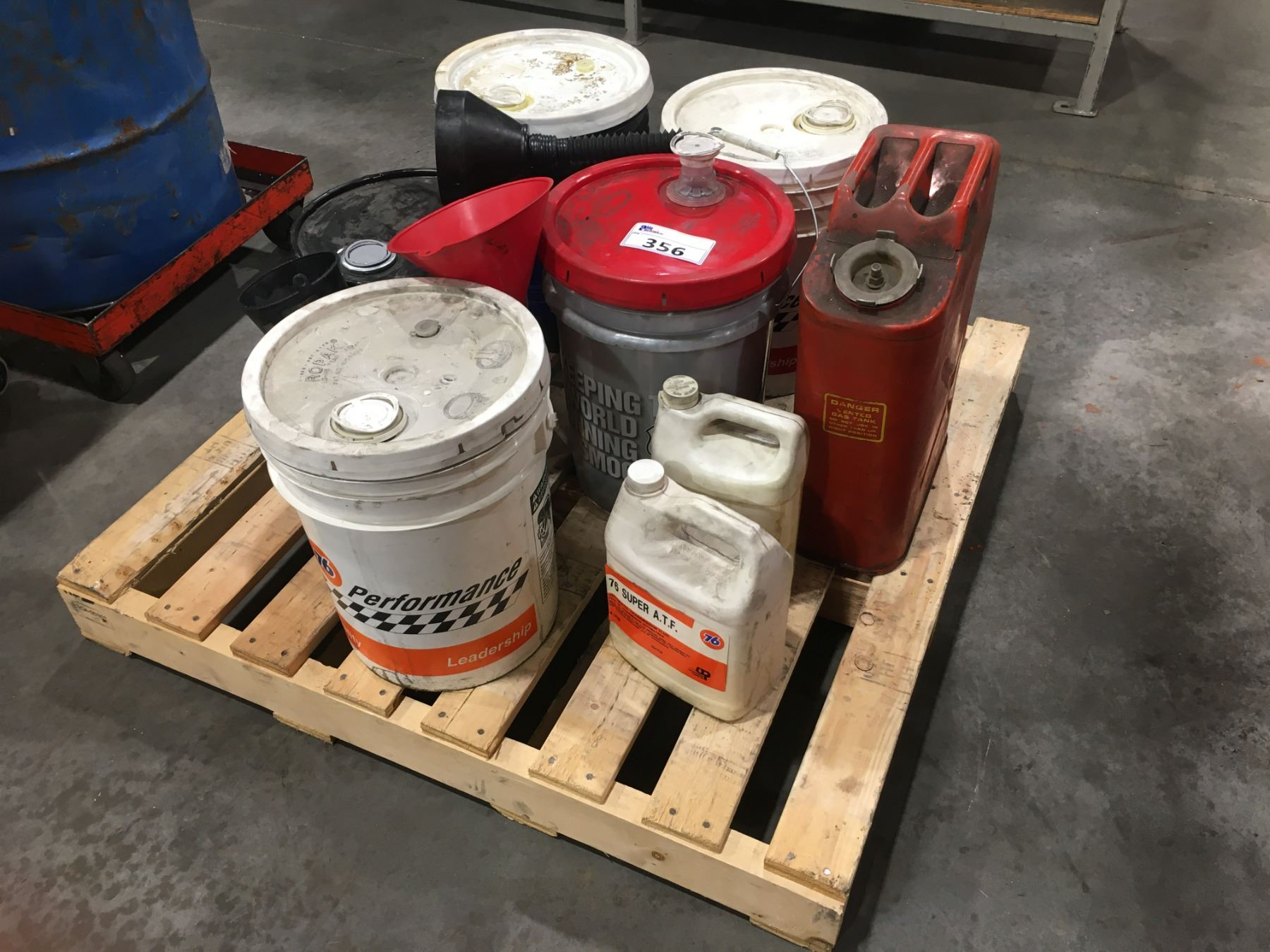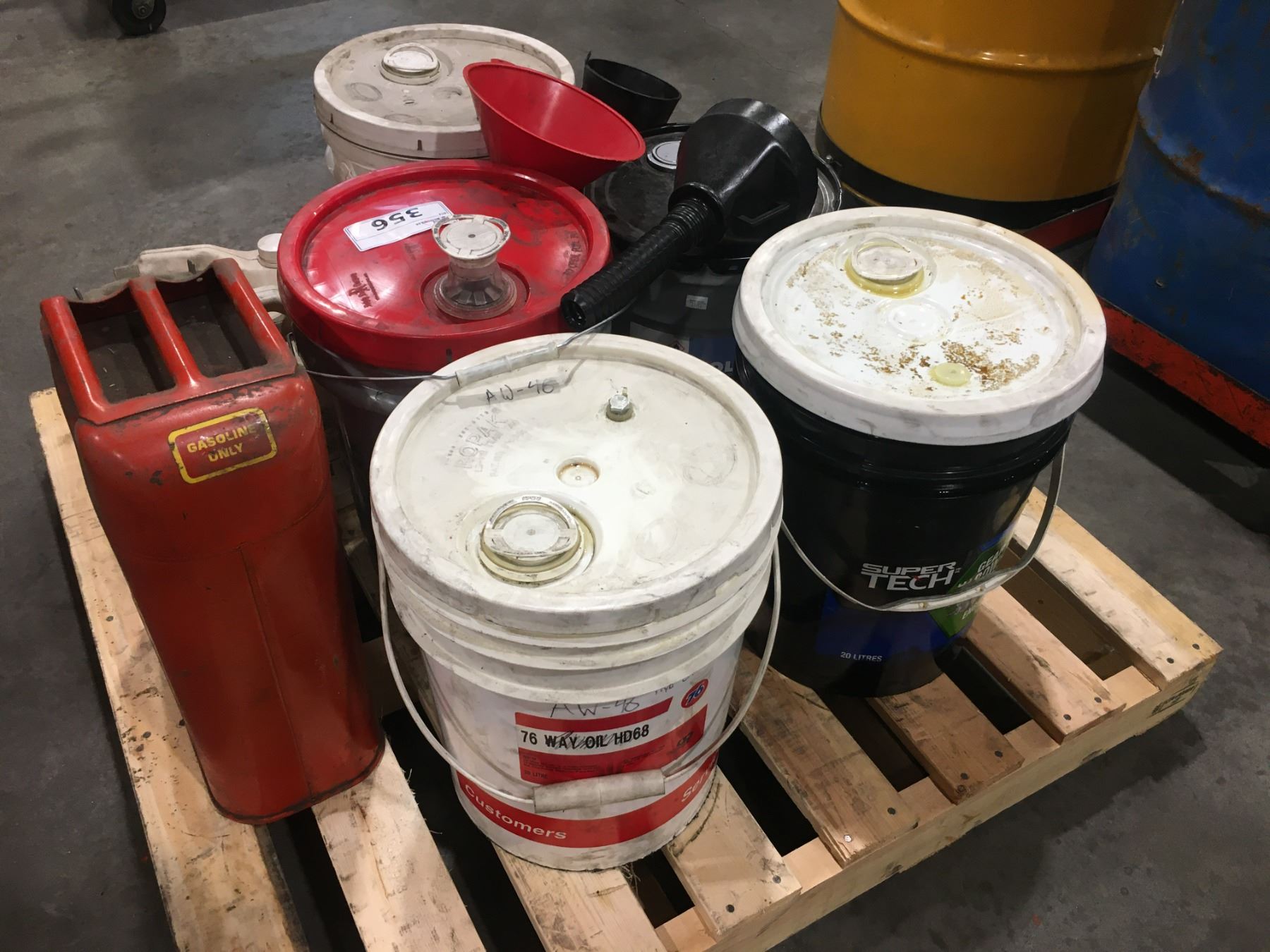 APPROX 8 (PARTIALLY FULL) CONTAINERS ASSORTED LUBRICANTS & RED METAL JERRY CAN
