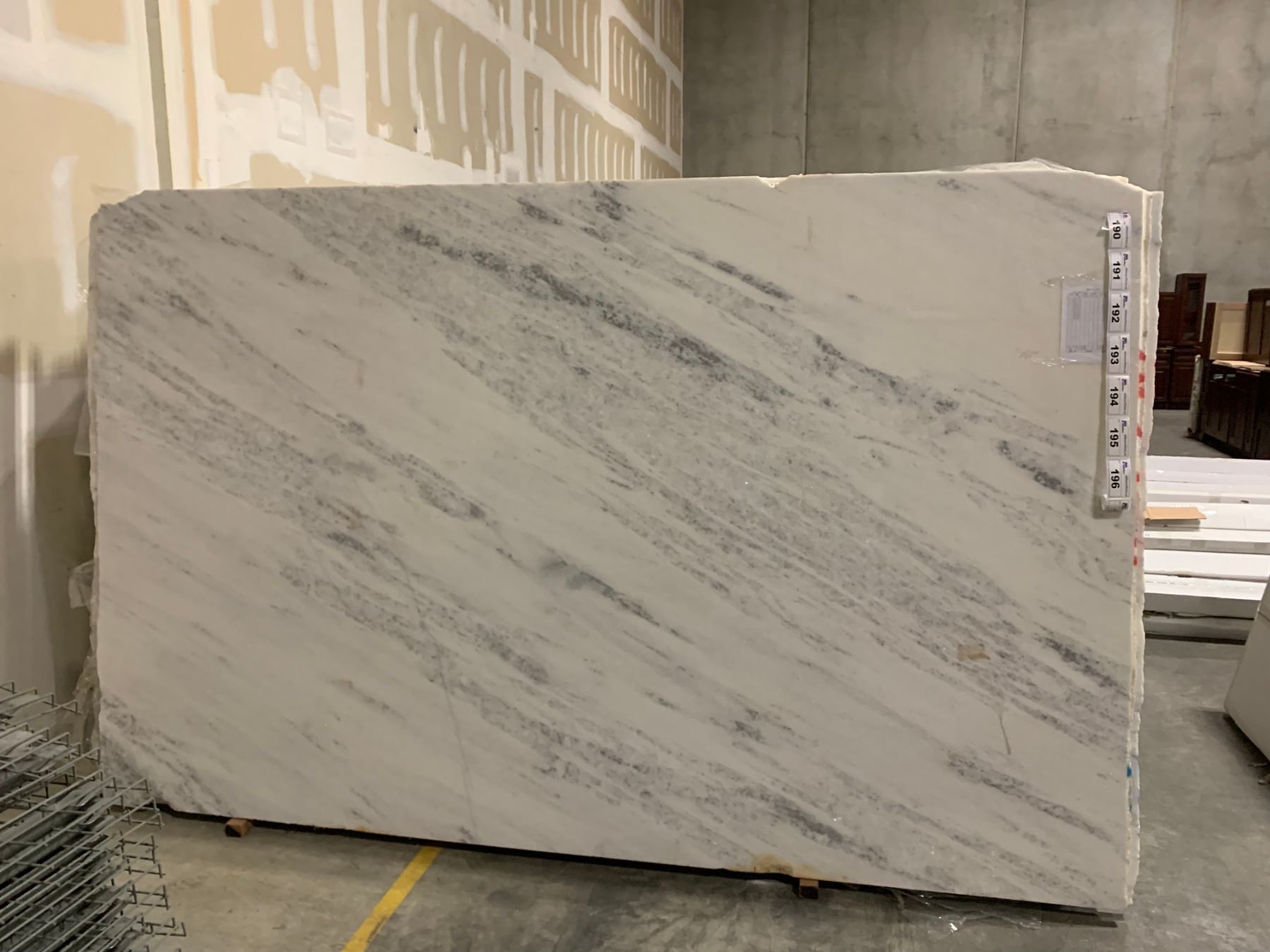 APPROX. 9.5' X 6.5' WHITE AND GREY MARBLE COUNTER TOP SLAB, (MUST TAKE TOP SLAB ON STACK WHEN