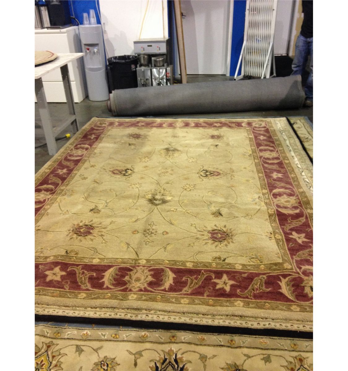 APPROX 9'X11' WOOL PILE AREA RUG - BEIGE WITH BLUE BORDER