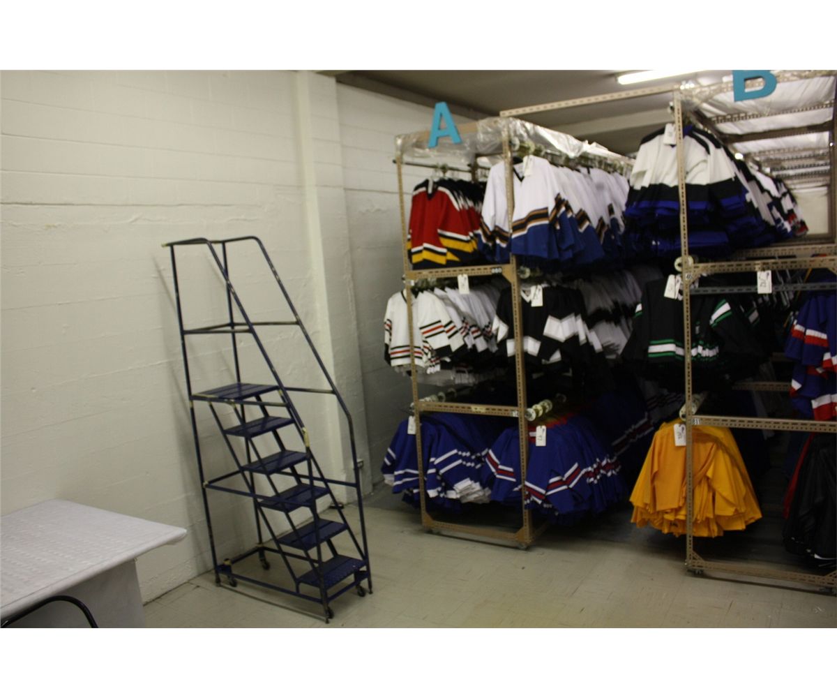 APROX. 50' LONG DOUBLE SIDED ROLLING 3 LEVEL CLOTHING RACK