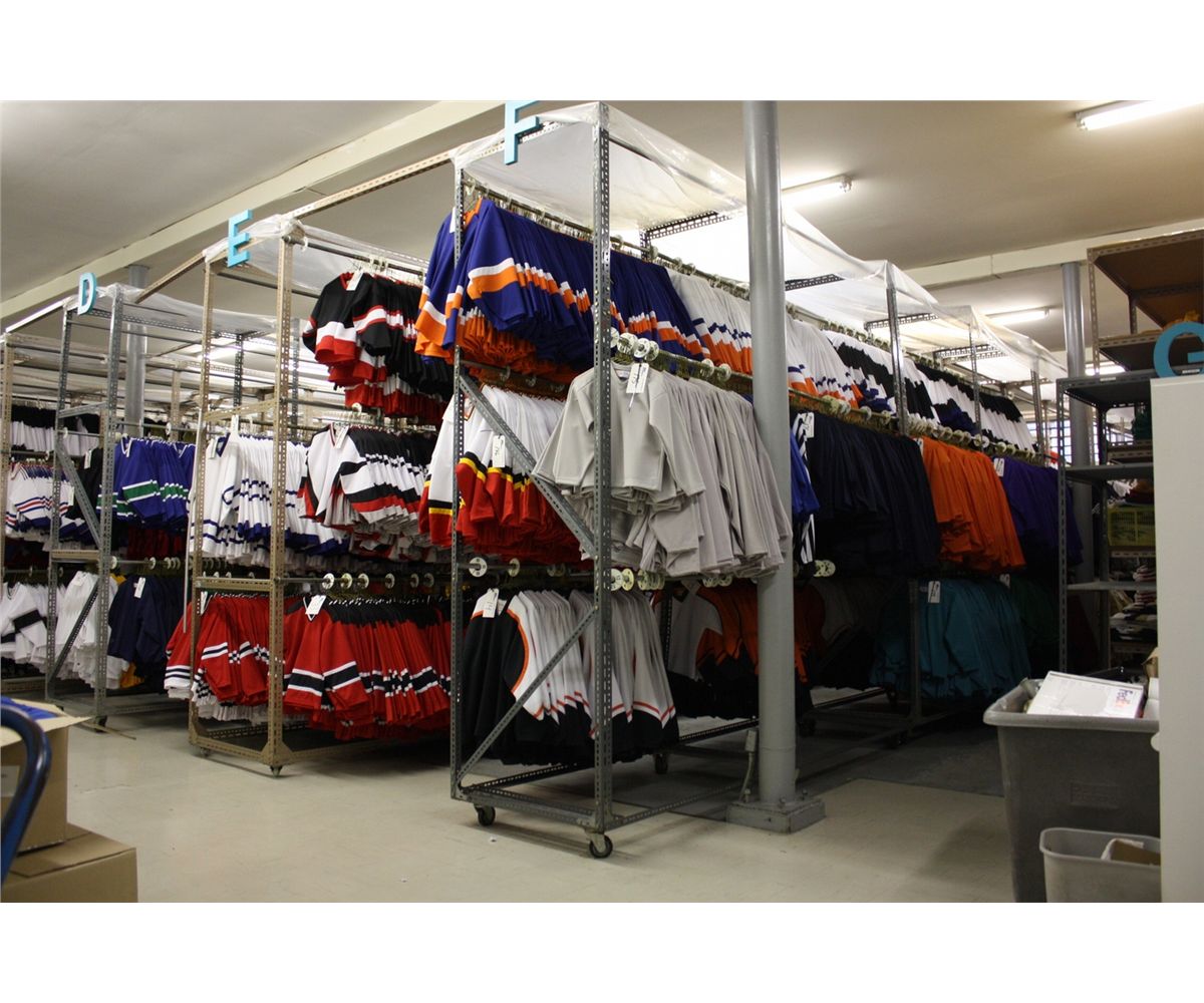 APROX. 50' LONG DOUBLE SIDED ROLLING 3 LEVEL CLOTHING RACK
