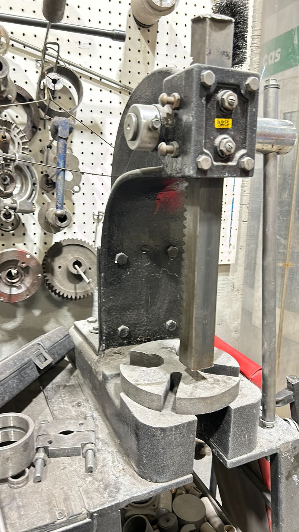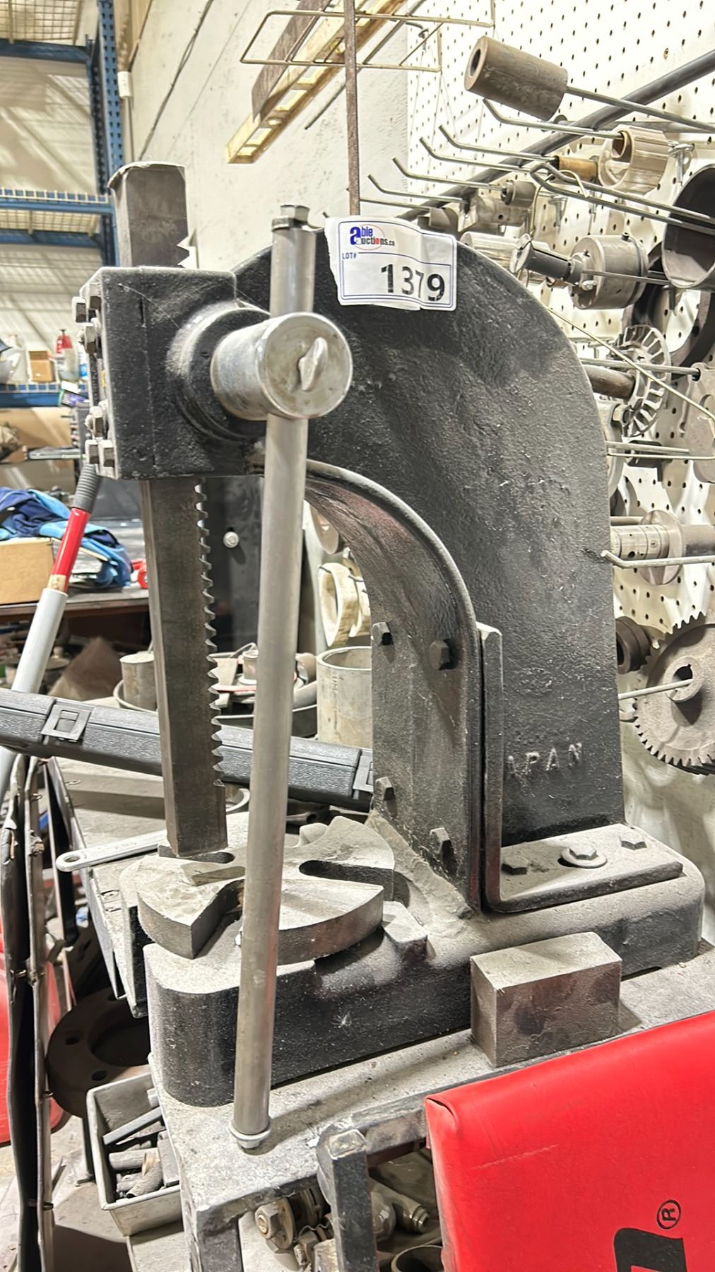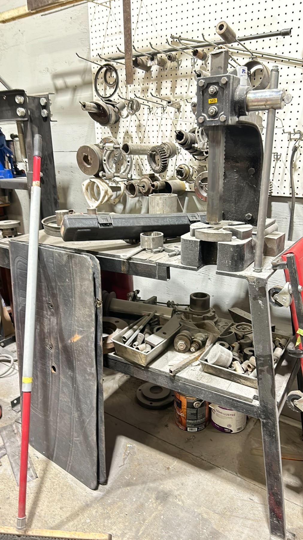 ARBOR PRESS WITH HEAVY DUTY METAL BENCH AND ASST OF 'STUFF'.