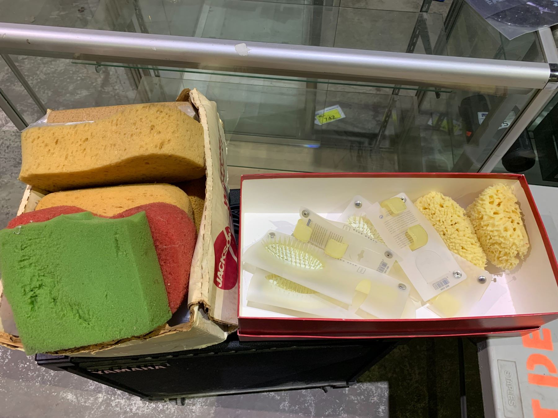 ASSORTED ACCA KAPPA HAIR BRUSHES, RESTORATION HARDWARE NATURAL SEA SPONGES & ASSORTED SPONGES