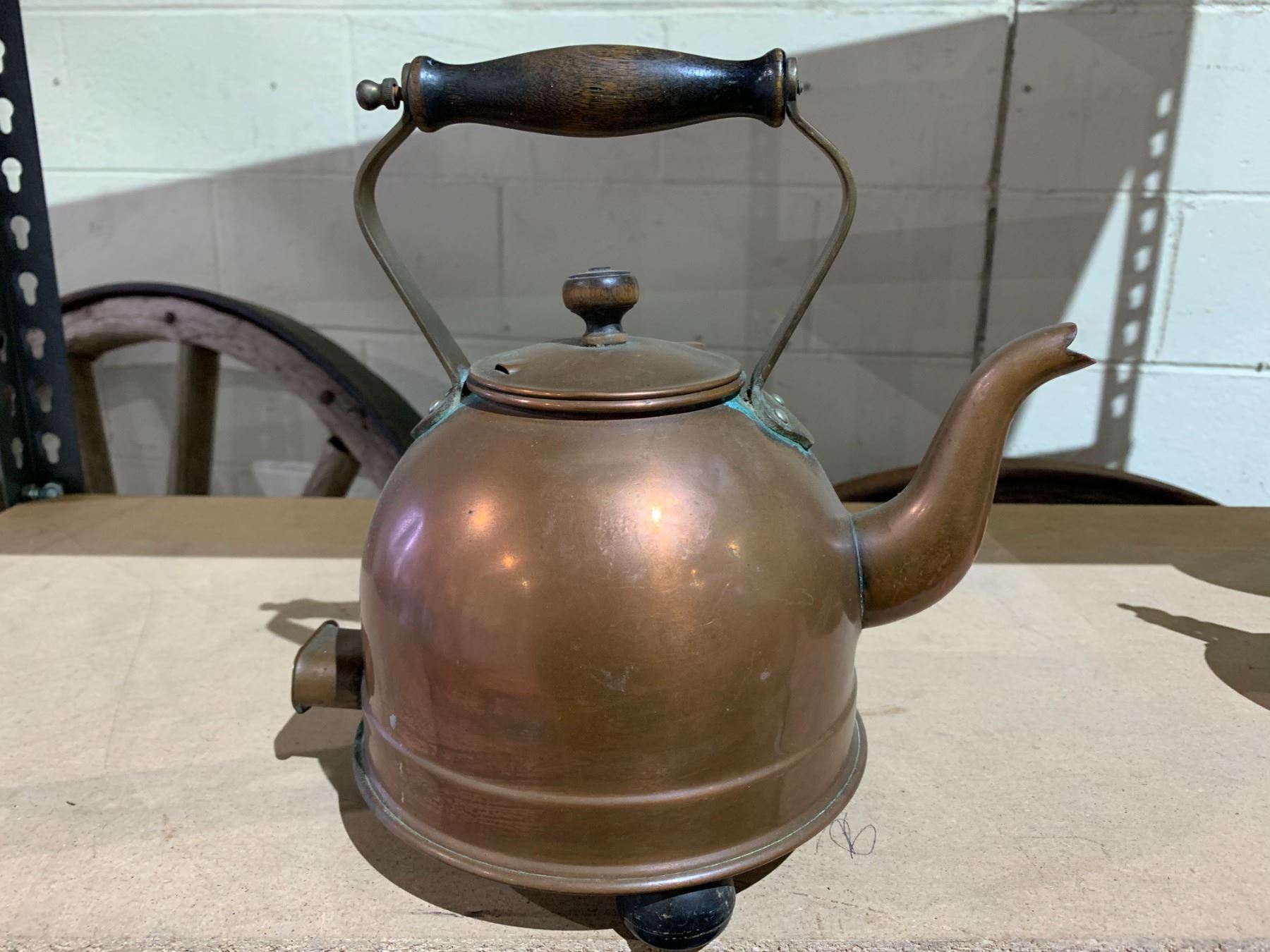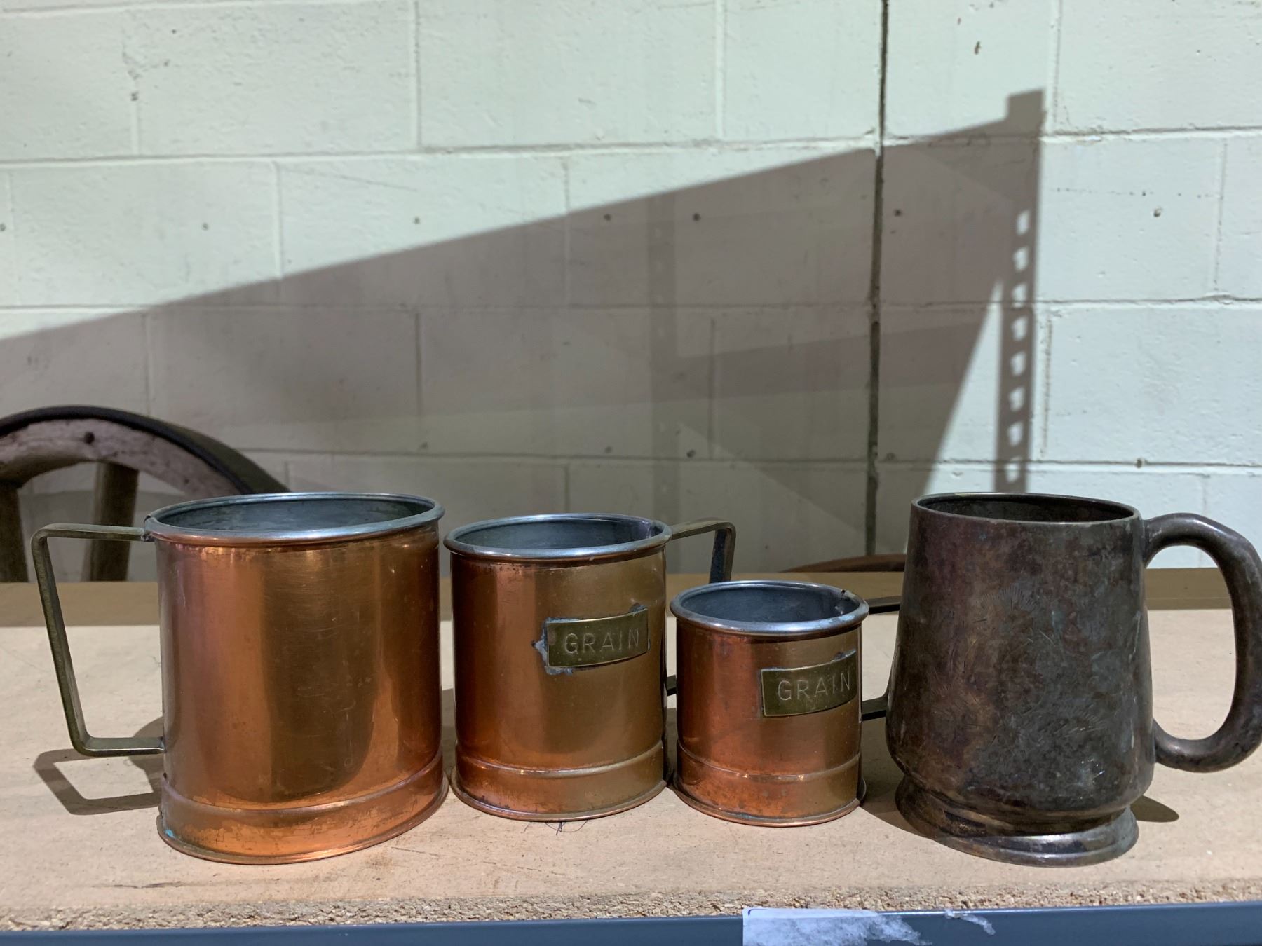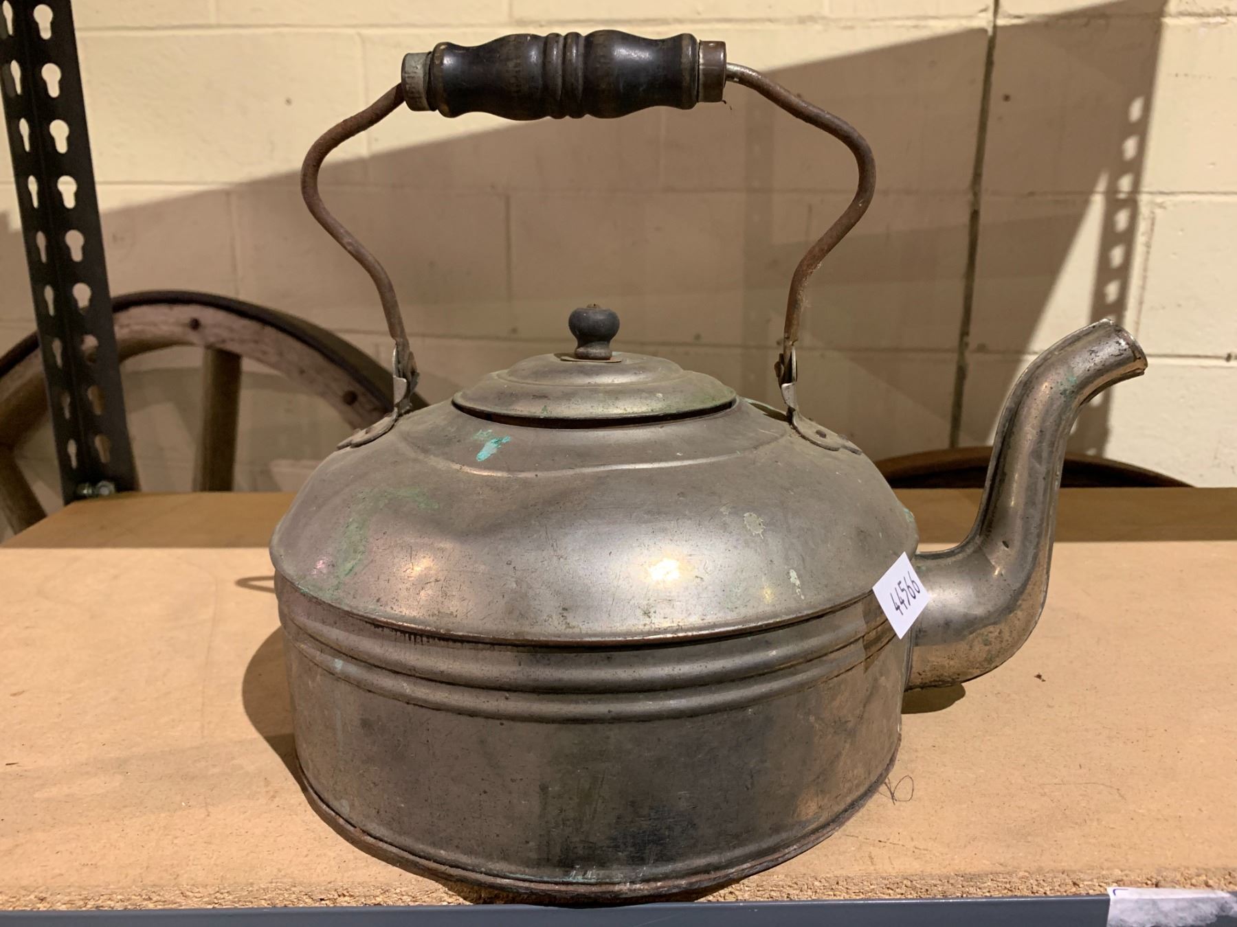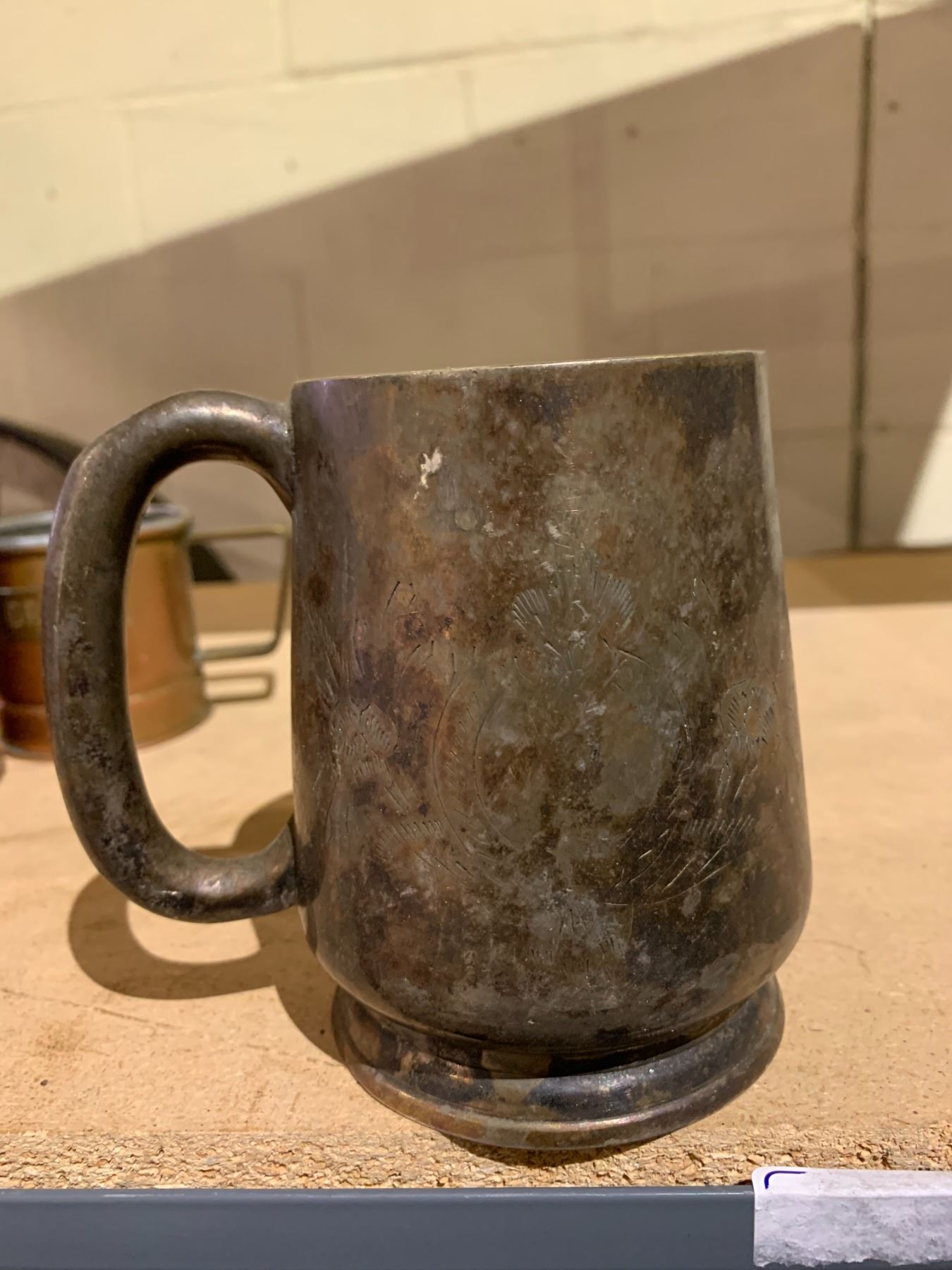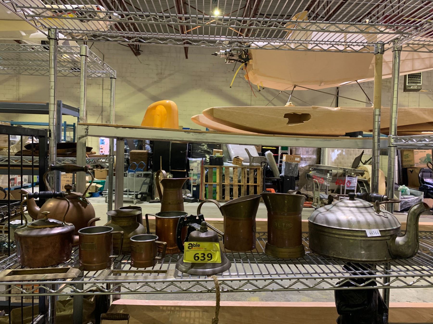 ASSORTED ANTIQUES INCLUDING; BRASS MUGS, LARGE TEAPOT, BELL & MORE