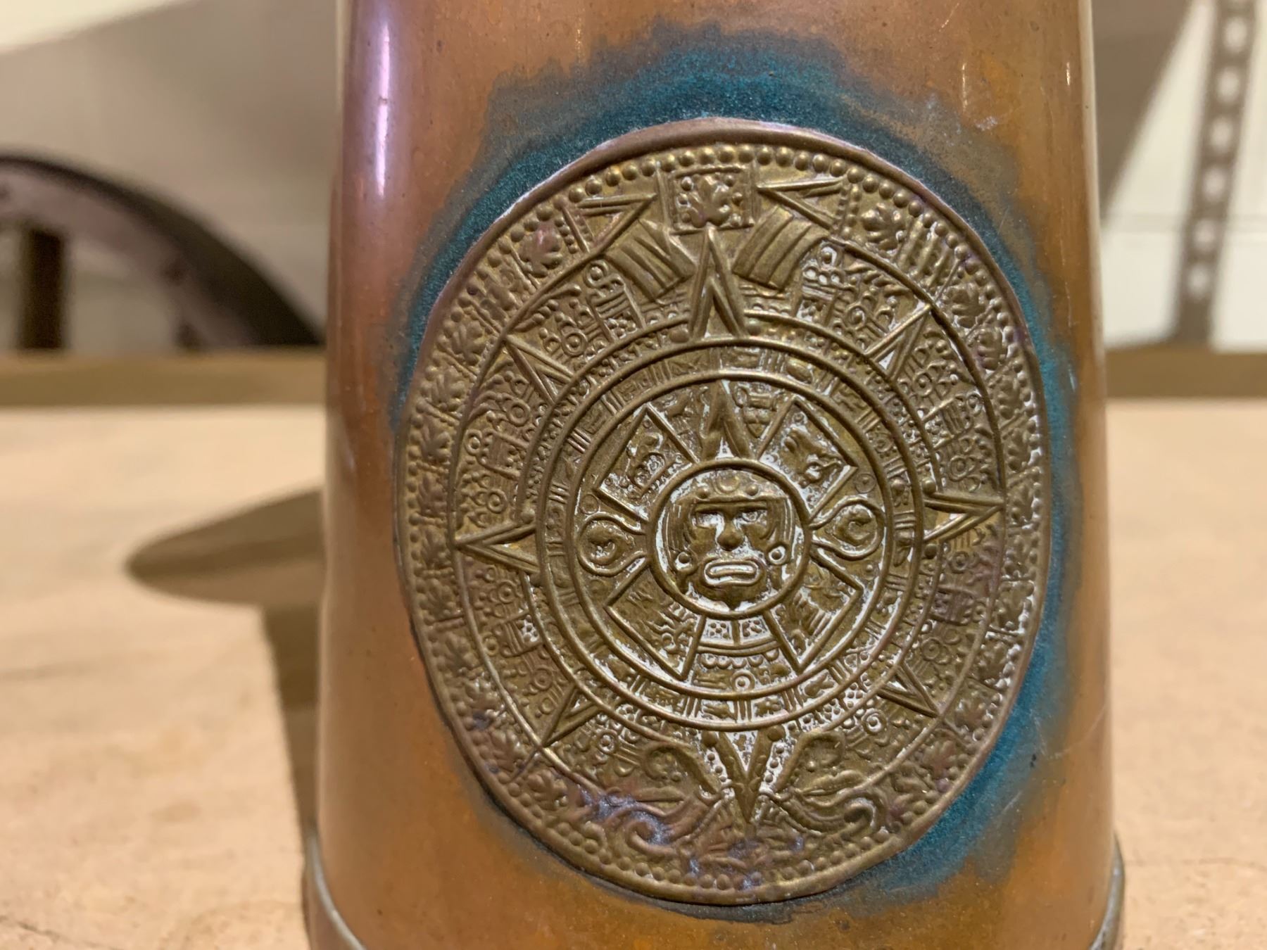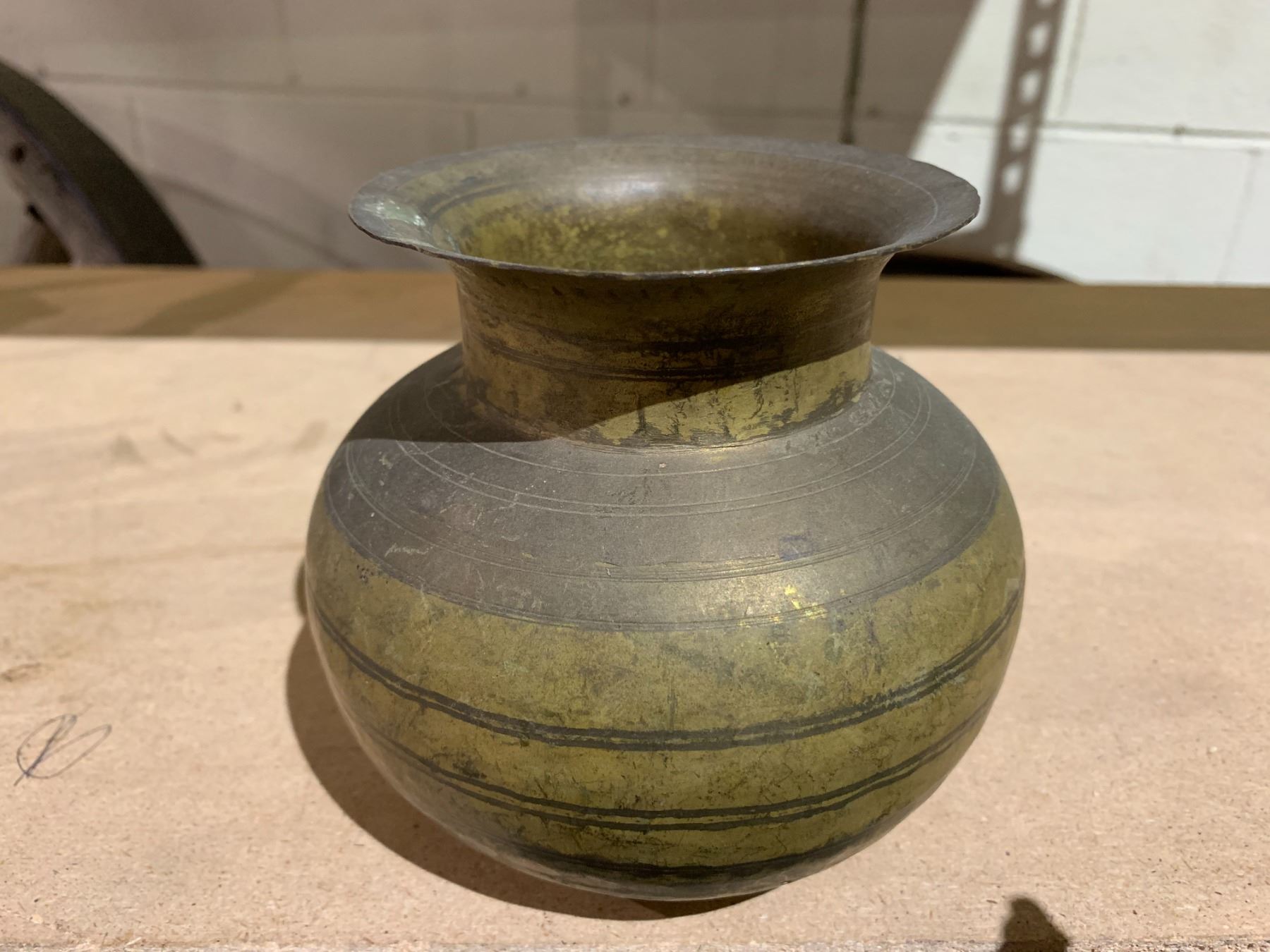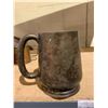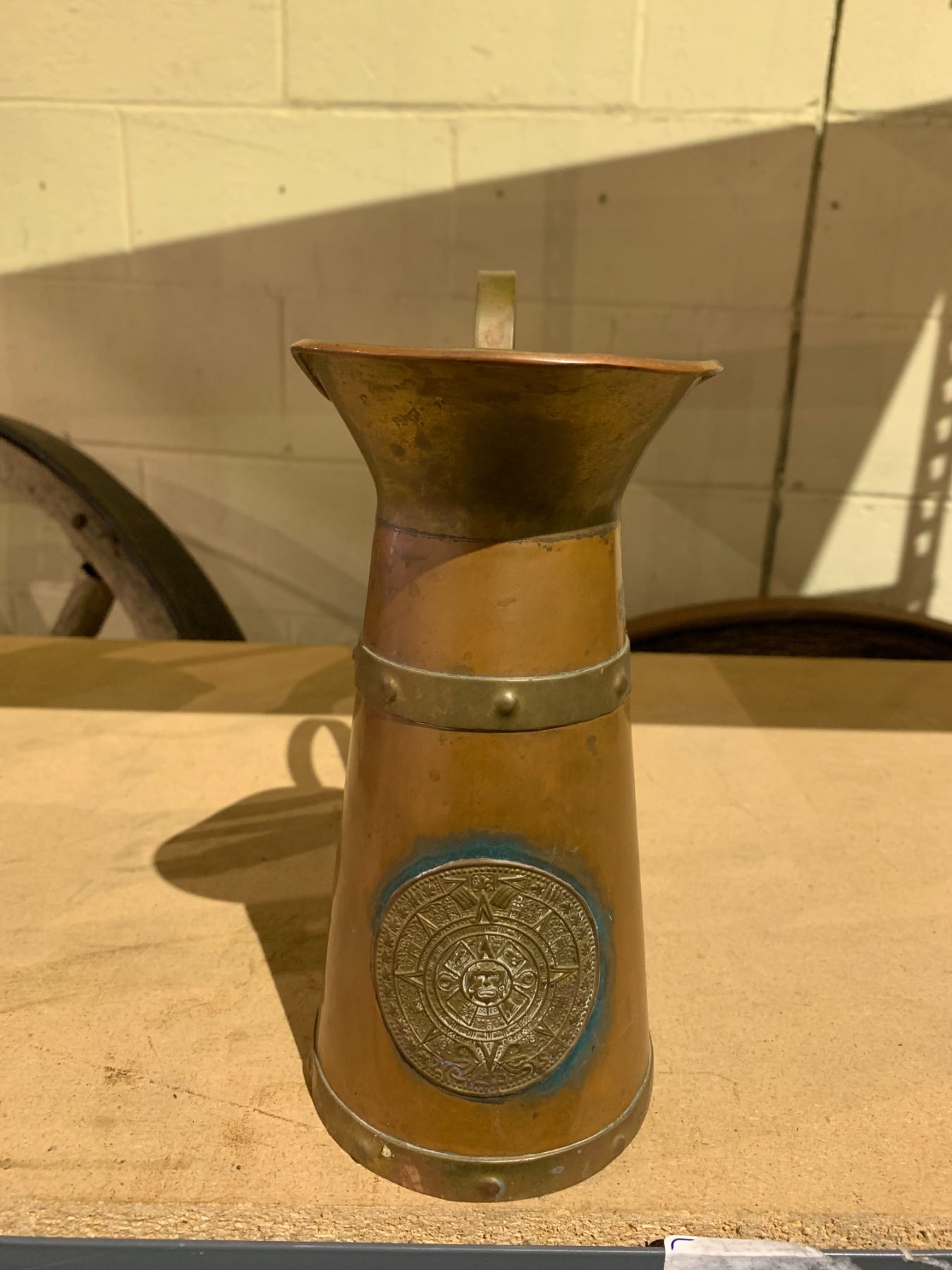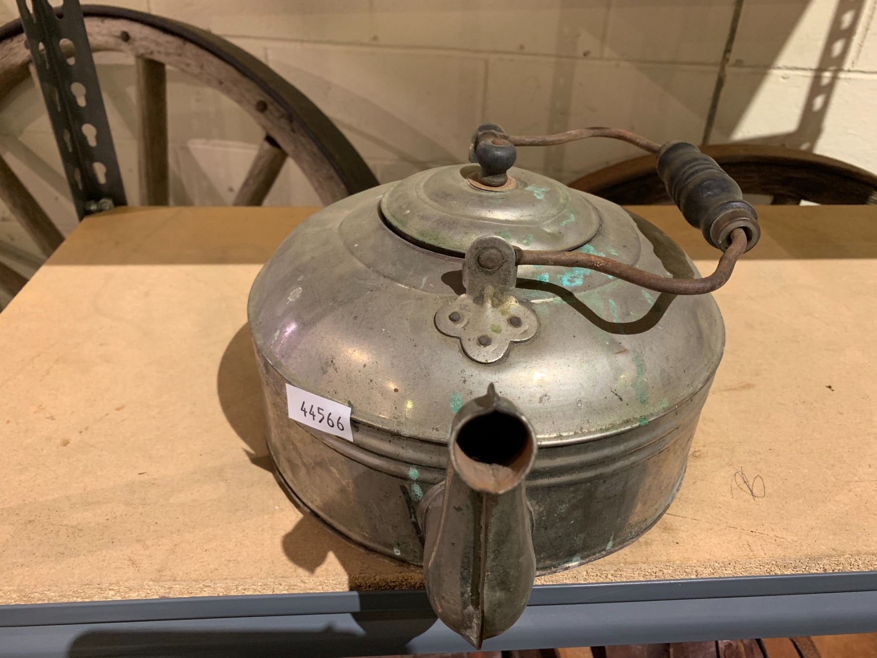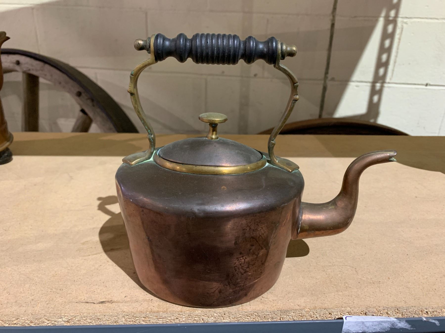 ASSORTED ANTIQUES INCLUDING; BRASS MUGS, LARGE TEAPOT, BELL & MORE