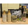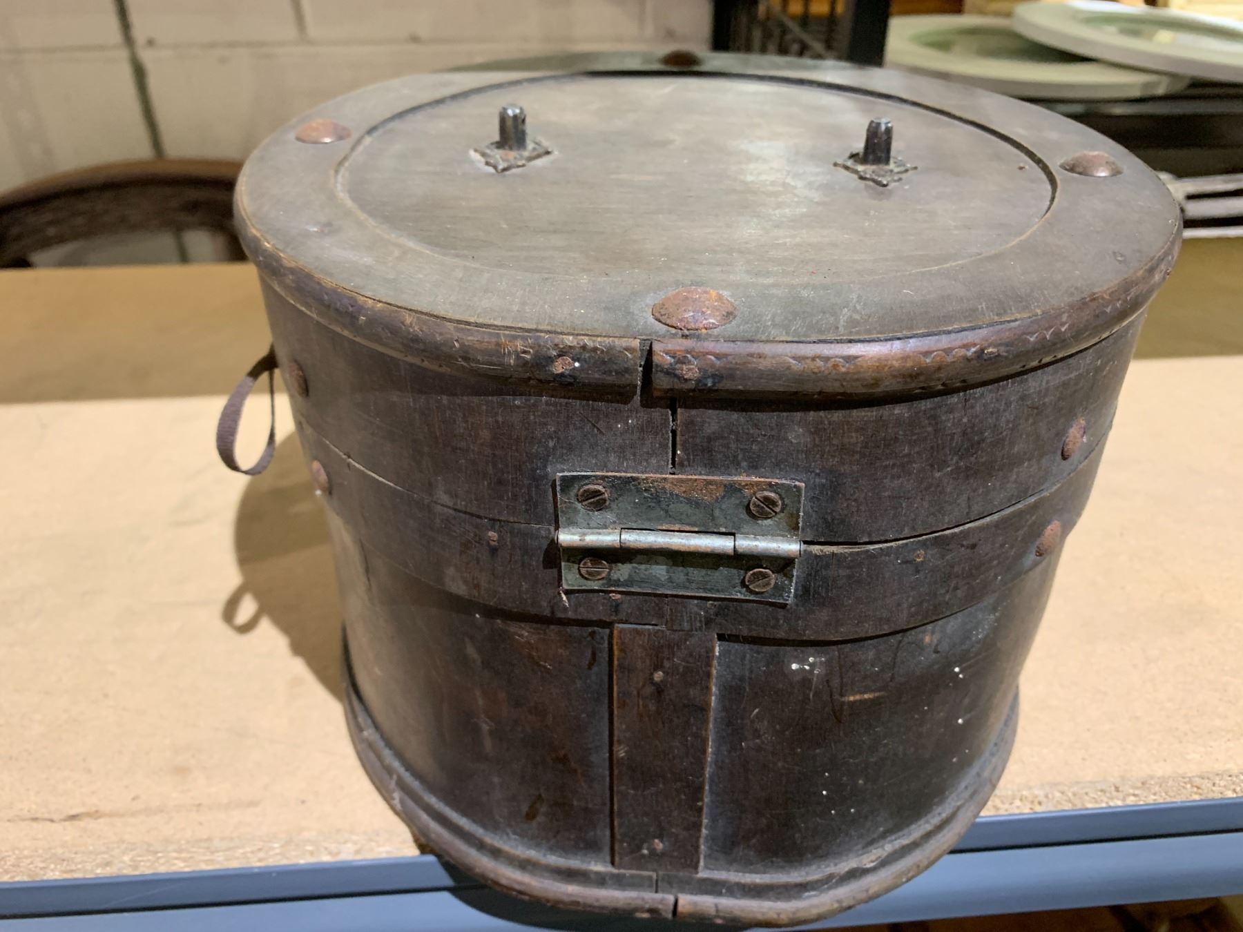 ASSORTED ANTIQUES INCLUDING; CAMERA FLASH, HAT BOX, HORSE SHOES & MORE