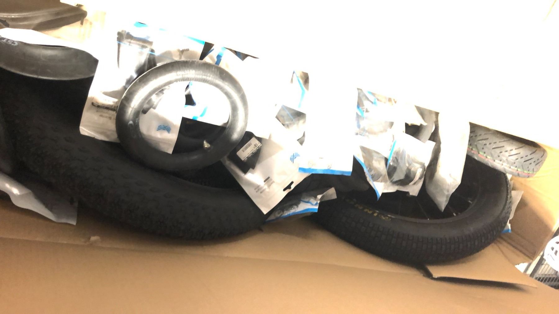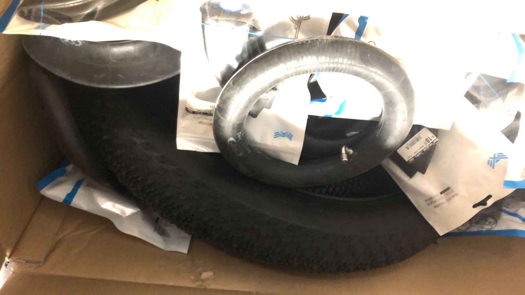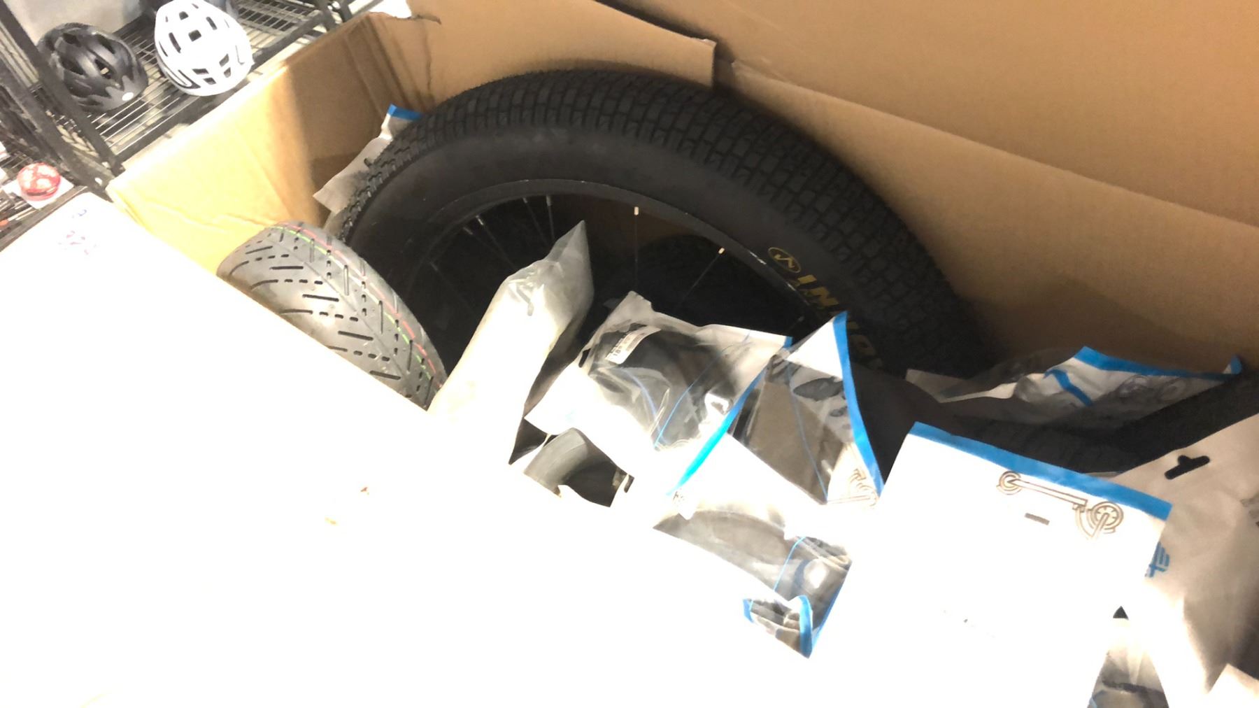 ASSORTED BIKE PARTS INCL BICYCLE WHEEL, TIRE, SCOOTER TUBES AND MORE