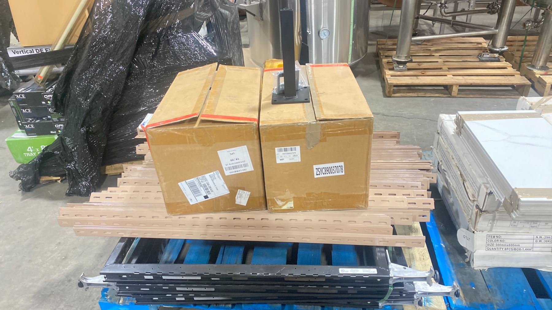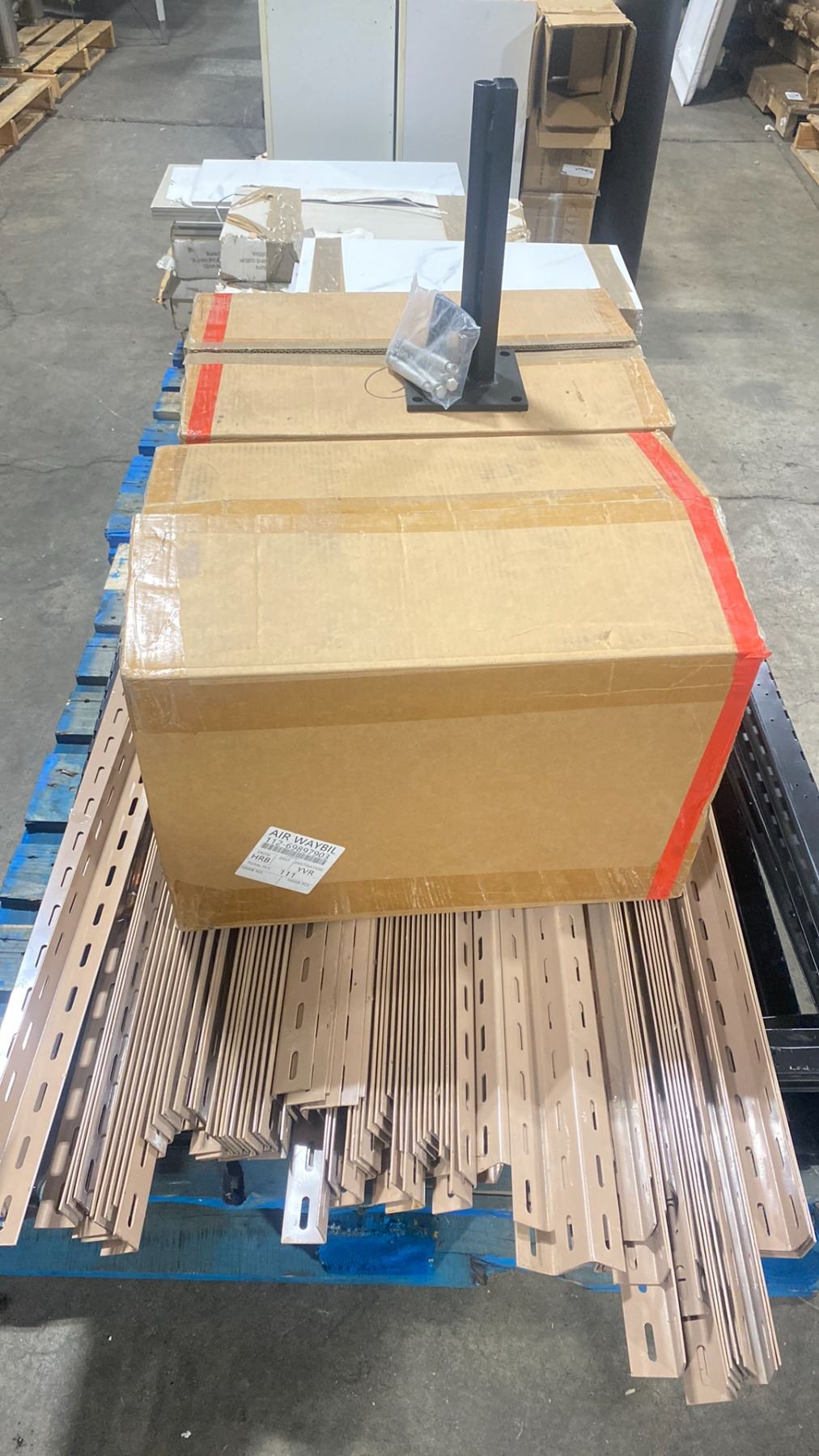ASSORTED BROWN METAL RACKING PARTS, BLACK METAL FRAMES & 2 BOXES OF BLACK METAL MOUNTING FEET