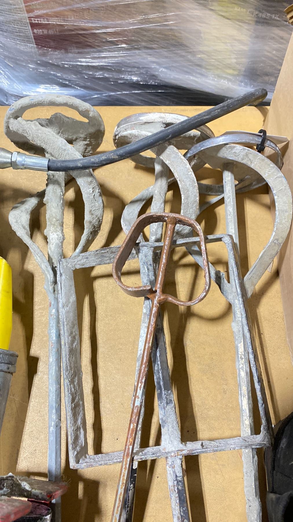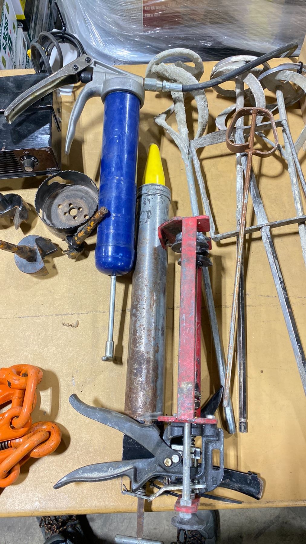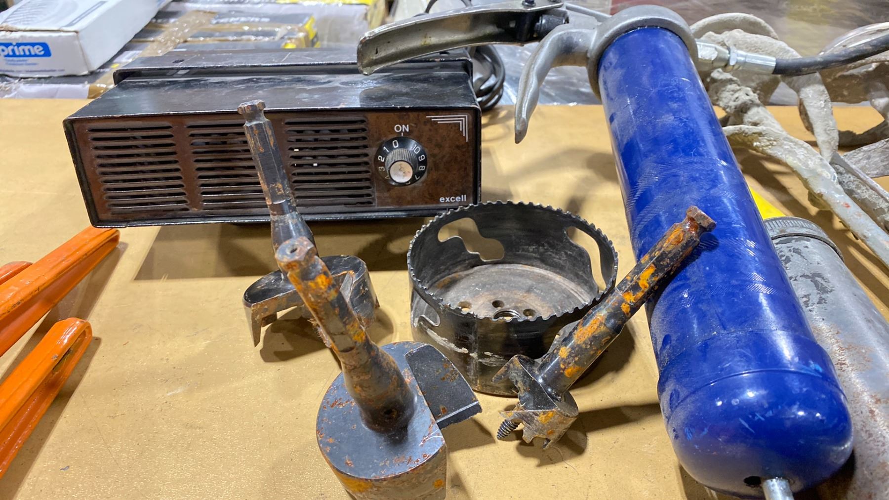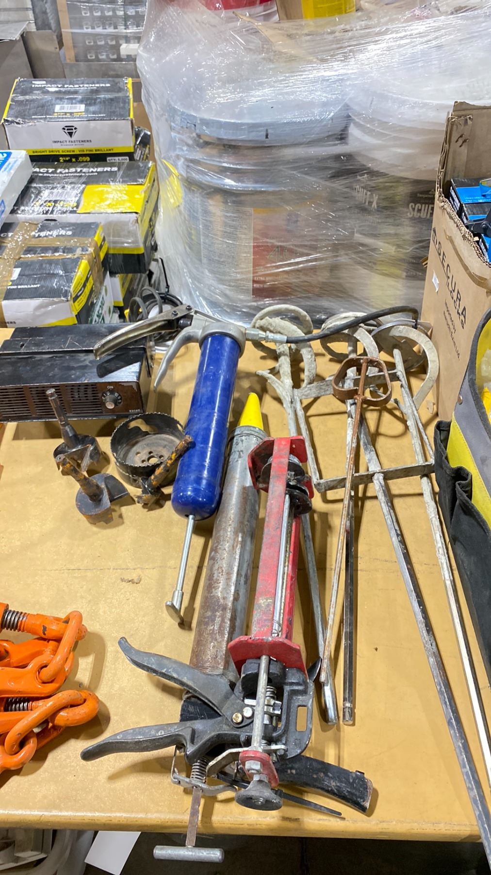 ASSORTED CALKING GUNS, PAINT MIXING ATTACHMENTS, SMALL ELECTRIC HEATER & DRILL ATTACHMENTS