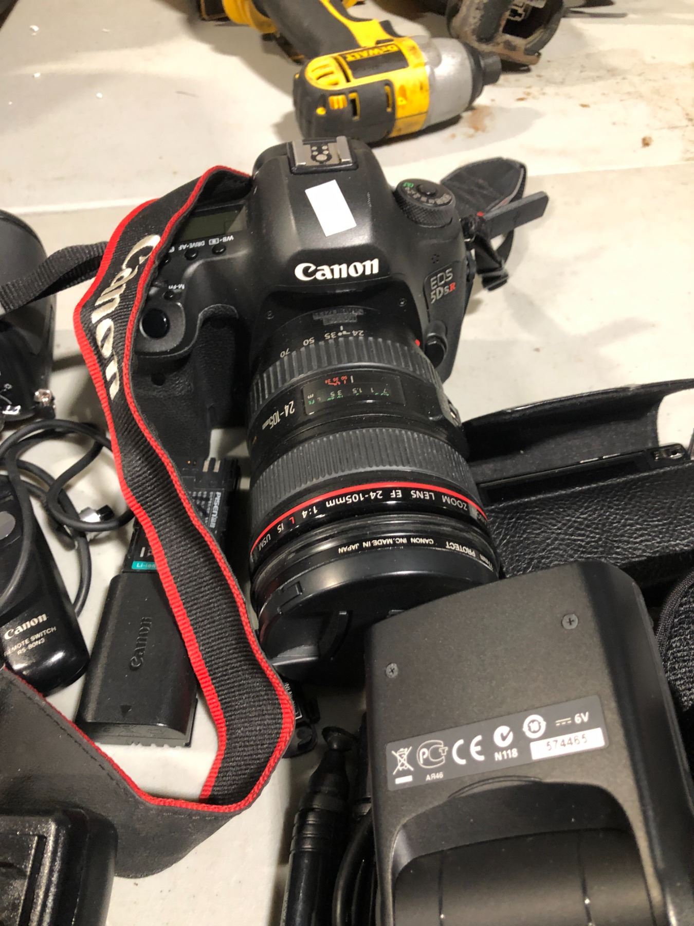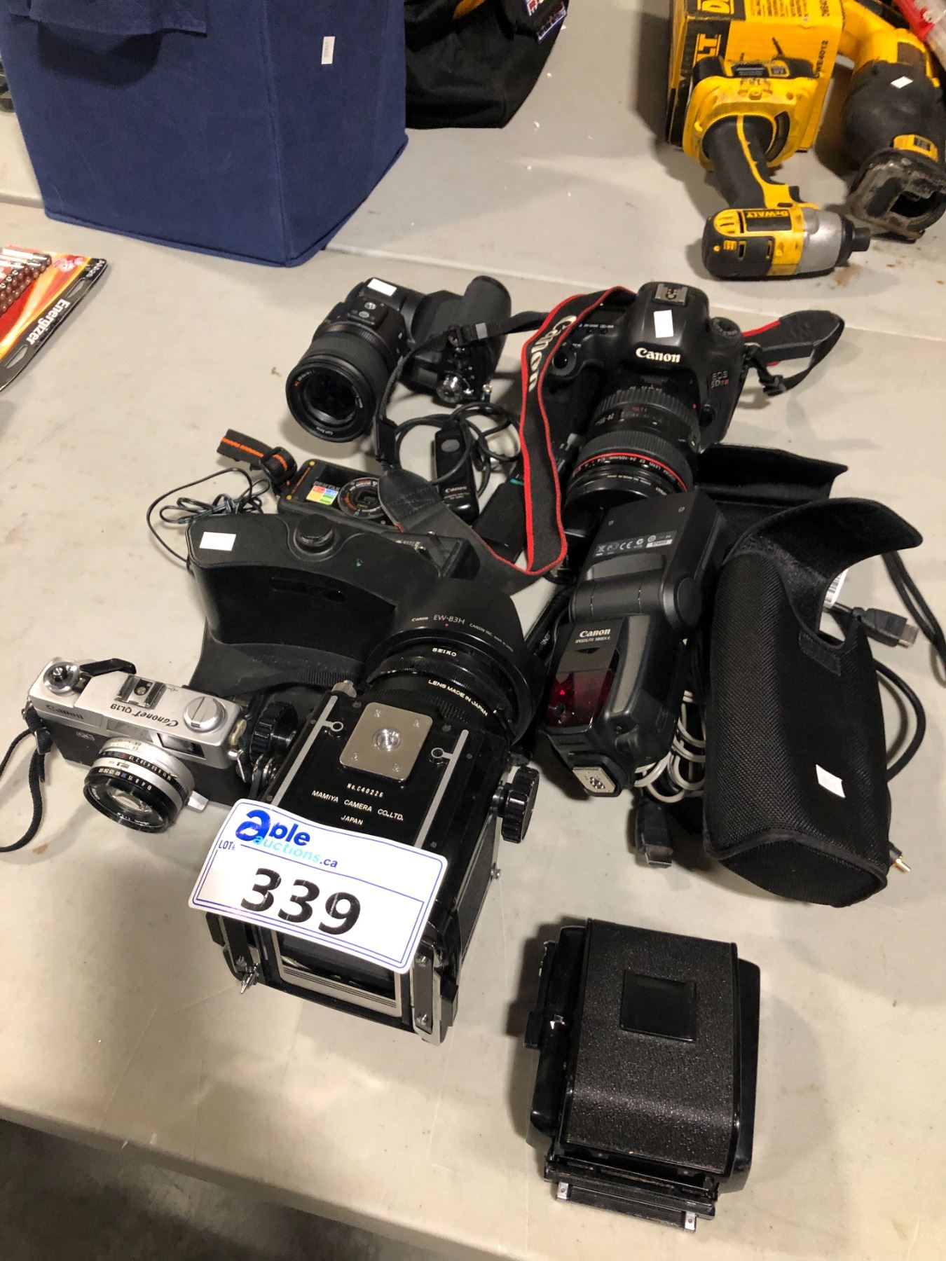 ASSORTED CAMERAS WITHOUT CHARGERS INCLUDING A MAMIYA RB67 CAMERA AND A CANON EOS5DSR CAMERA