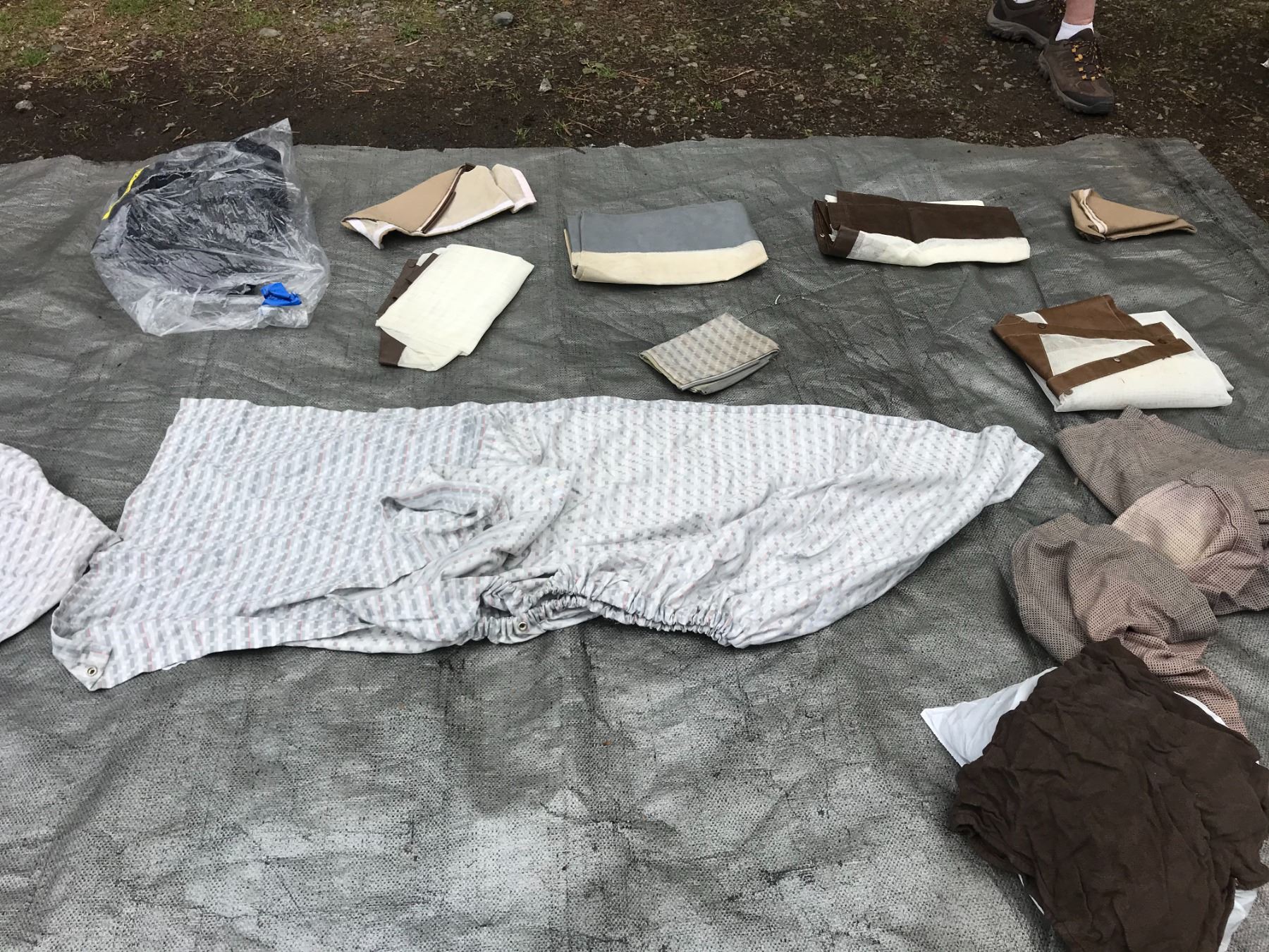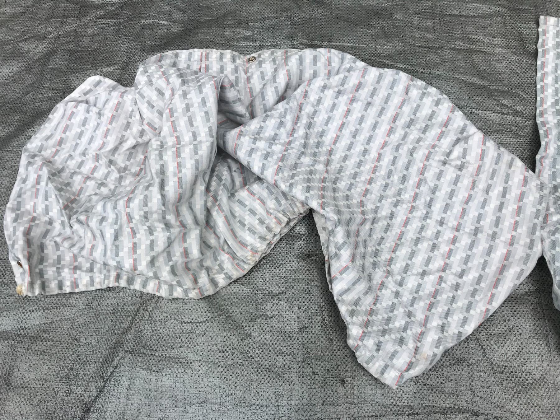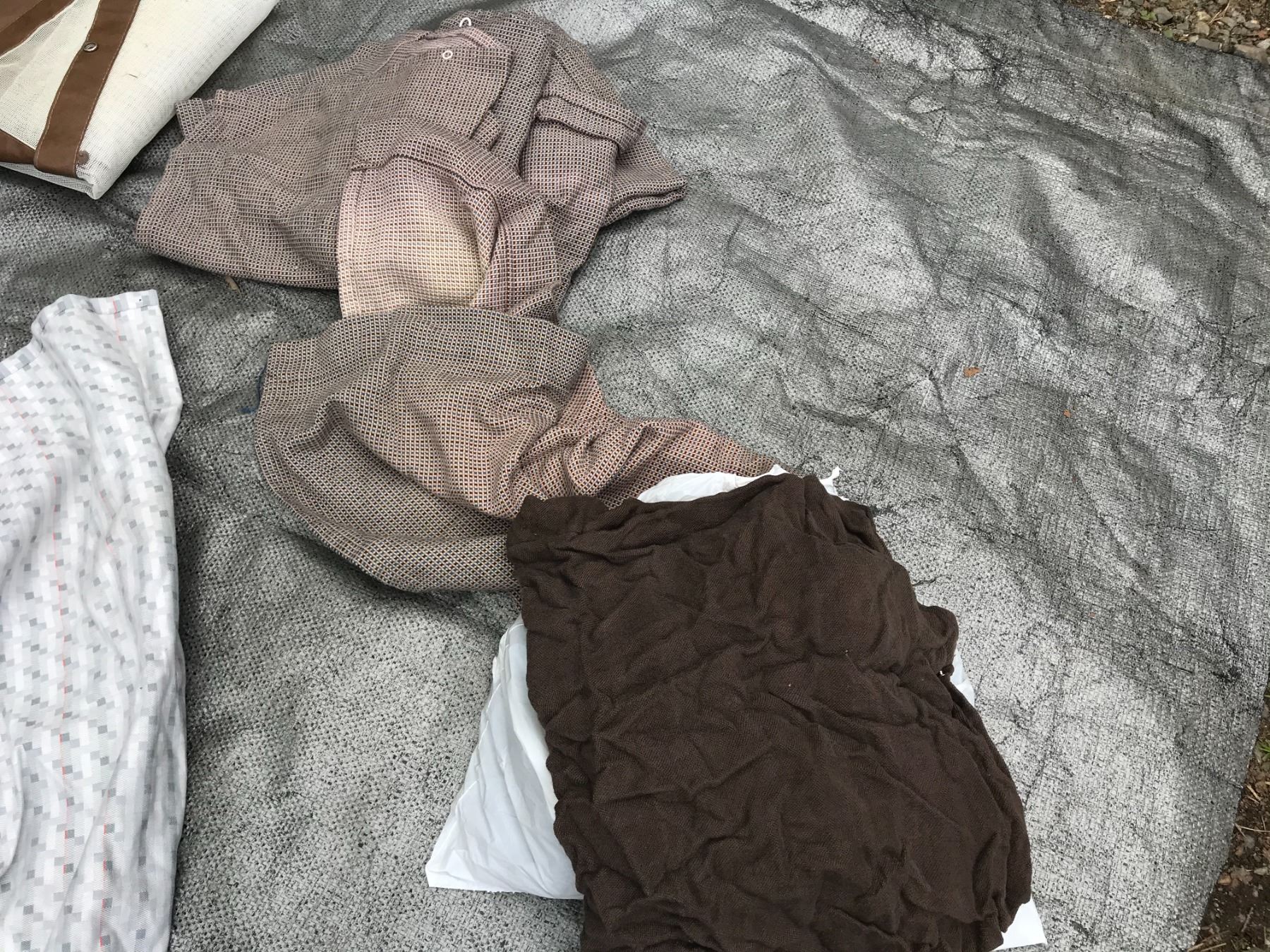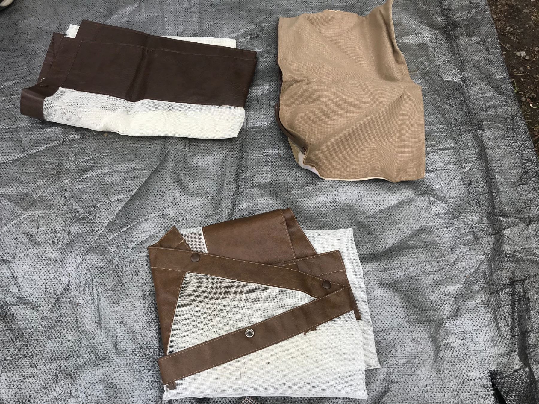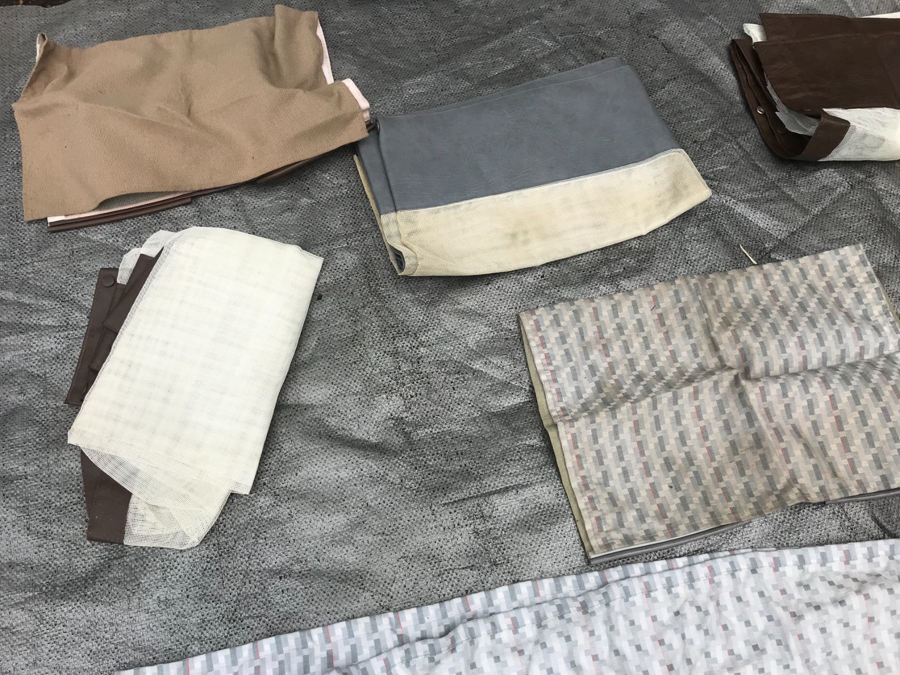 ASSORTED CAMPER CURTAINS (INCLUDES LATE MODEL WRAP AROUND CURTAIN, EARLY MODEL BLUE & BROWN STRIP CURTAINS), REAR HATCH FLY SCREEN & VLECRO *NANAIMO*