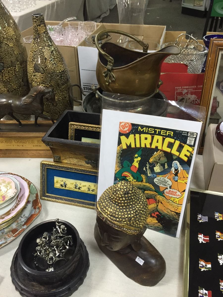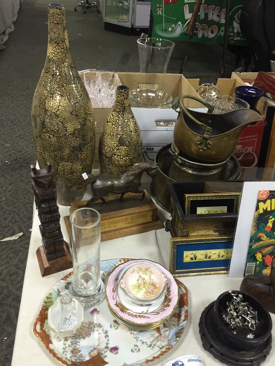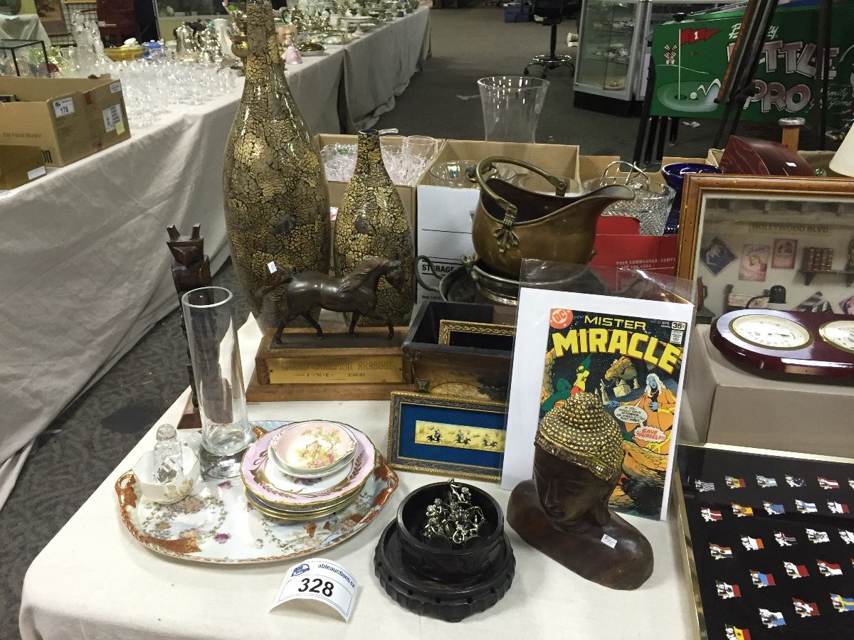 ASSORTED COLLECTABLES INCL. BRASS HORSE, SMALL TOTEM, VASES, PORCEALIN, PIN COLLECTION AND MORE!